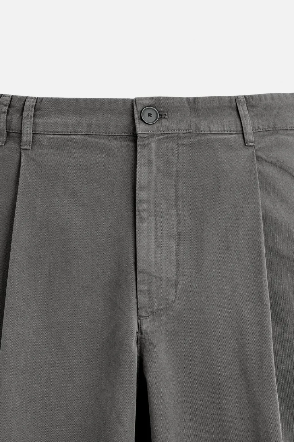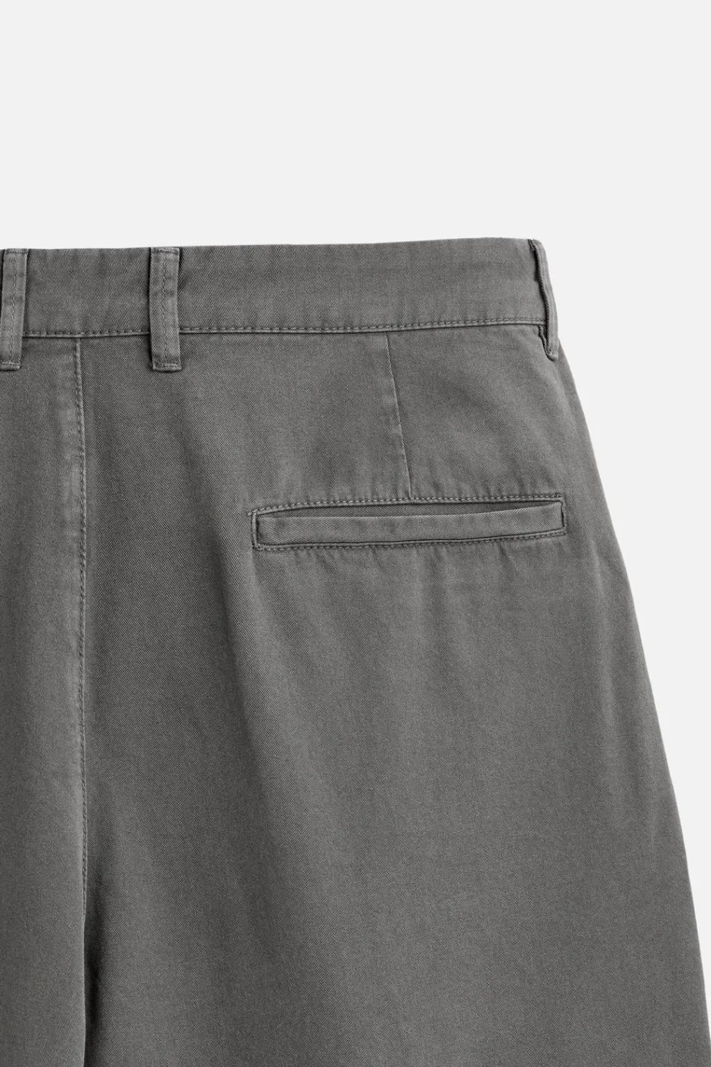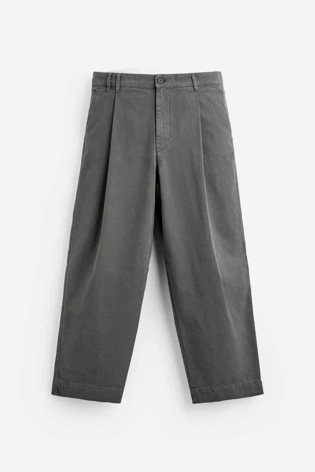 Pantalón wide fit confeccionado en tejido de algodón con estructura twill. Cintura con detalle de pliegues frontales. Bolsillos en delantero y detalle de bolsillos traseros de vivo. Efecto lavado. Cierre frontal con cremallera y botón.