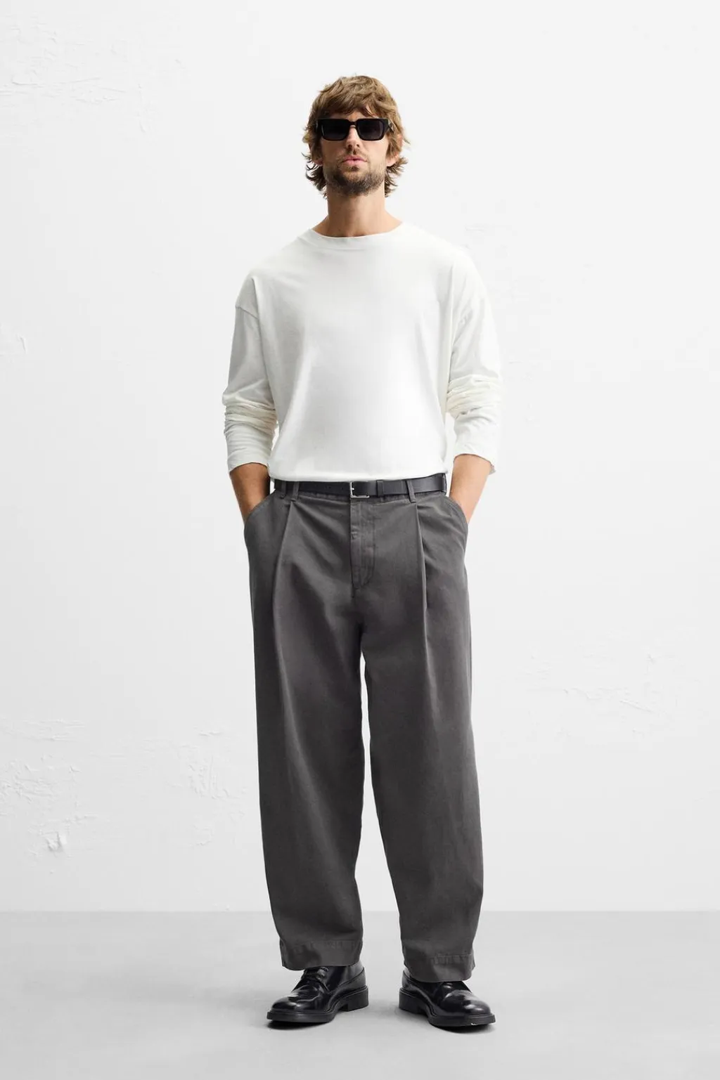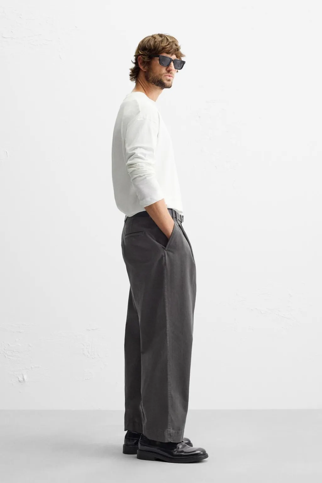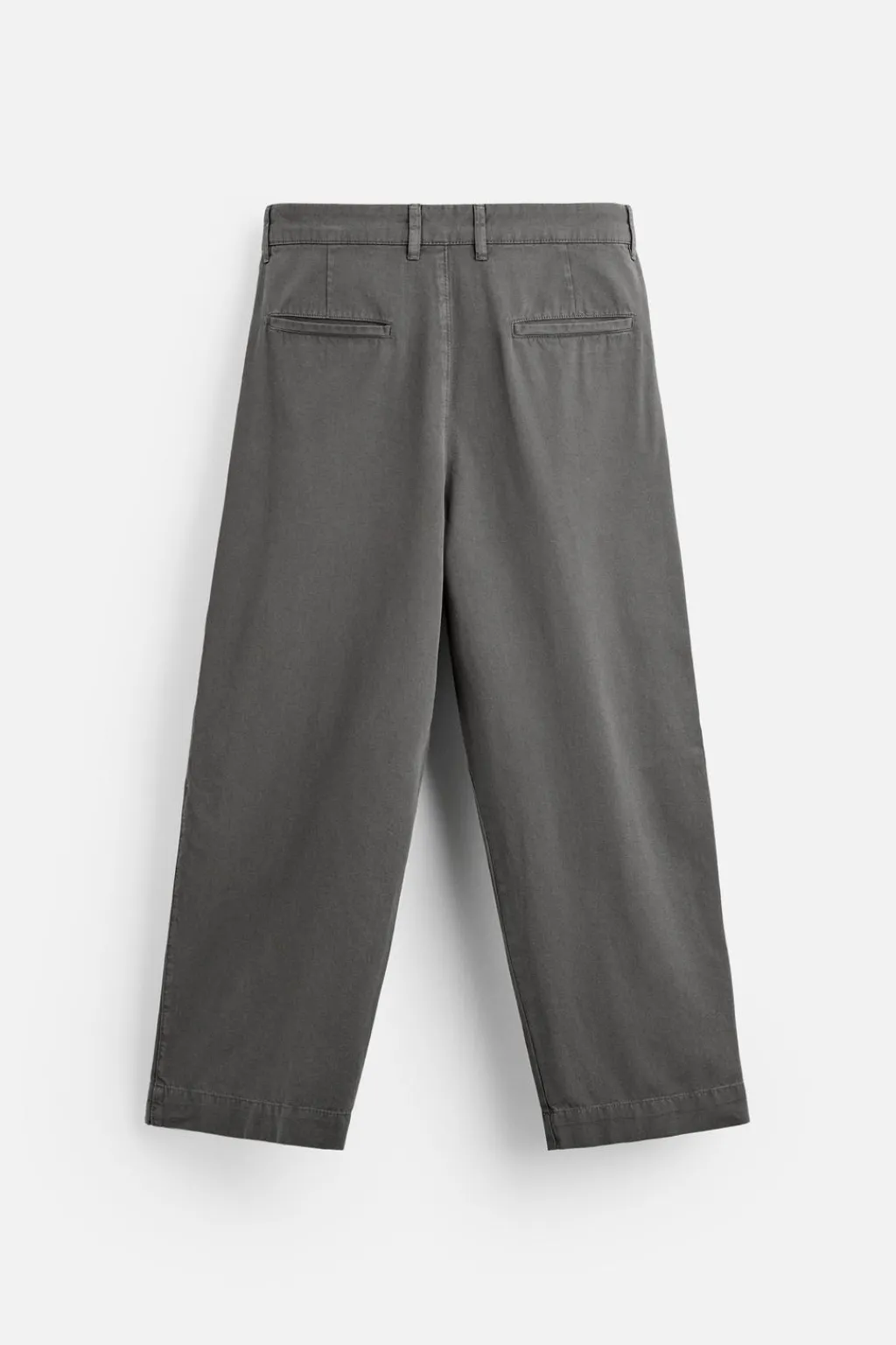 Pantalón wide fit confeccionado en tejido de algodón con estructura twill. Cintura con detalle de pliegues frontales. Bolsillos en delantero y detalle de bolsillos traseros de vivo. Efecto lavado. Cierre frontal con cremallera y botón.
