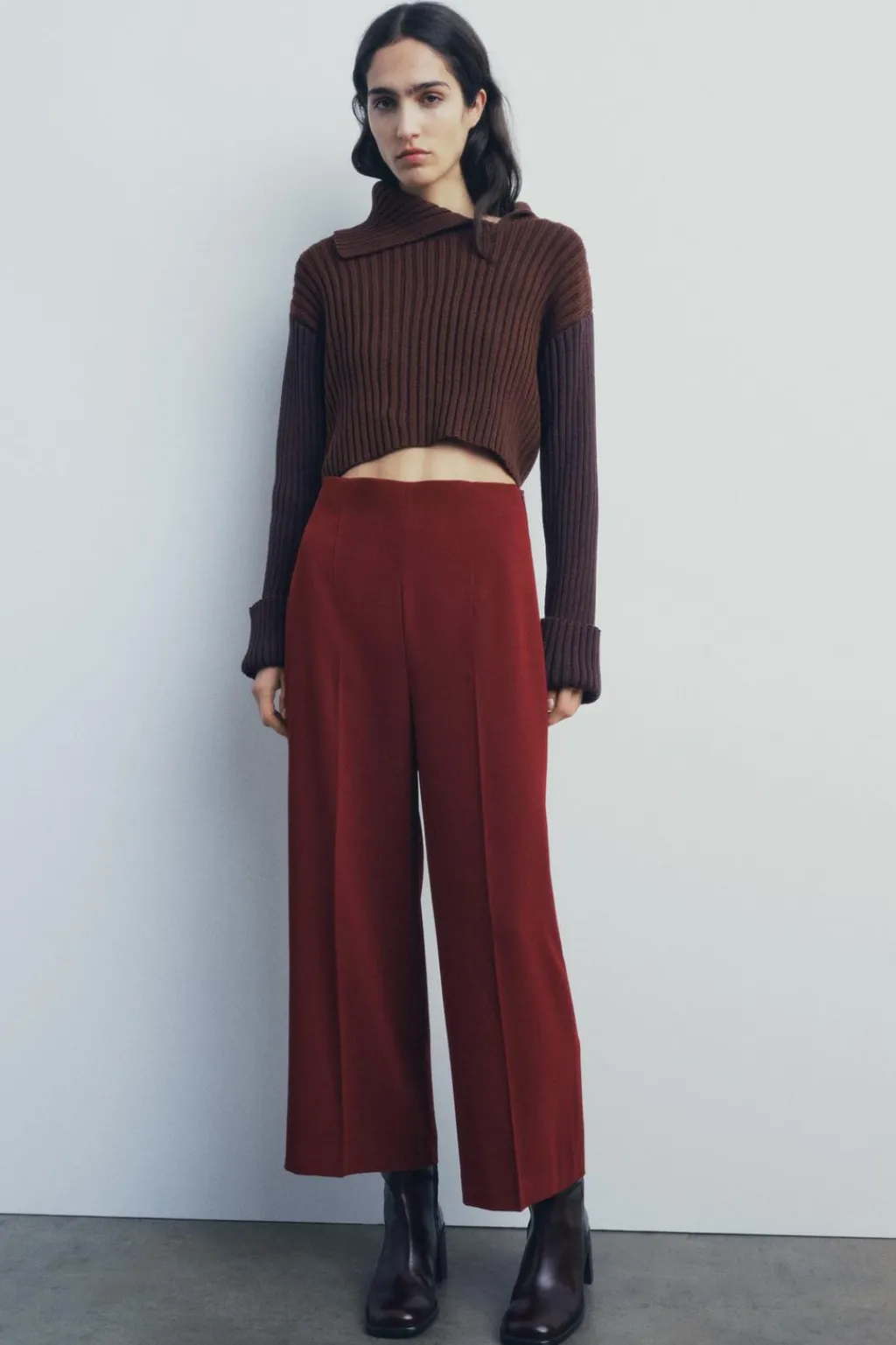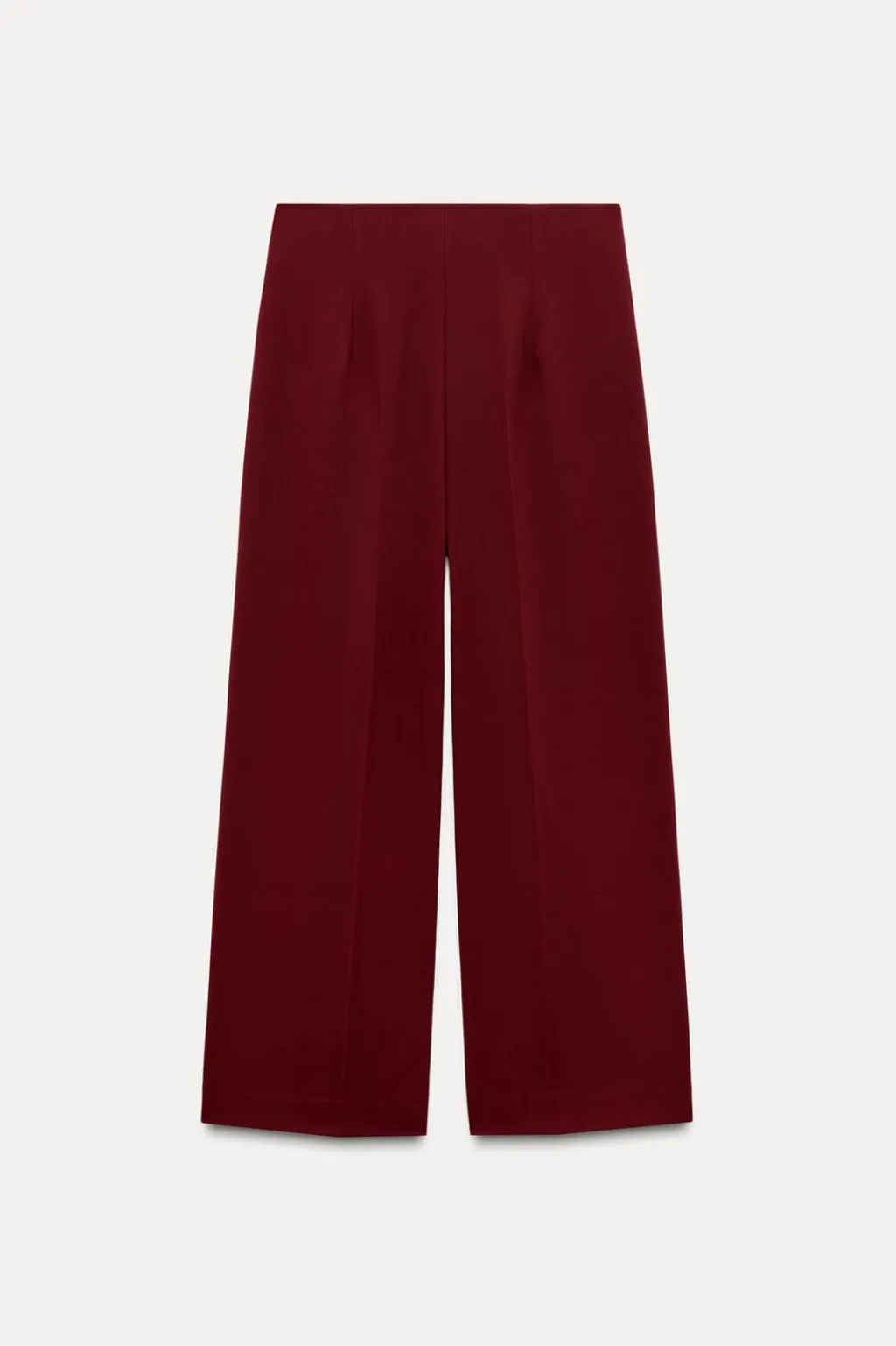 Pantalón tipo culotte de tiro alto con pierna ancha. Cierre lateral con cremallera oculta en costura.