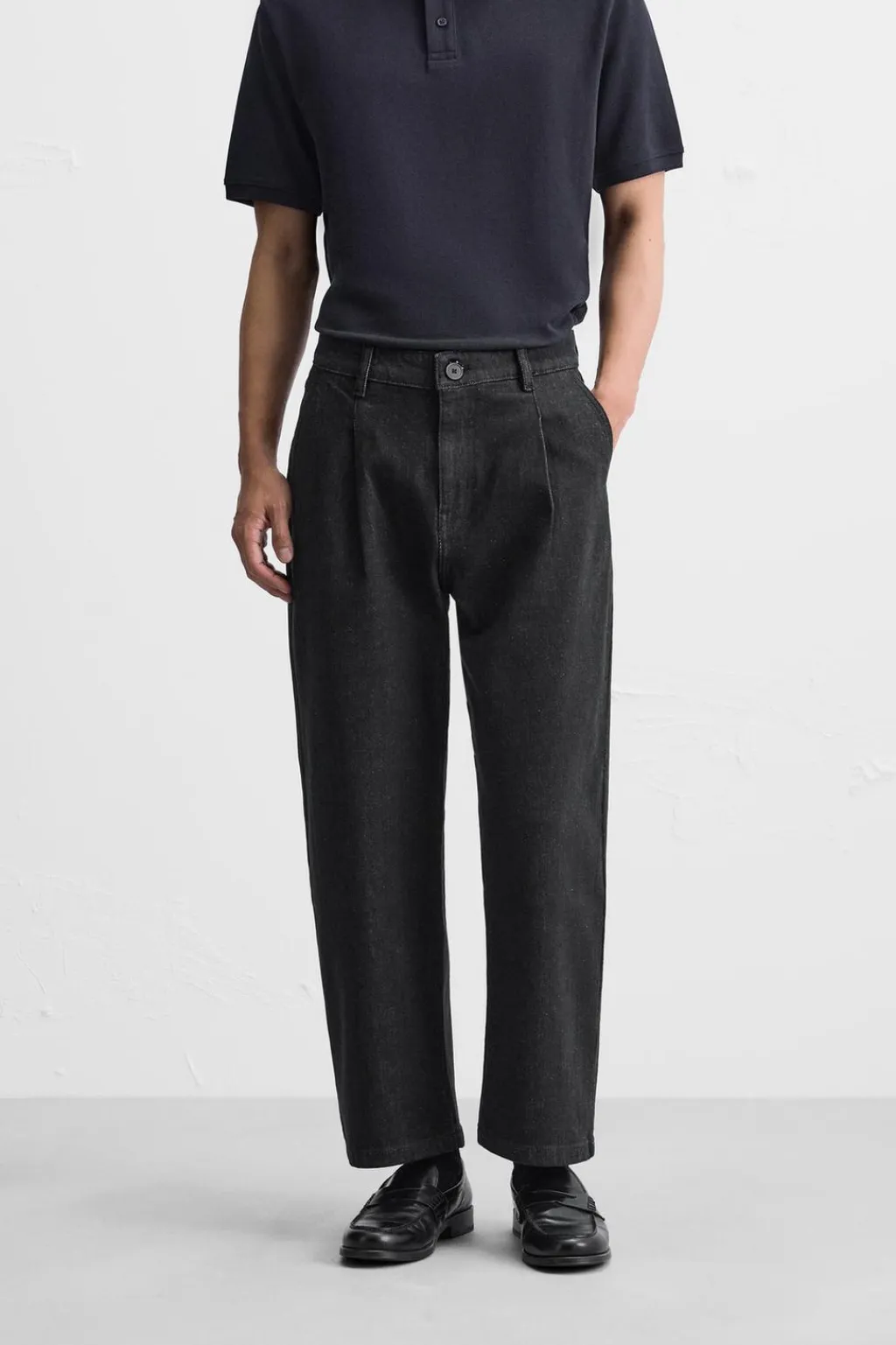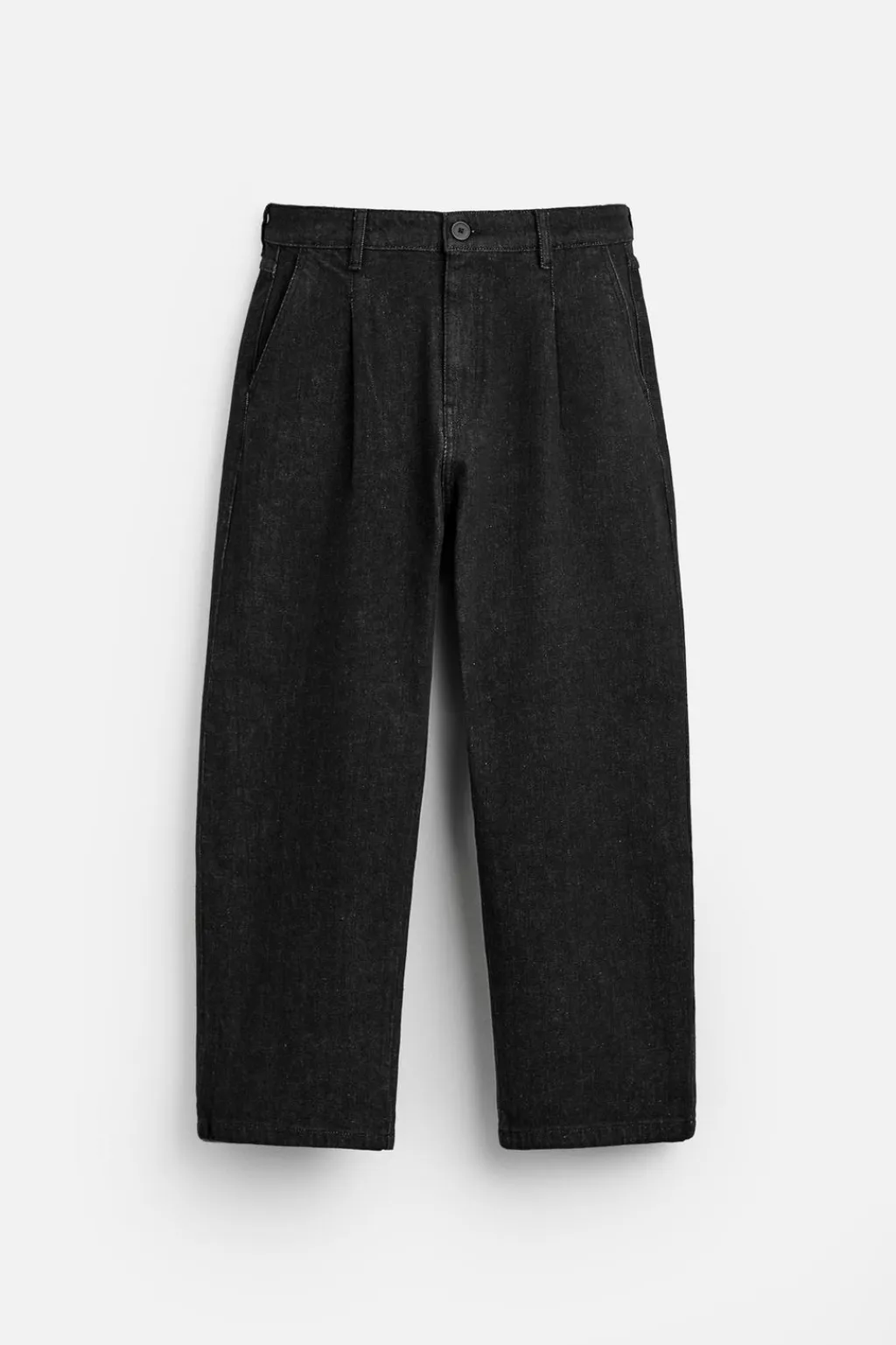 Pantalón relaxed ankle fit confeccionado en denim de algodón. Cintura con detalle de pliegues frontales. Bolsillos en delantero y detalle de bolsillos traseros de plastrón. Cierre frontal con cremallera y botón.