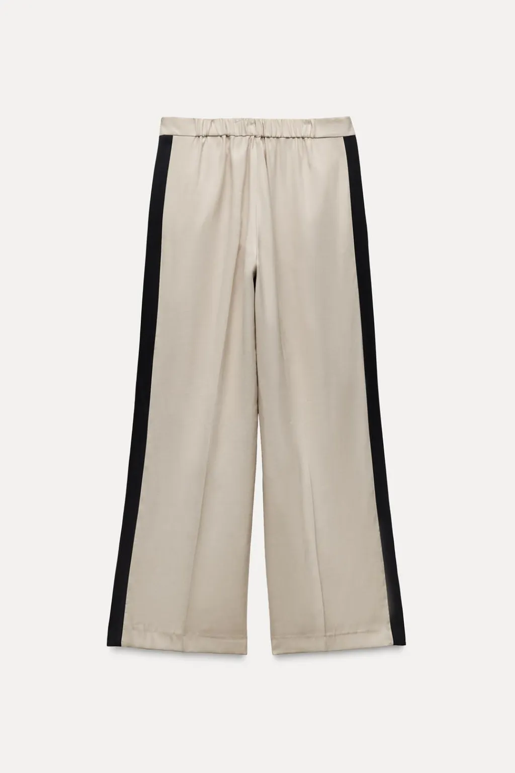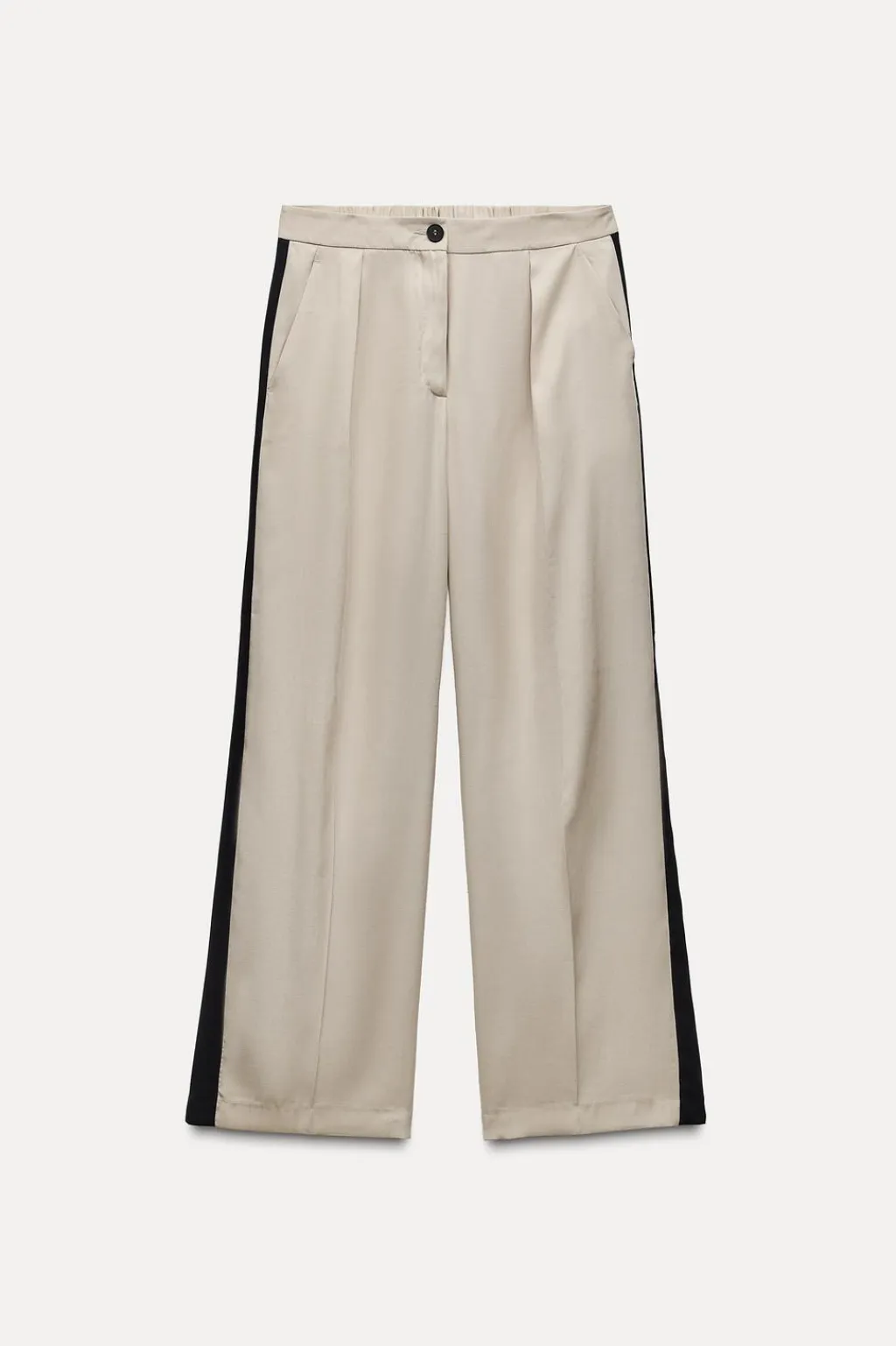 Pantalón de tiro alto con elástico en cintura. Bolsillos laterales. Pinzas en delantero. Detalle de banda lateral combinada a contraste. Pernera ancha. Cierre frontal con cremallera y botón.