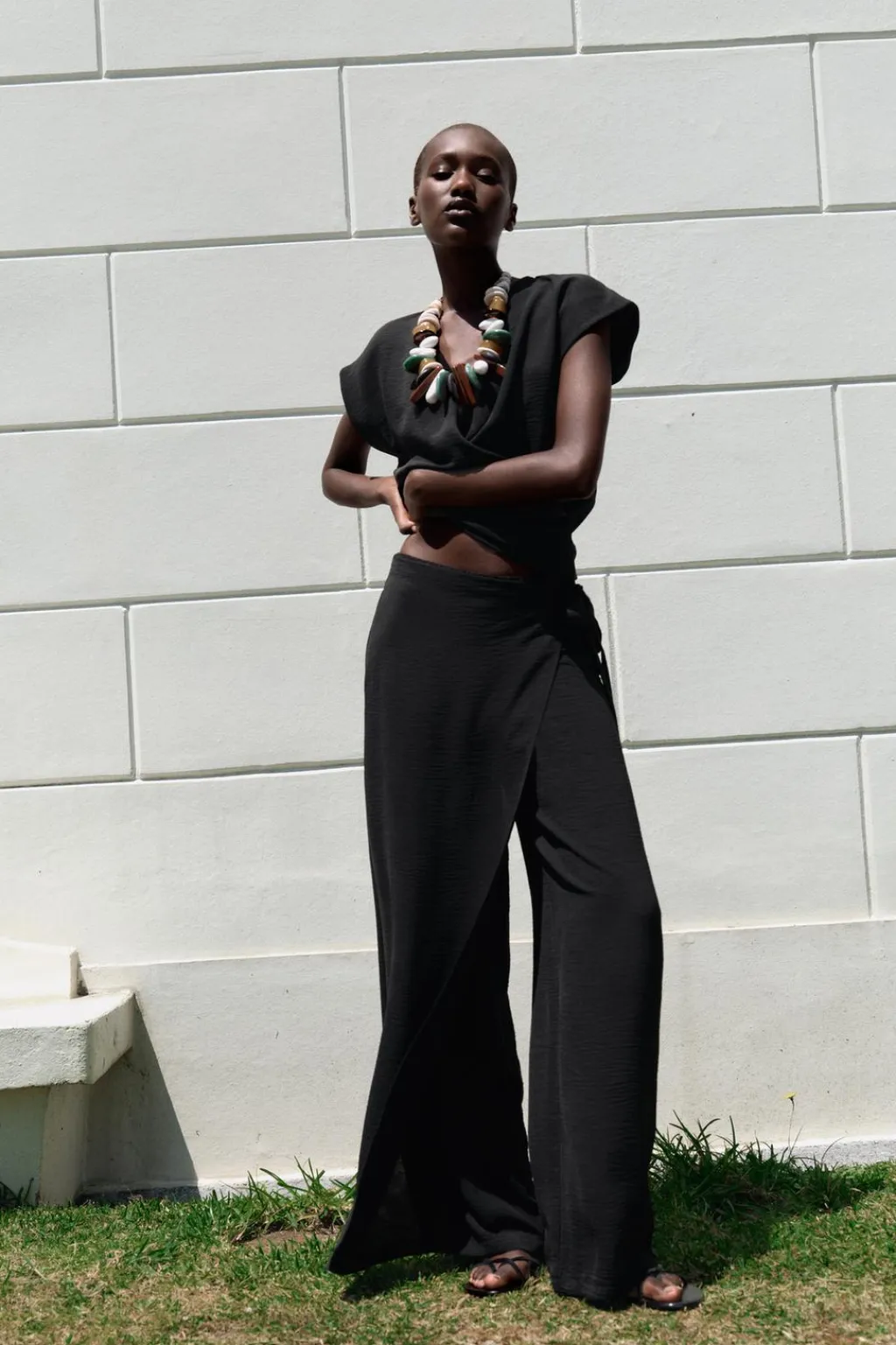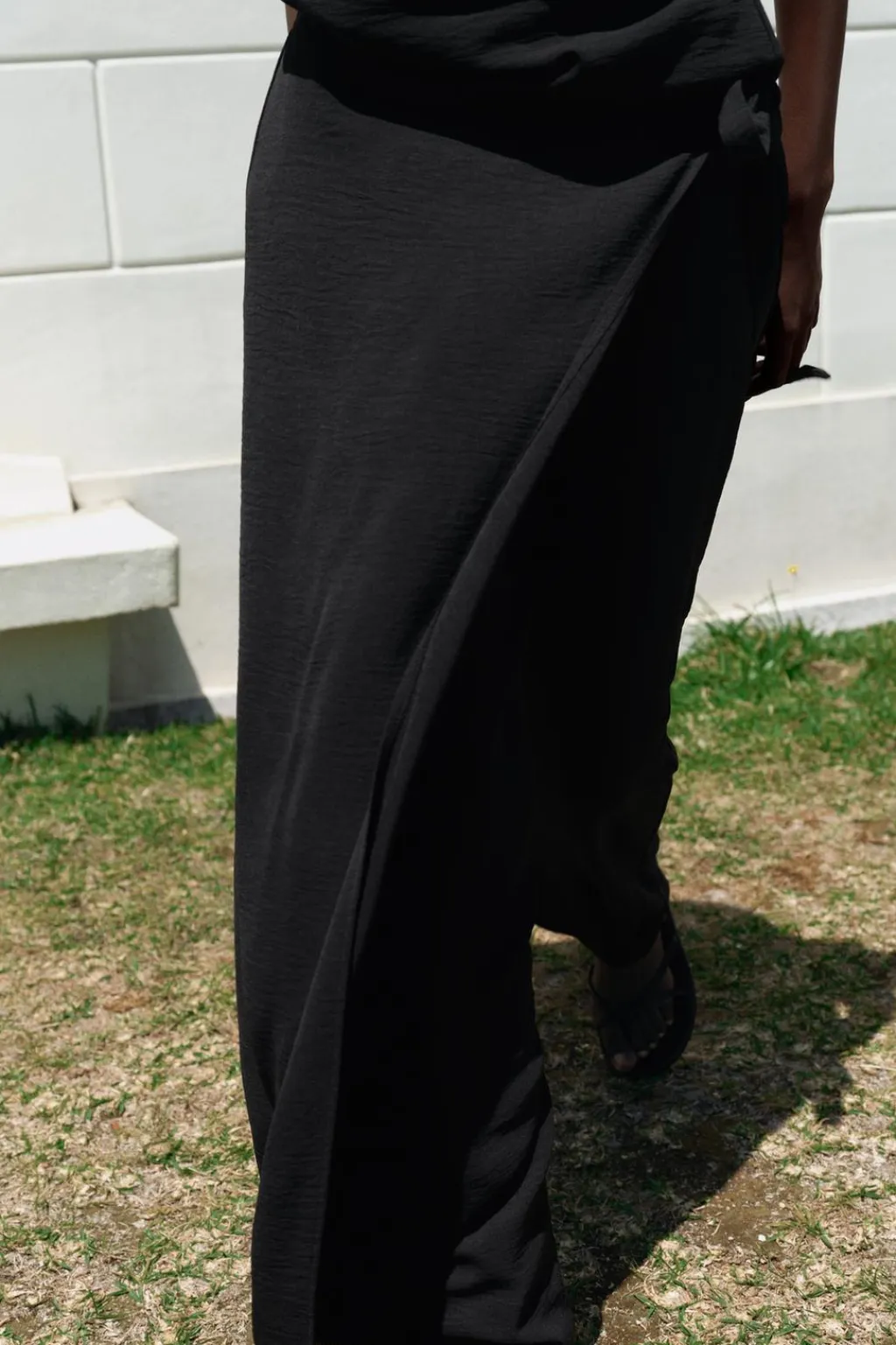 Pantalón fluido de tiro medio y cintura con elástico. Detalle de superposición en mismo tejido tipo pareo ajustable con lazadas. Pierna ancha.