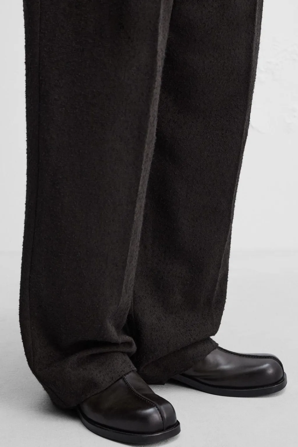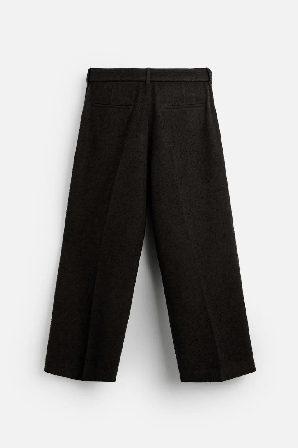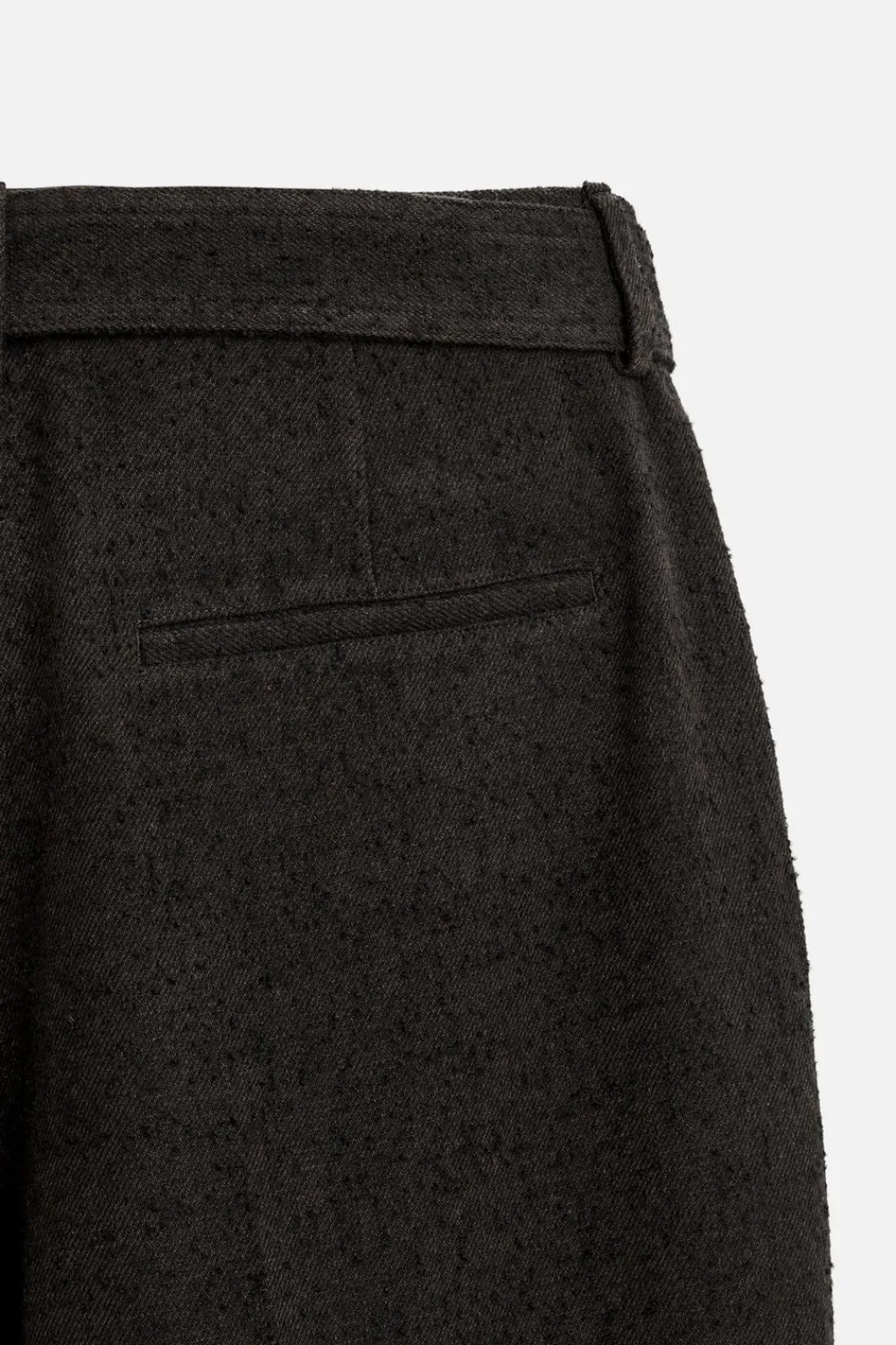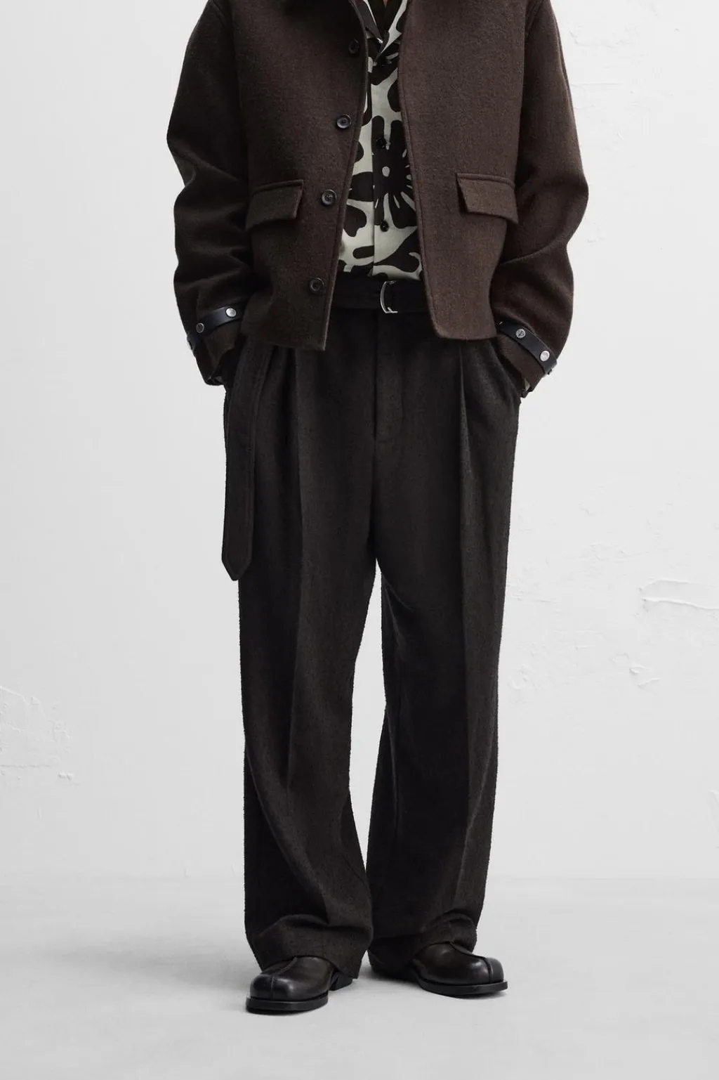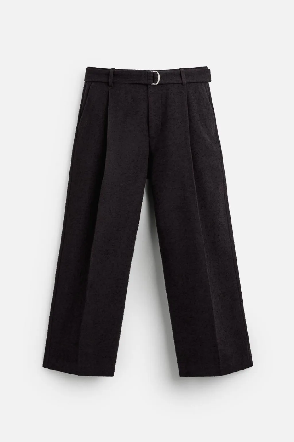 Pantalón relaxed fit confeccionado en tejido con textura bouclé. Cintura ajustable con cinturón del mismo tejido y detalle de pliegues frontales. Bolsillos delanteros y detalle de bolsillos traseros de vivo. Cierre frontal con cremallera y botón.