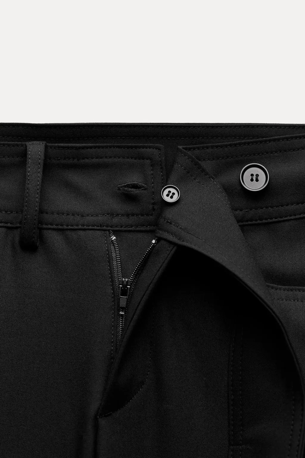 Pantalón de tiro medio con bolsillos laterales. Bajo acabado en vuelta. Cierre frontal con cremallera botón interior y tira con botón ajustable.