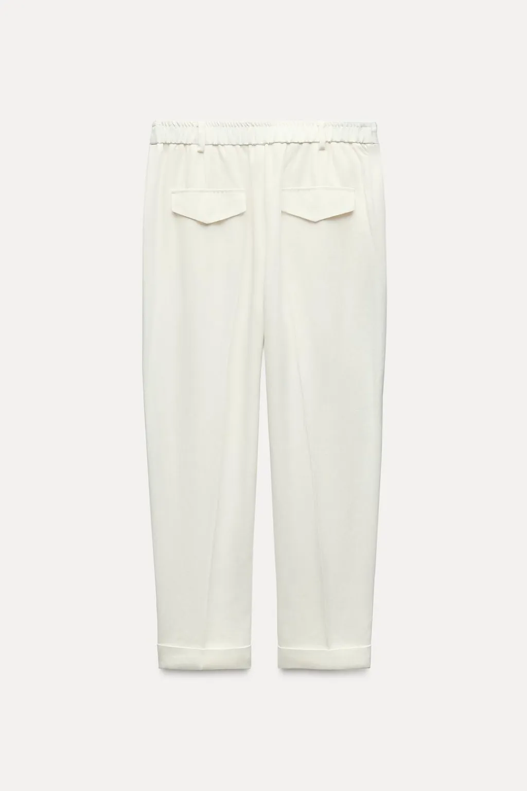 Pantalón de tiro alto con pinzas delanteras y cintura elástica en espalda. Bolsillos delanteros y falsos bolsillos con solapa en espalda. Pernera recta acabada en vuelta. Cierre frontal con cremallera, botón interior y gancho.