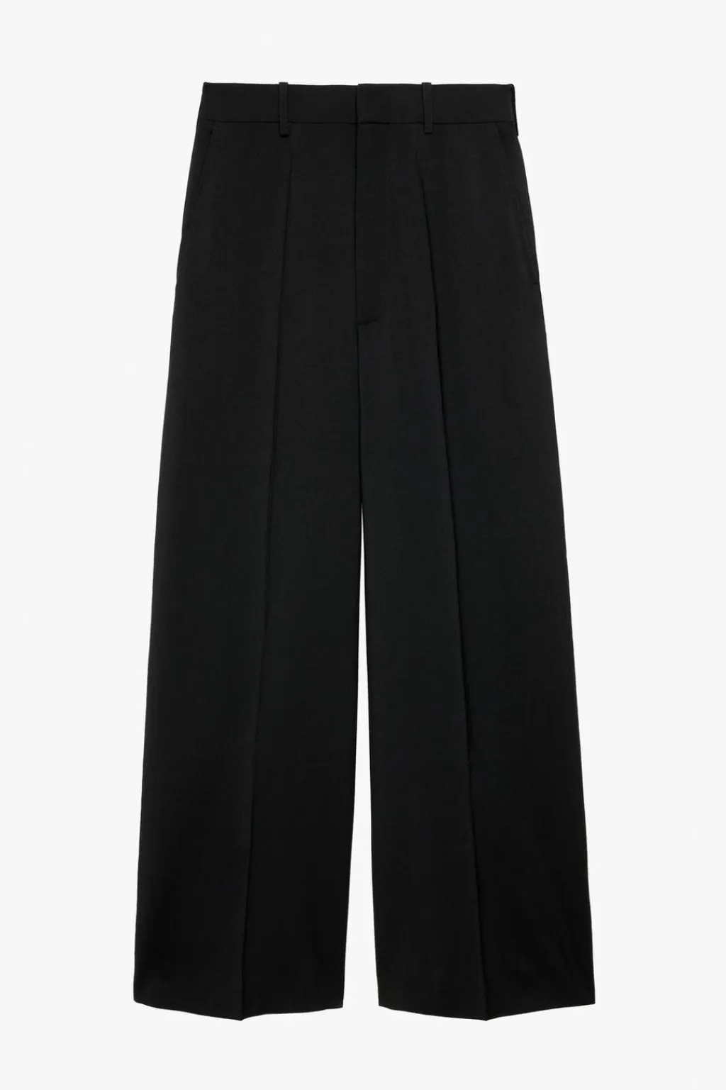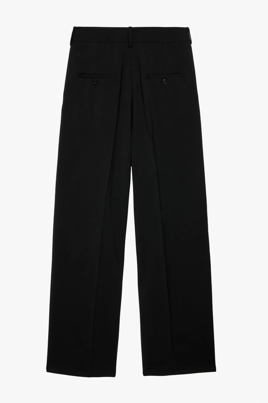 Pantalón wide fit confeccionado en tejido de lana y viscosa. Bolsillos frontales y detalle de bolsillos traseros de vivo con botón. Cierre frontal con cremallera y gancho metálico oculto.