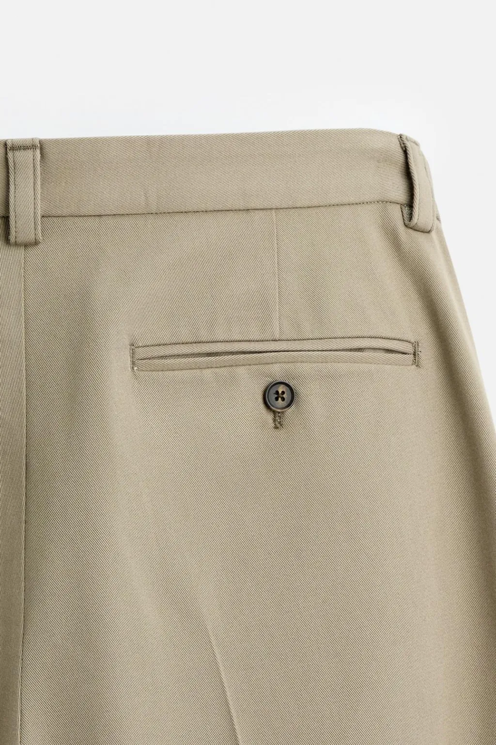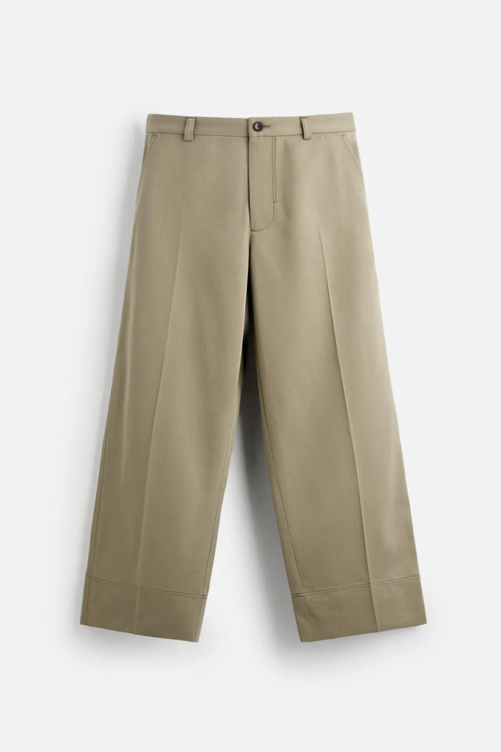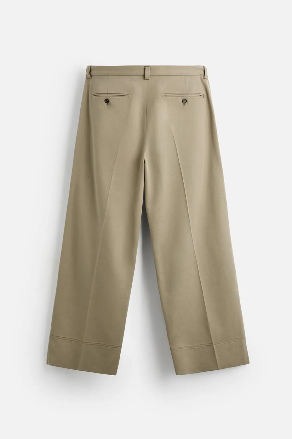 Pantalón wide confeccionado en tejido con mezcla de viscosa y algodón. Bolsillos delanteros y detalle de bolsillos traseros de vivo. Cierre frontal con cremallera y botón.