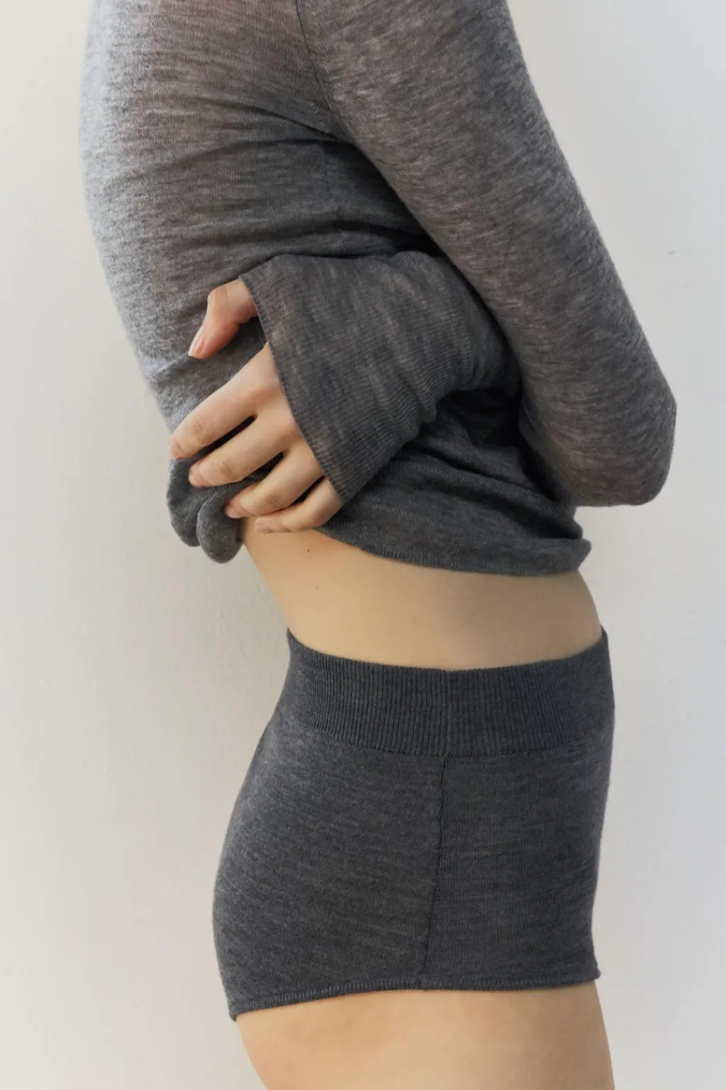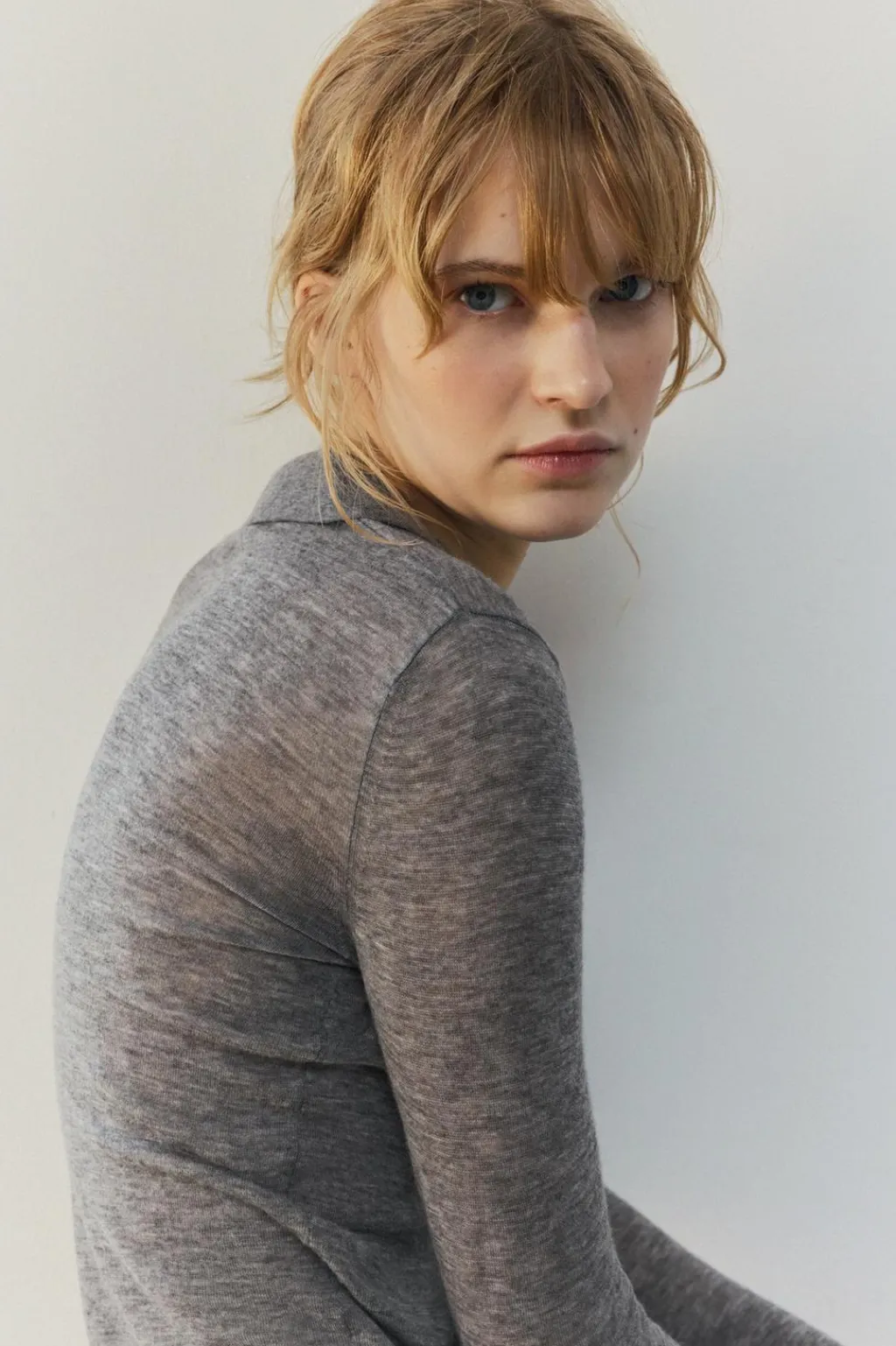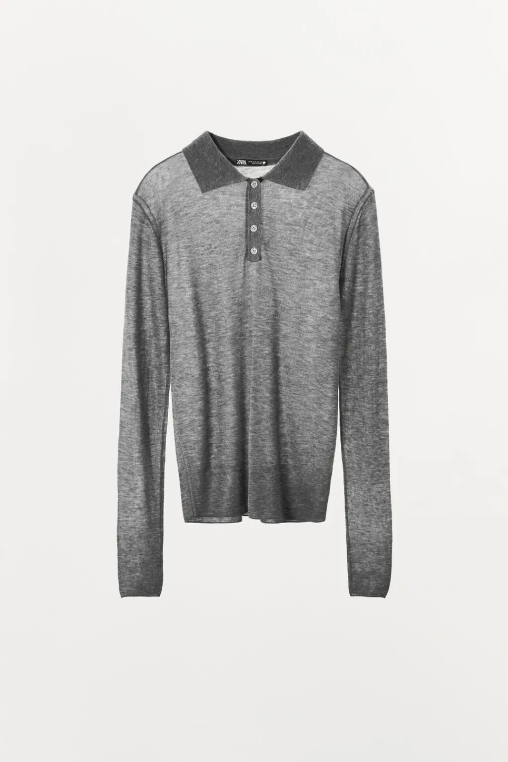 Polo semitransparente confeccionado en hilatura de lana 100%. Cuello solapa y manga larga. Cierre frontal con botones.