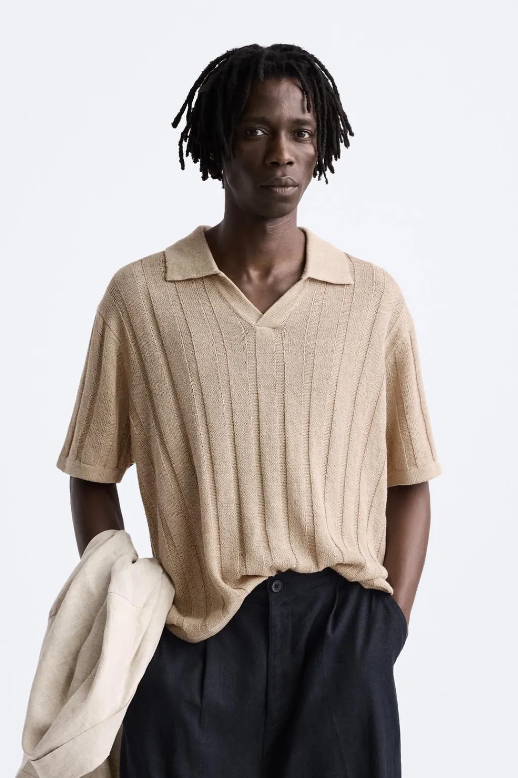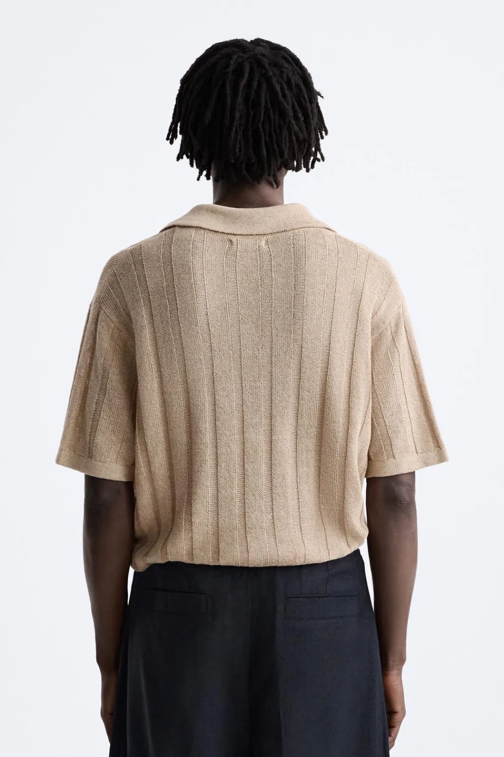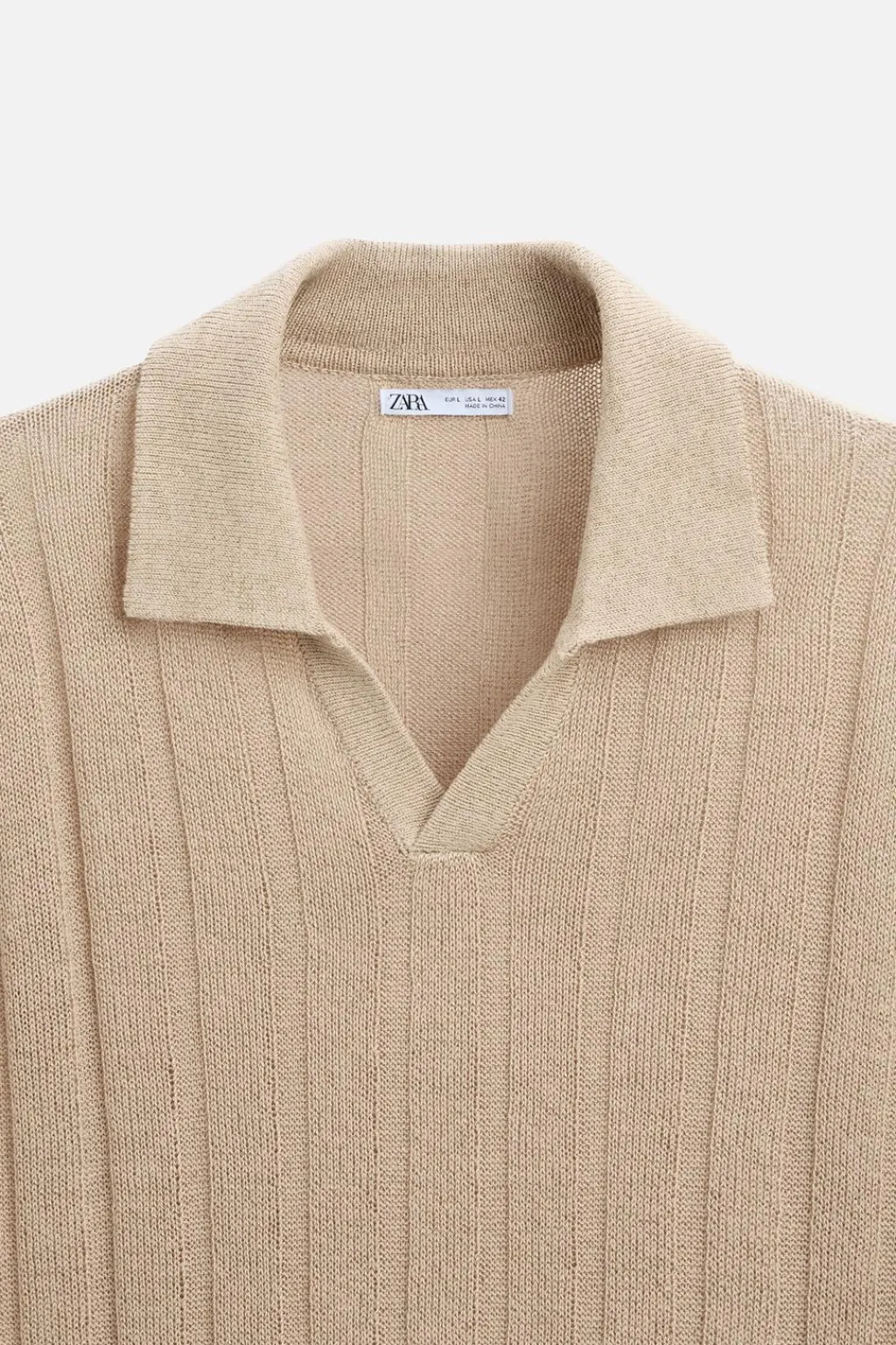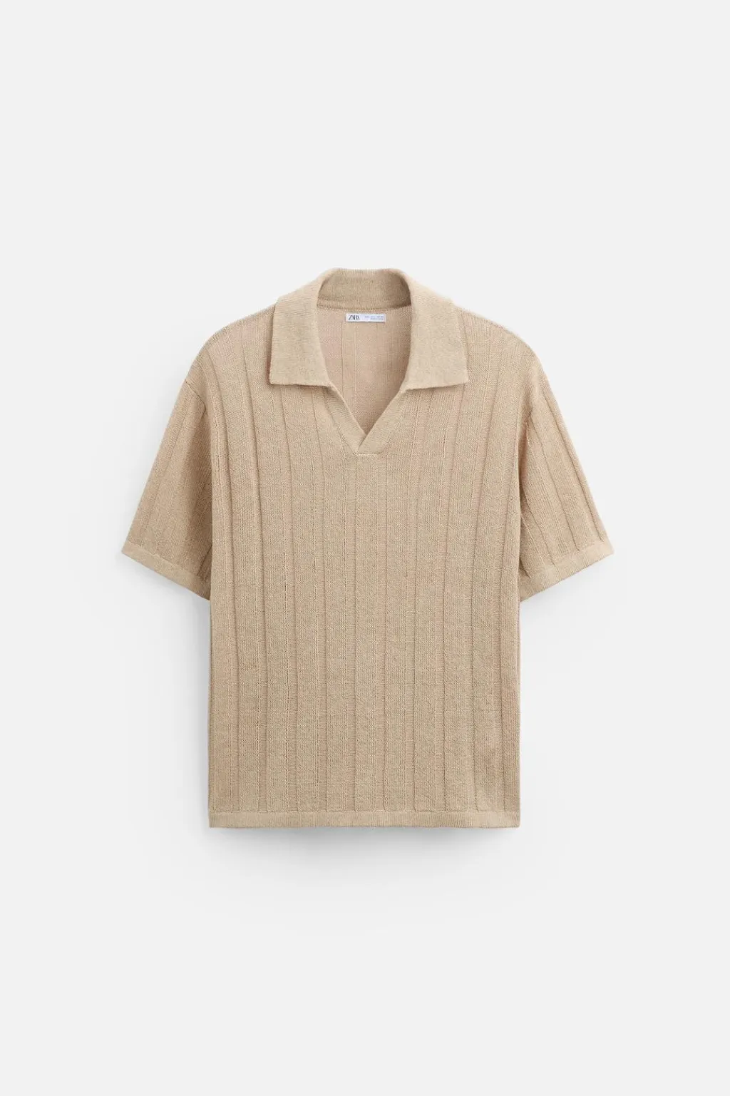 Polo de punto. Cuello solapa con abertura frontal y manga corta. Acabados en rib.