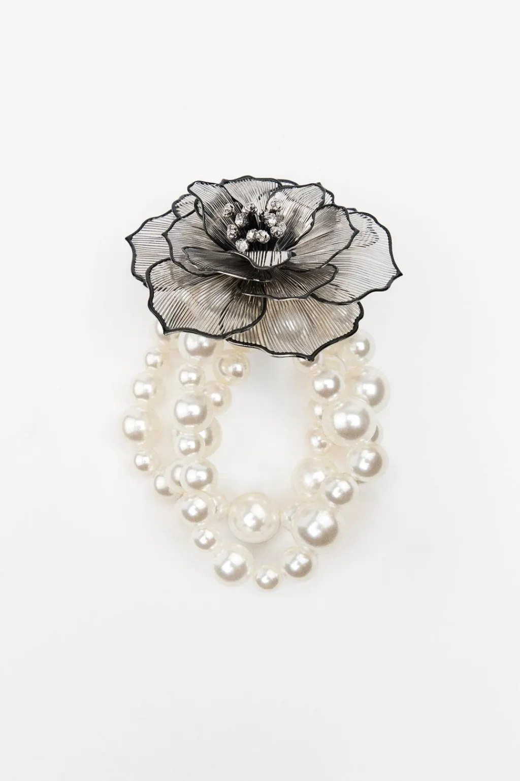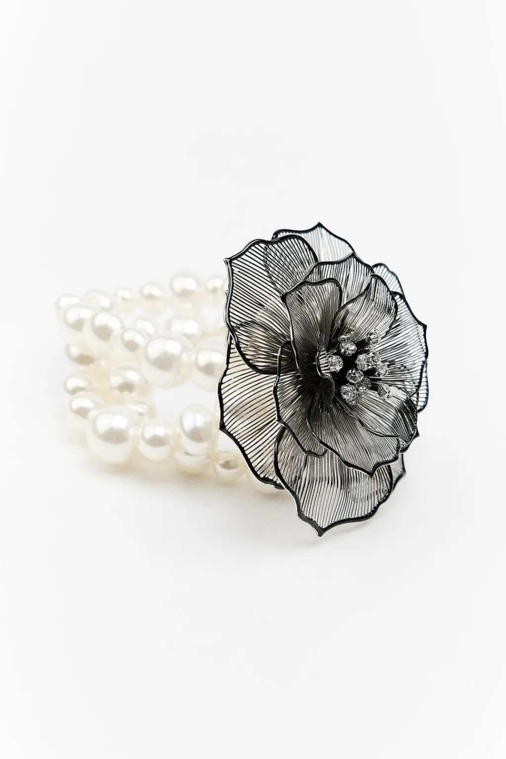 Pulsera elástica de perlas. Flor metálica en relieve con acabados esmaltados y aplicación de brillos.