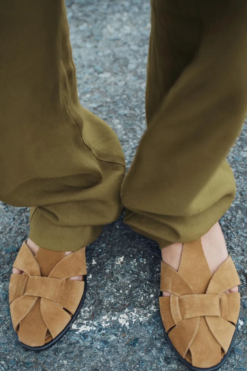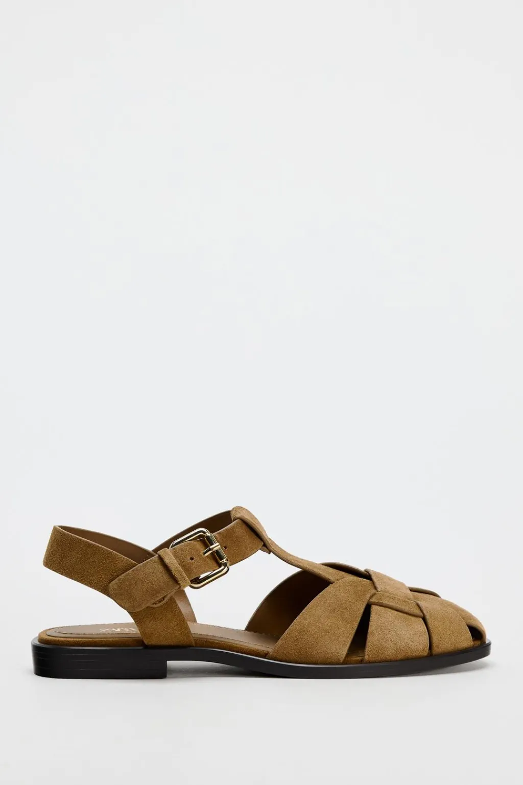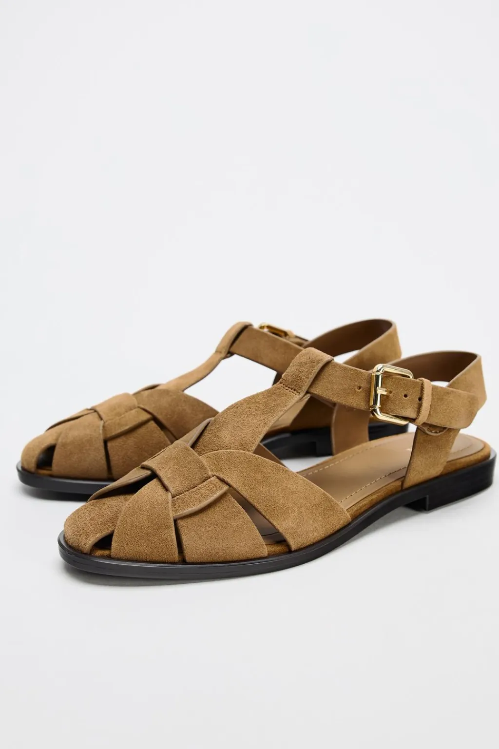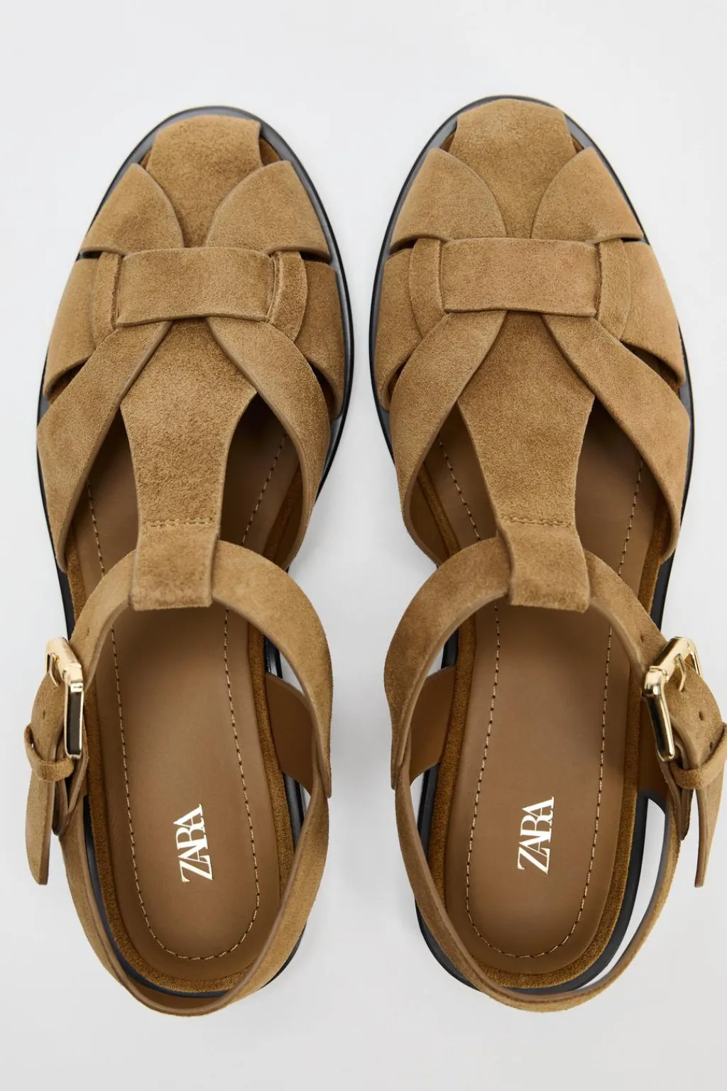 Zapato tipo sandalia cangrejera en serraje. Cierre mediante hebilla en la pulsera al tobillo.
