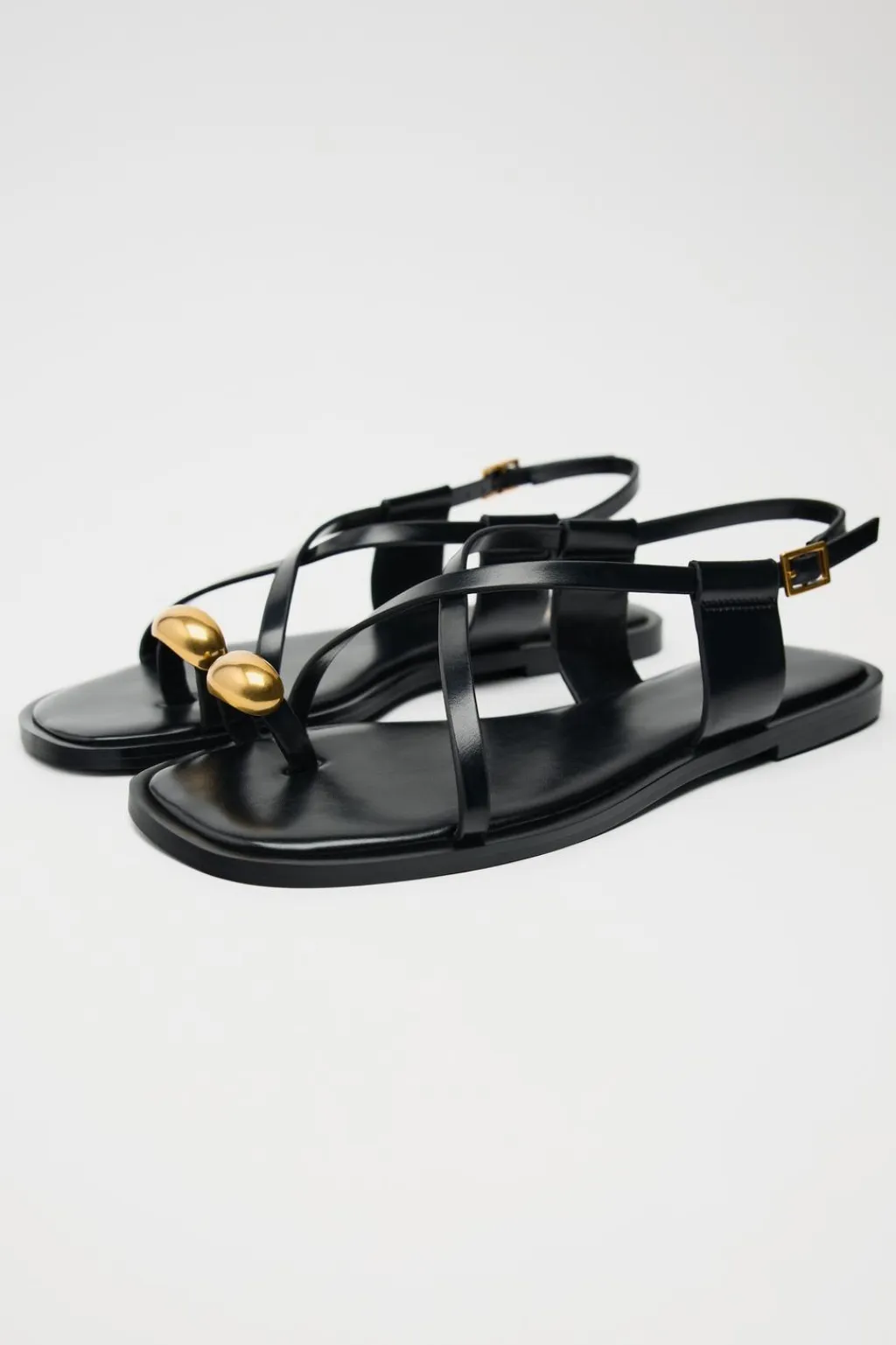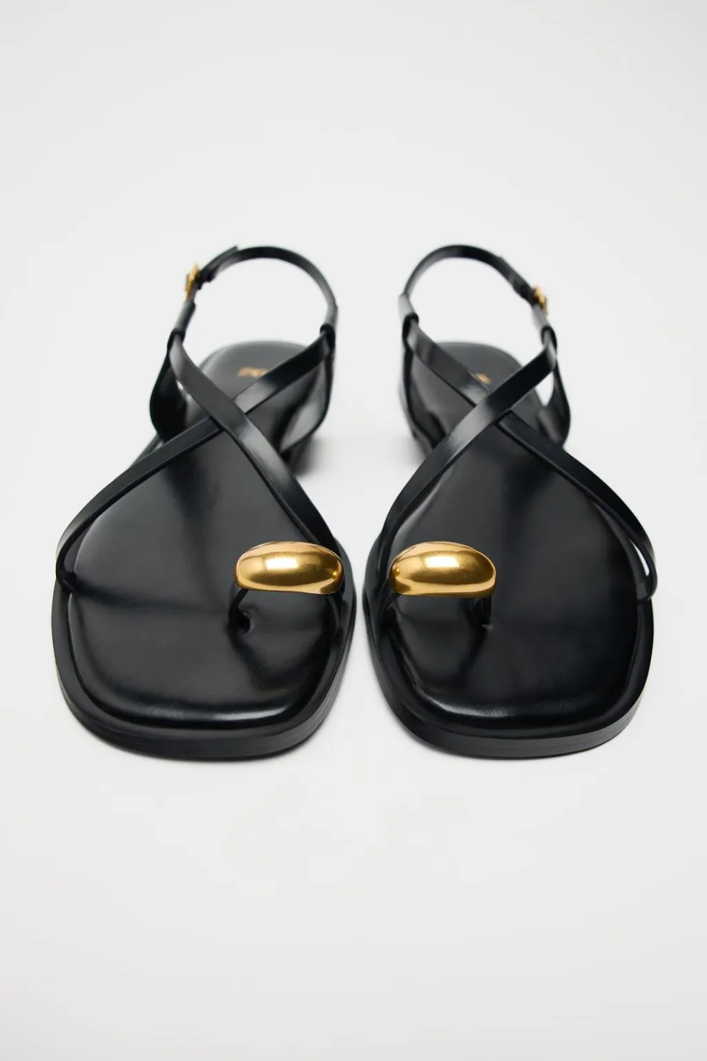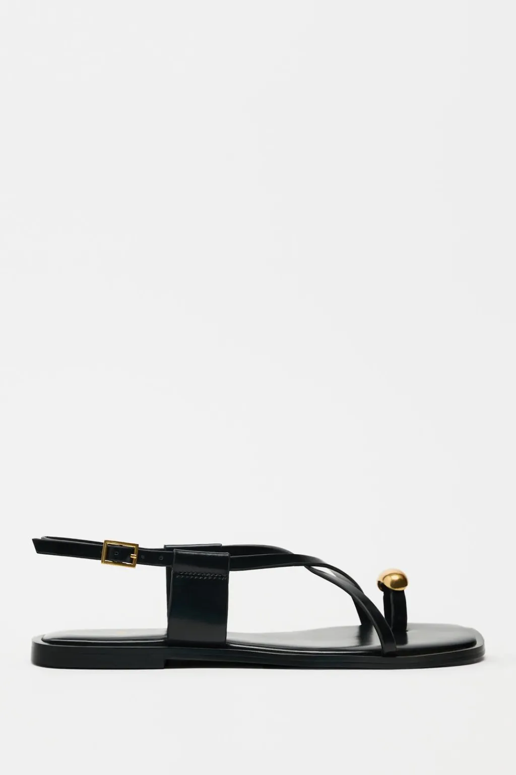 Sandalia plana con tiras finas y adorno metálico en el dedo. Cierre mediante hebilla.