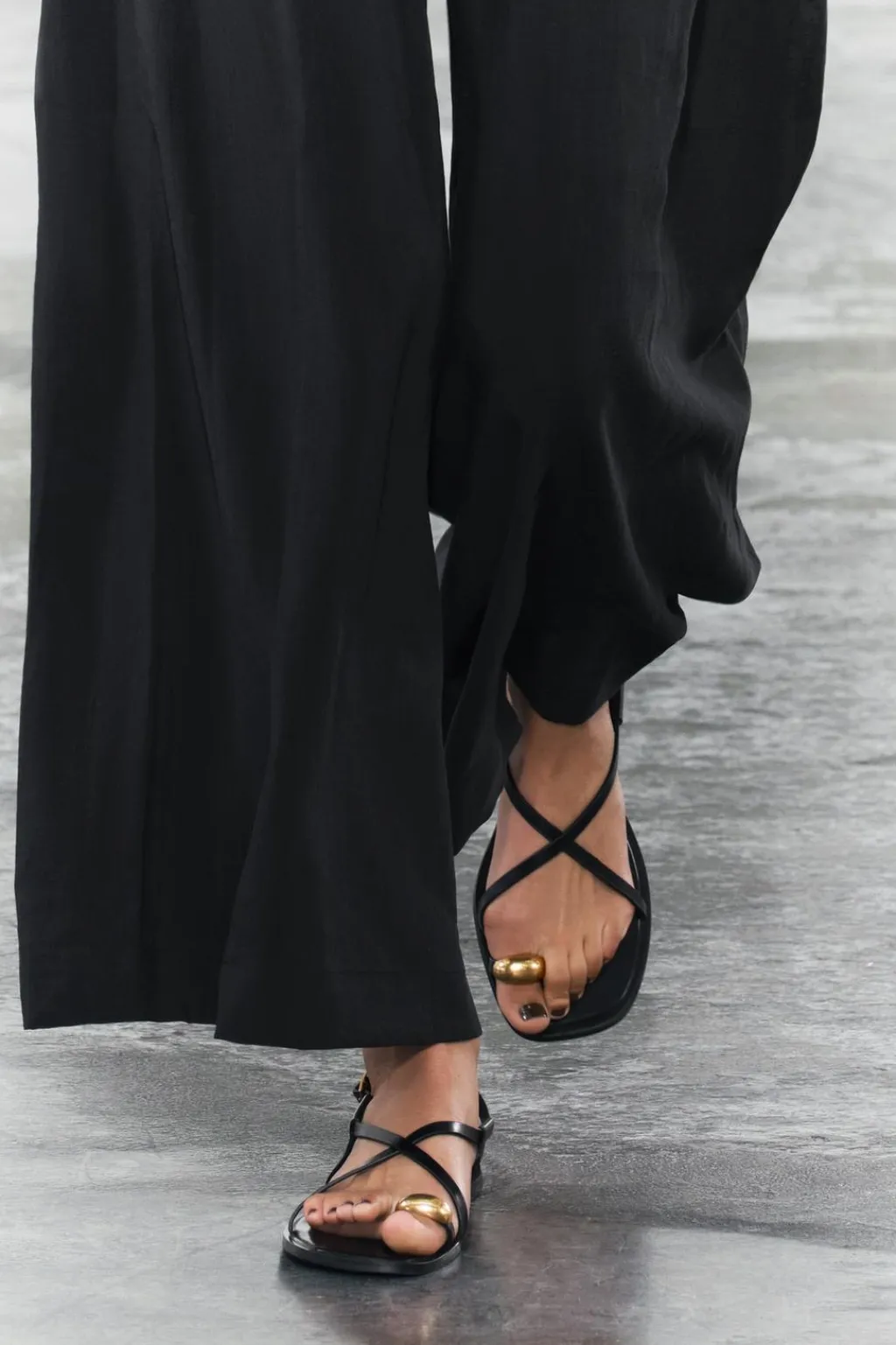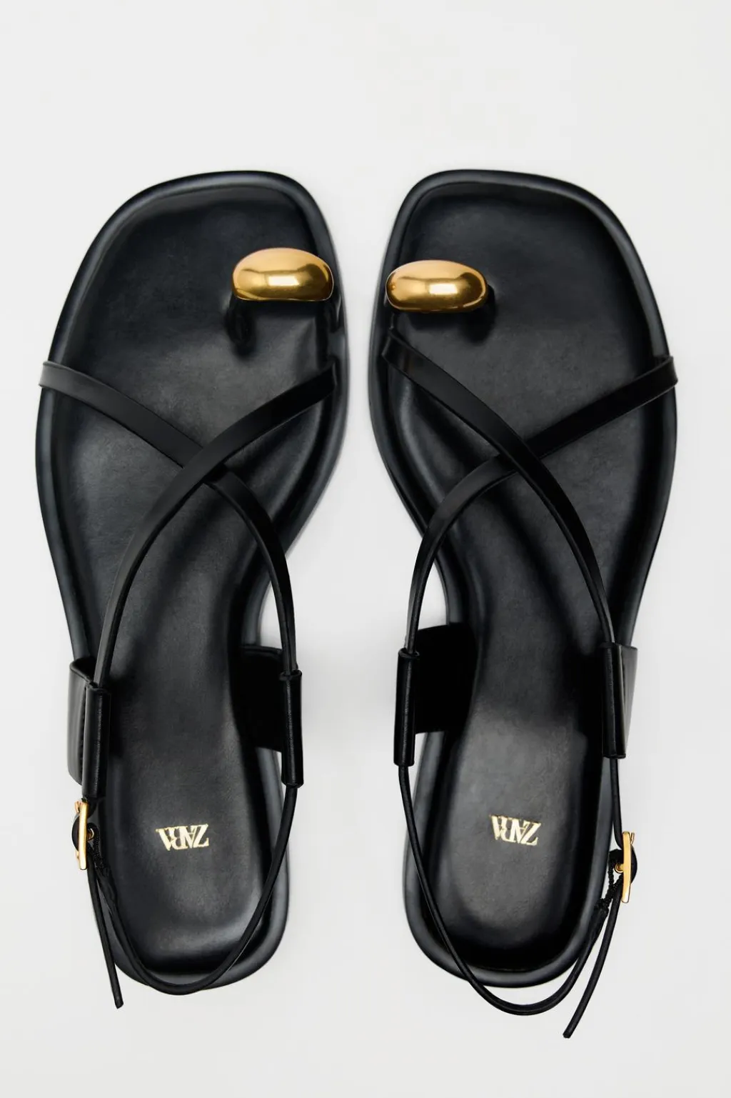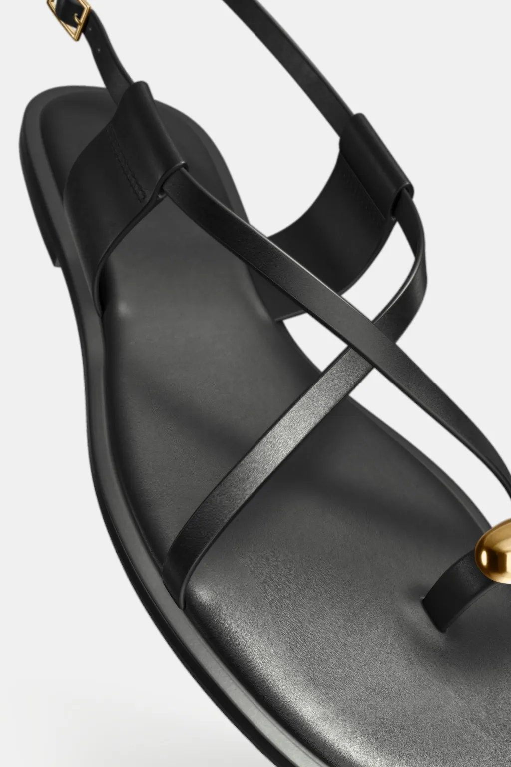 Sandalia plana con tiras finas y adorno metálico en el dedo. Cierre mediante hebilla.