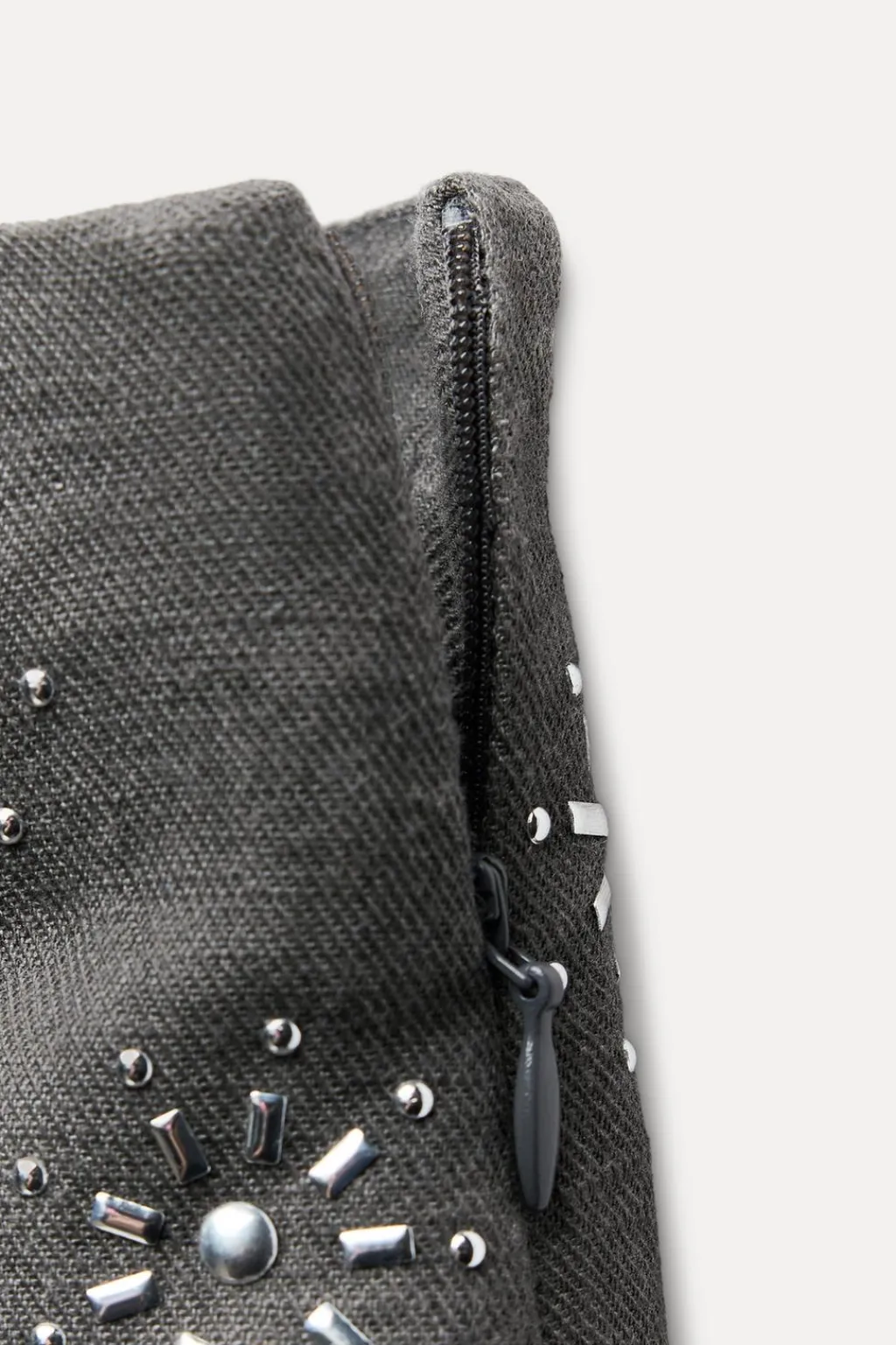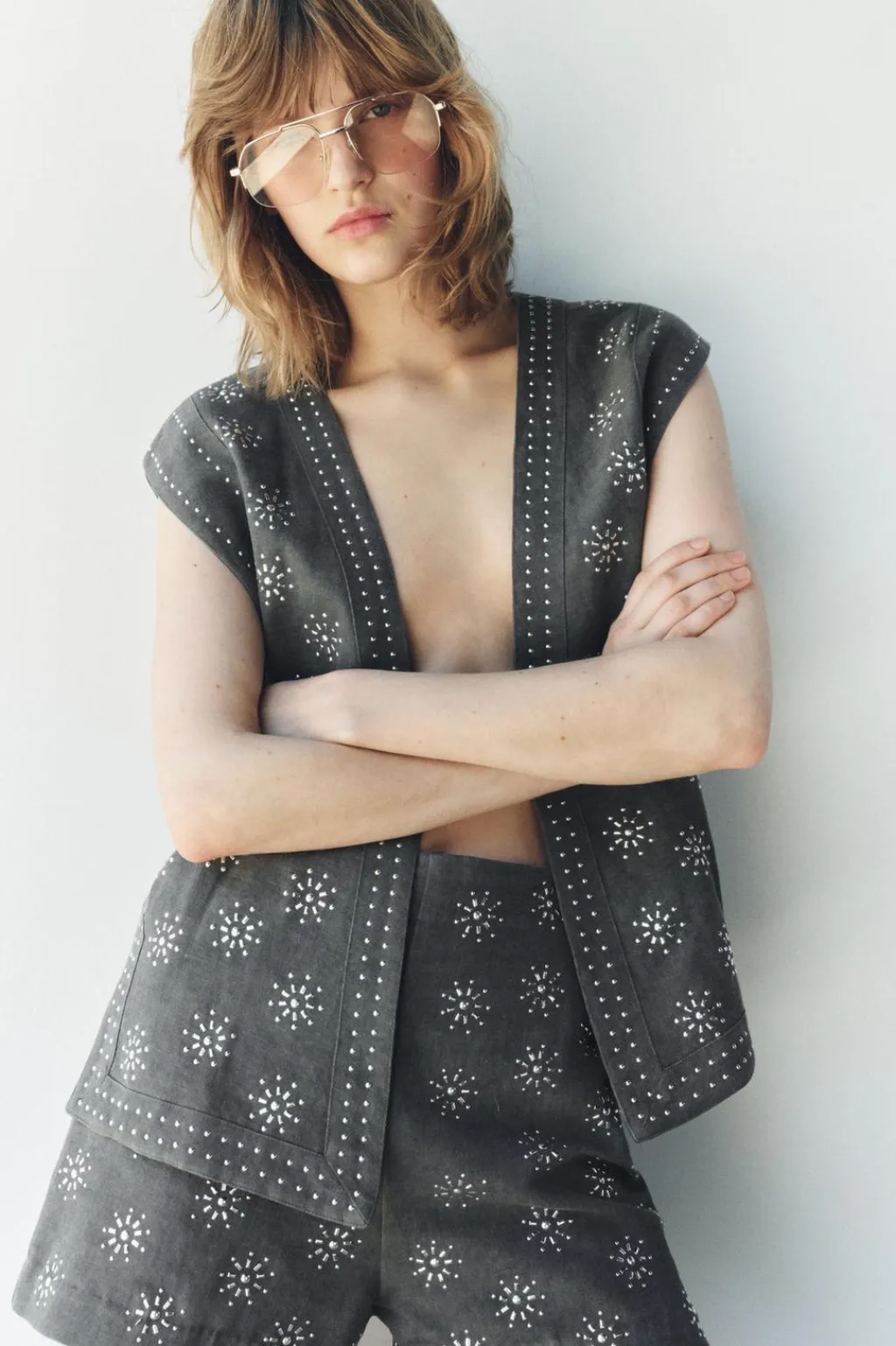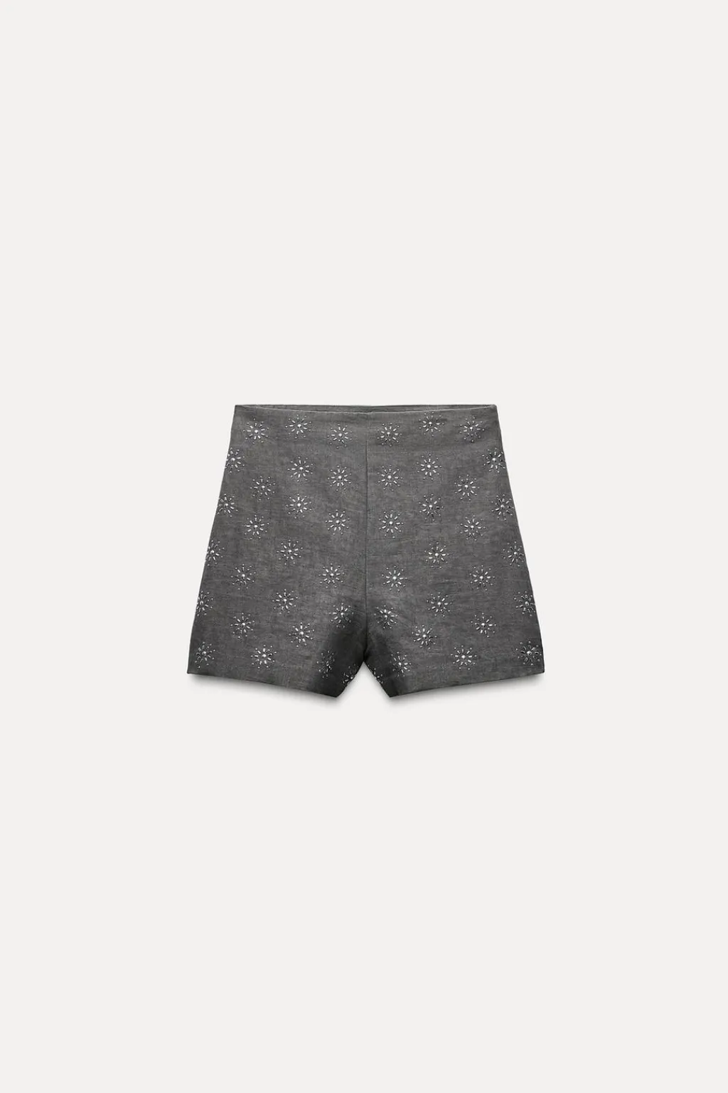Shorts de tiro alto confeccionados en hilatura con mezcla de lino. Detalle de bordados con aplicación de abalorios. Cierre lateral con cremallera oculta en costura.