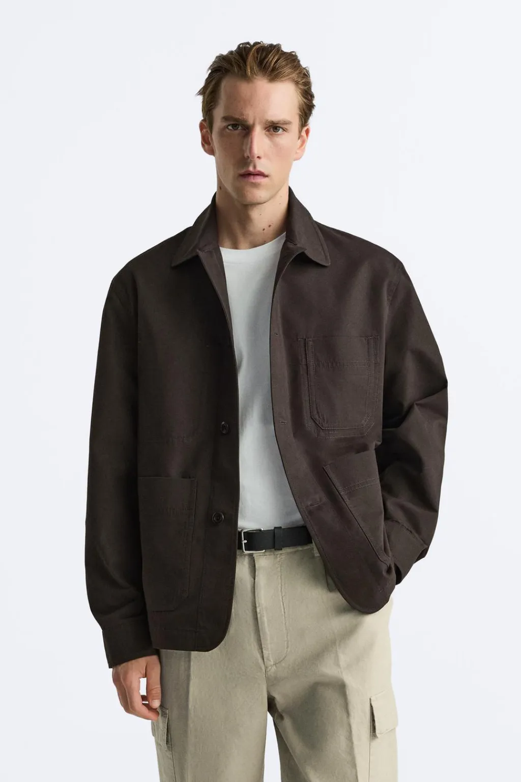 Sobrecamisa confeccionada en tejido con mezcla de algodón. Cuello solapa y manga larga acabada en puño con botón. Bolsillos de plastrón en delantero. Cierre frontal de botonadura.