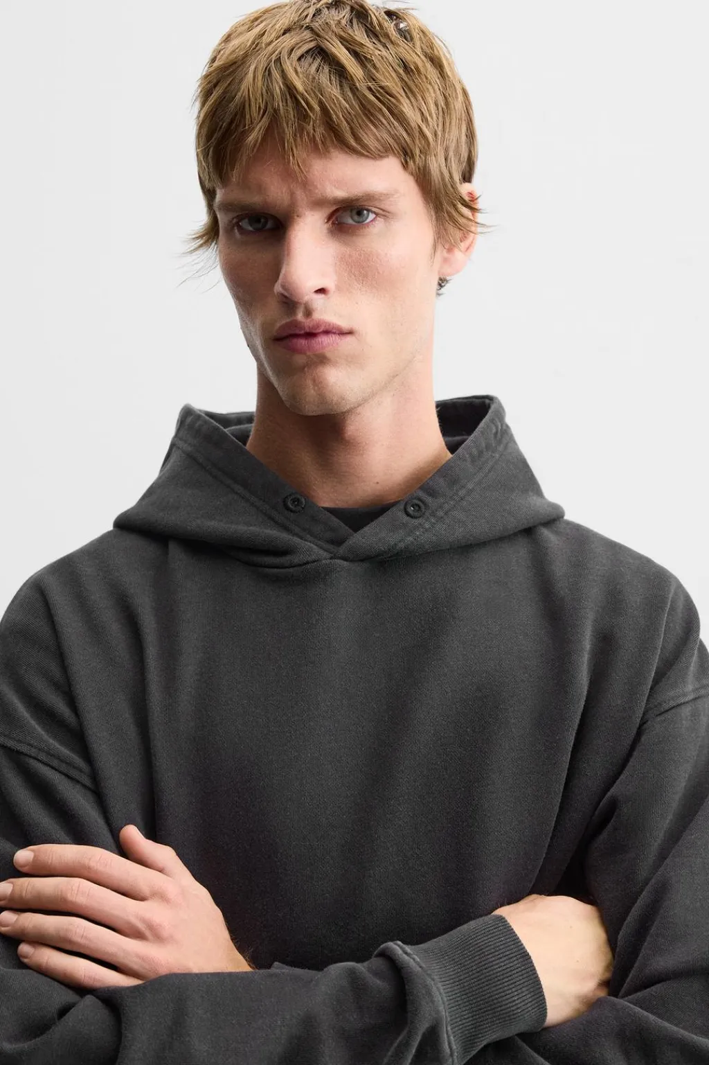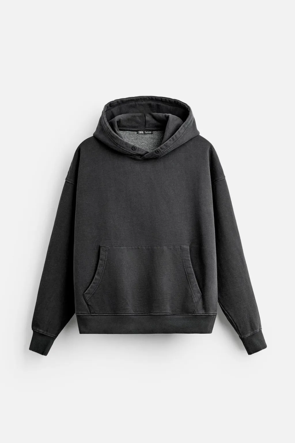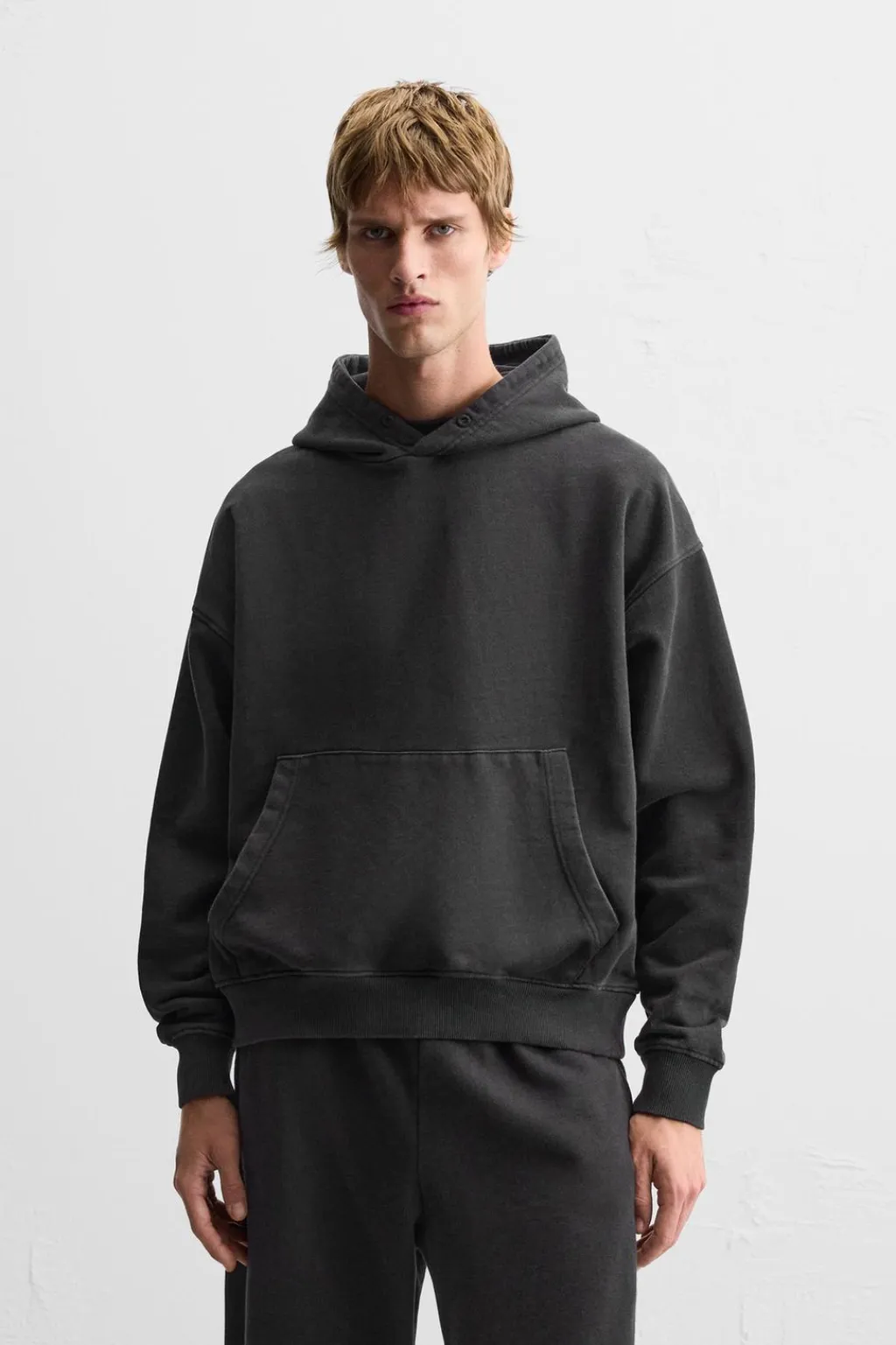 Sudadera hoodie boxy fit. Cuello con capucha ajustable y manga larga. Bolsillo frontal tipo canguro. Efecto lavado. Acabados en rib.