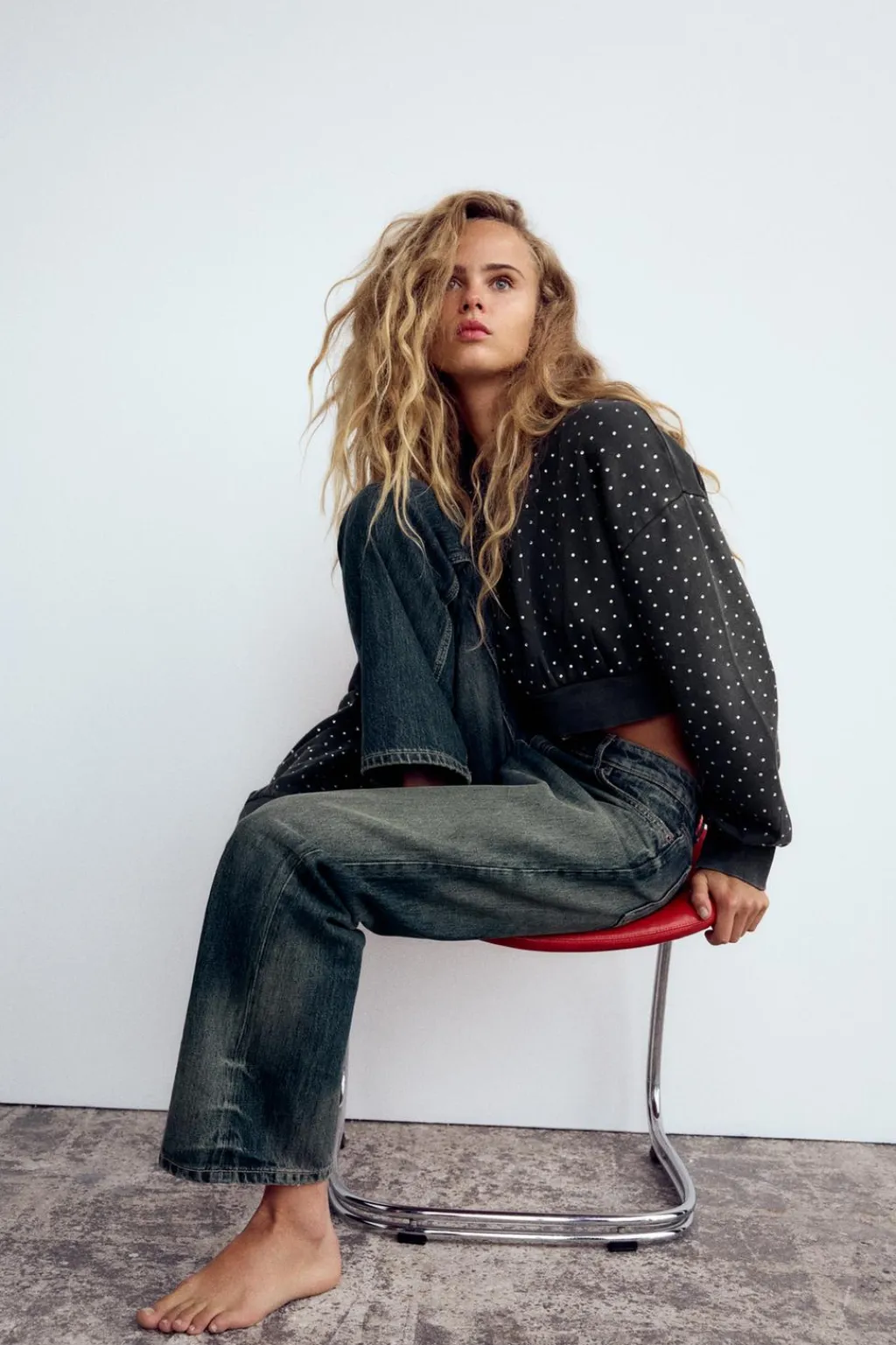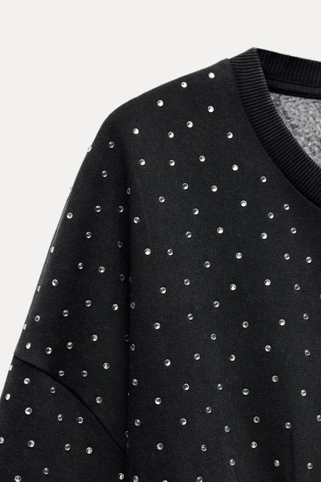 Sudadera crop de cuello redondo y manga larga. Acabados en rib. Detalle de joyas.