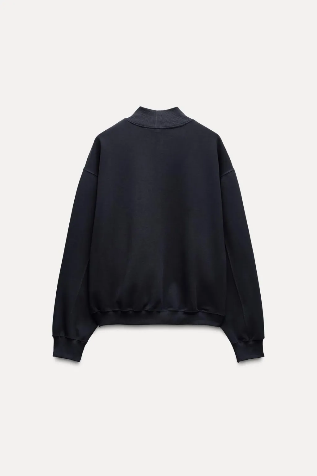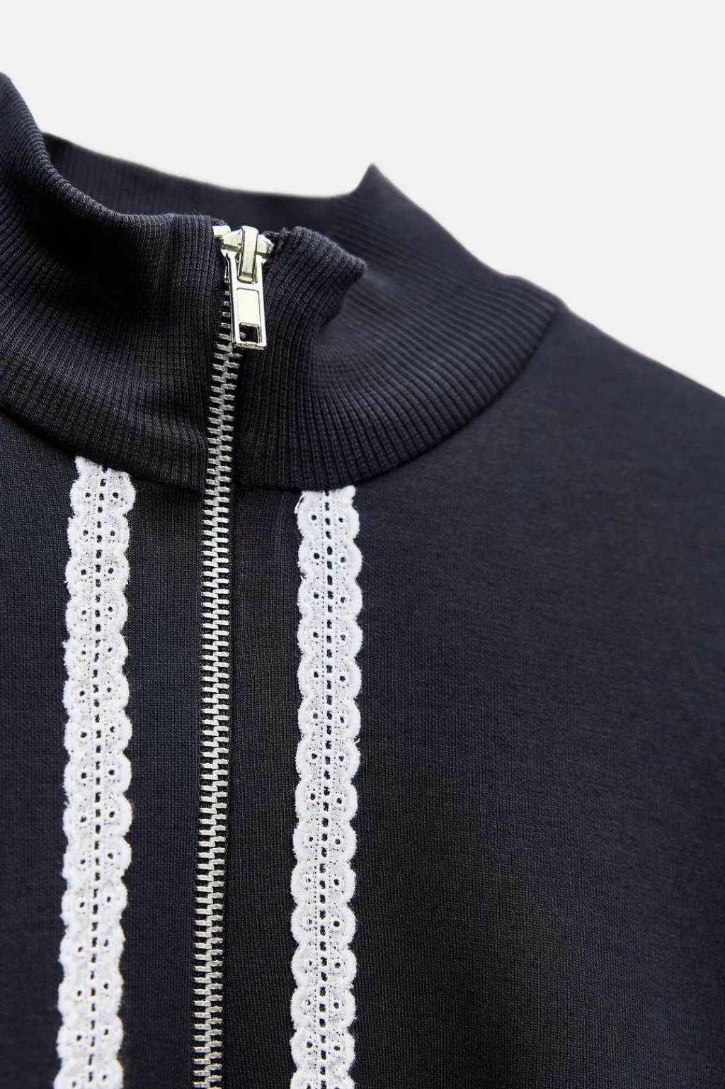 Sudadera de cuello alto y manga larga acabada en puño. Detalle de bordado y aplicación de puntilla. Cierre frontal con cremallera metálica.