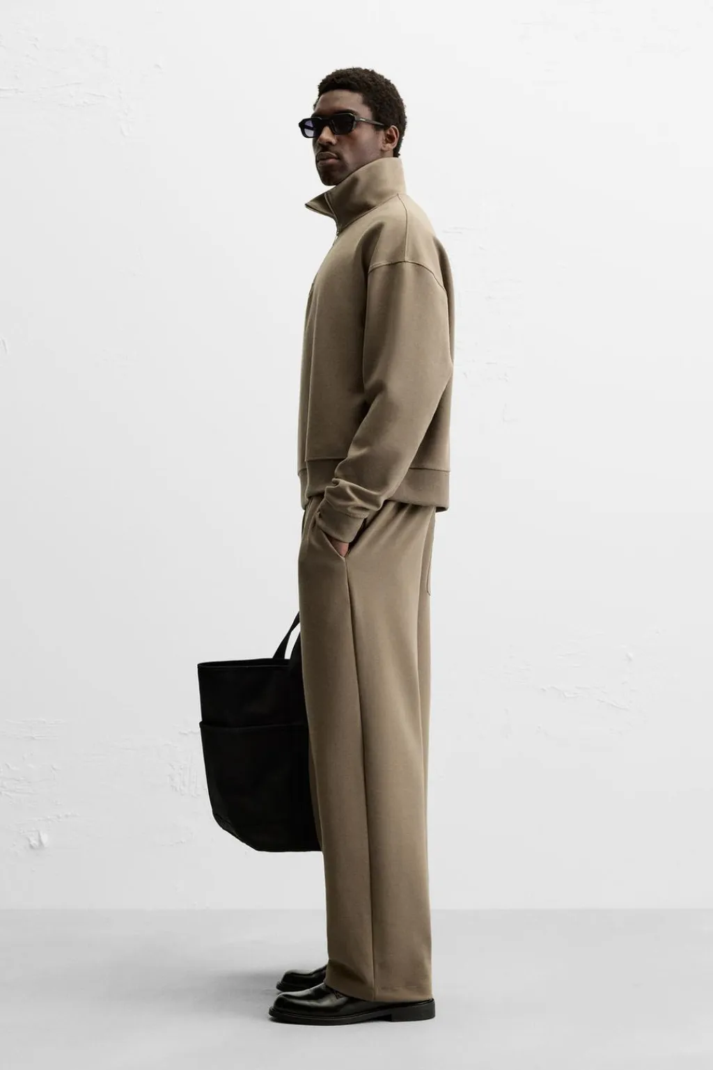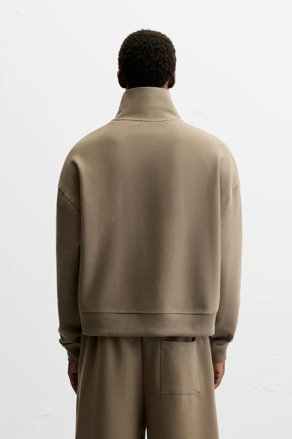 Sudadera boxy fit confeccionada en tejido técnico doble con elasticidad. Cuello subido con cierre frontal de cremallera. Manga larga. Acabados en rib.