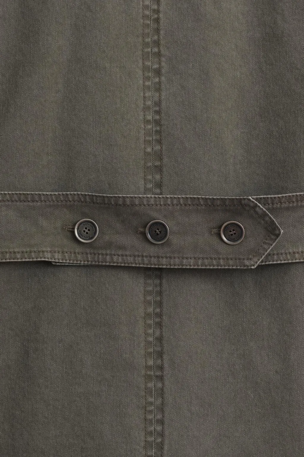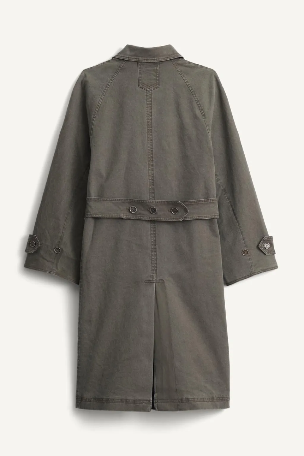 Trench relaxed fit confeccionado en tejido de algodón con elasticidad. Cuello solapa y manga larga acabada en puño ajustable con trabilla. Bolsillos de vivo en cadera y detalle de bolsillo interior. Efecto lavado. Detalle de martingala en la espalda. Bajo con abertura en centro espalda. Cierre frontal de botonadura.