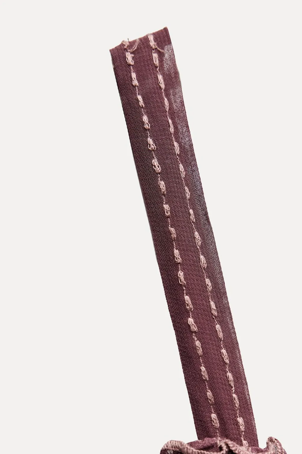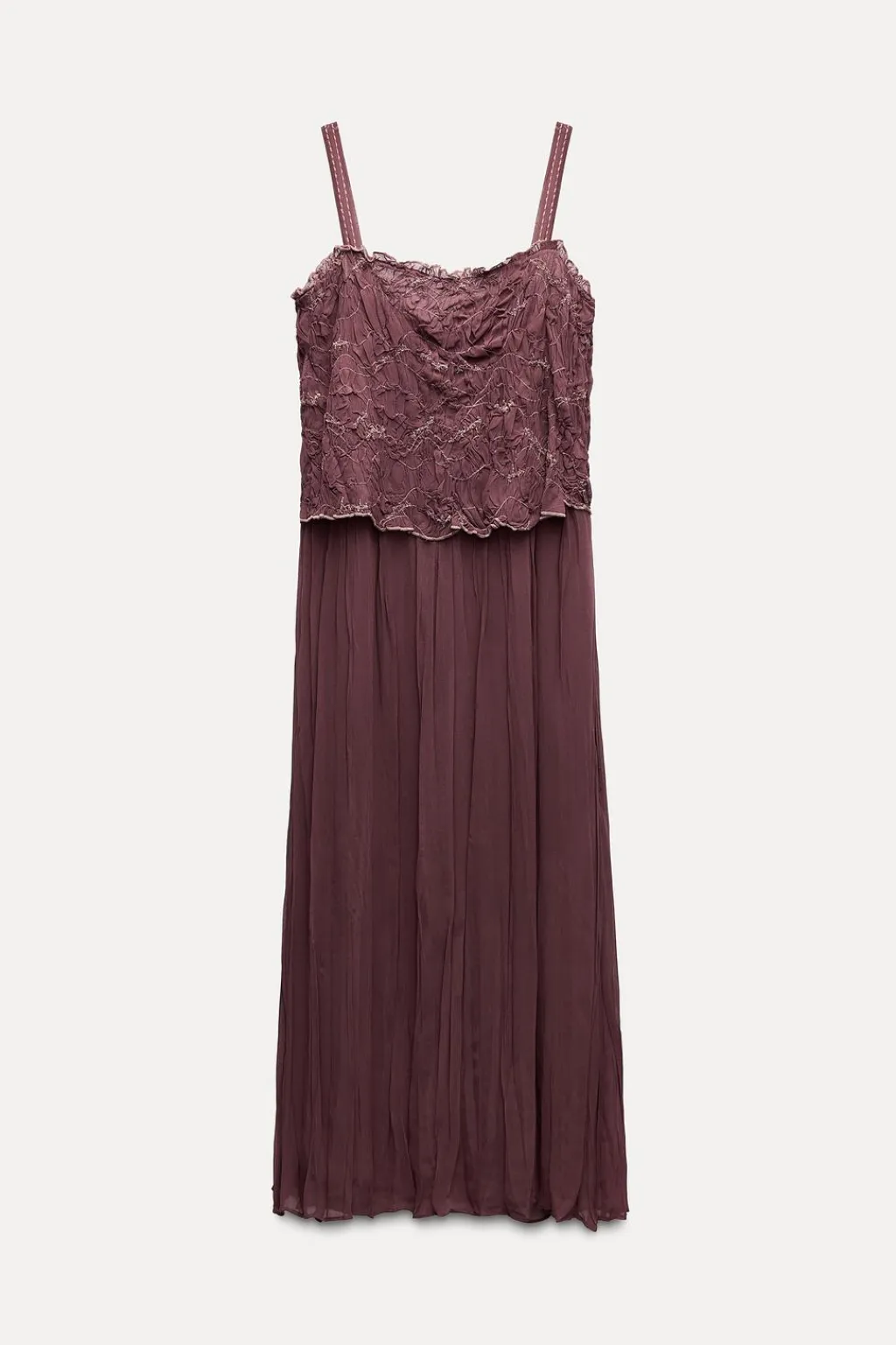 Vestido midi confeccionado en hilatura de viscosa. Escote recto y tirantes finos. Detalle de bordados a contraste y tejido arrugado.