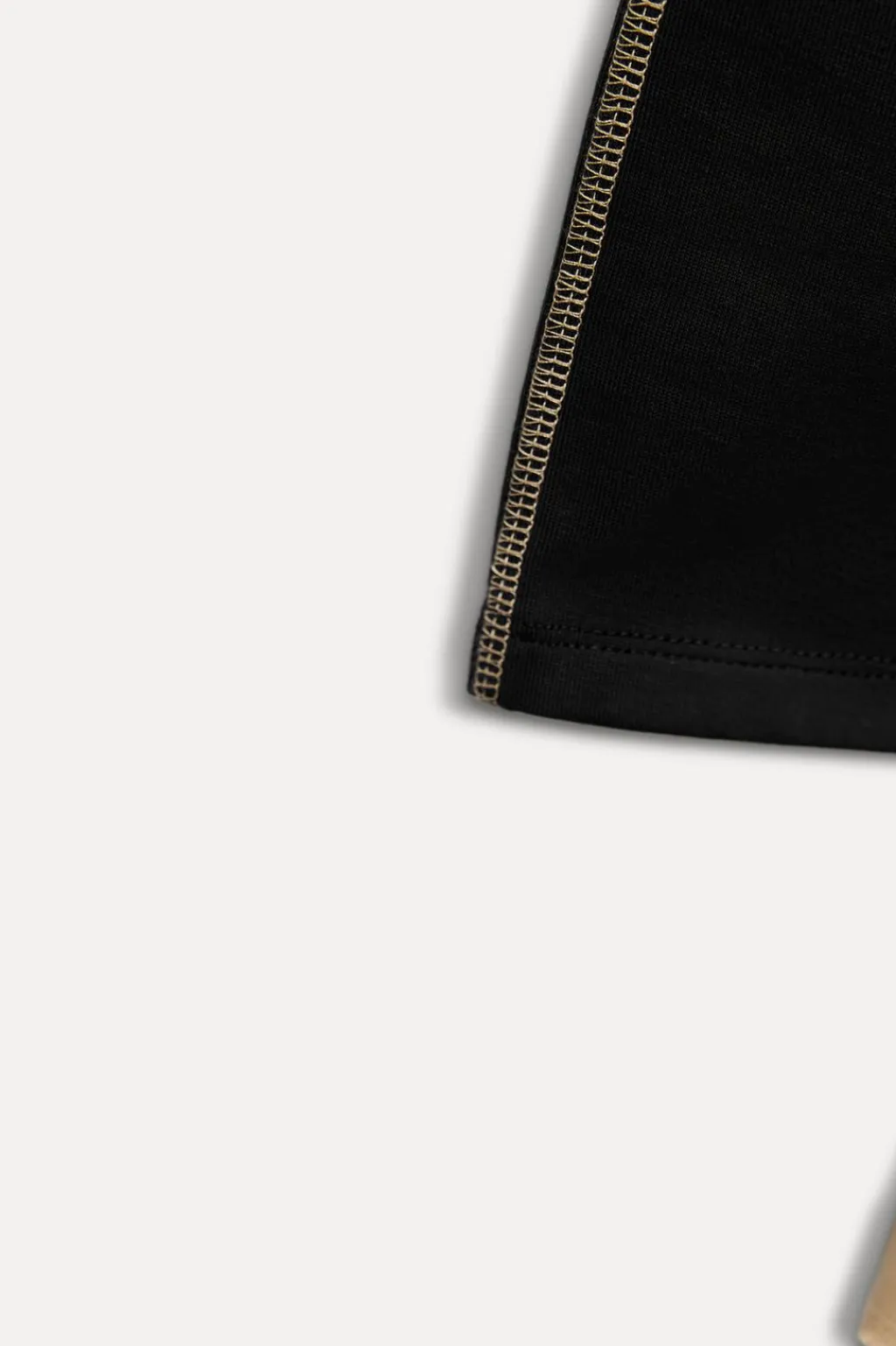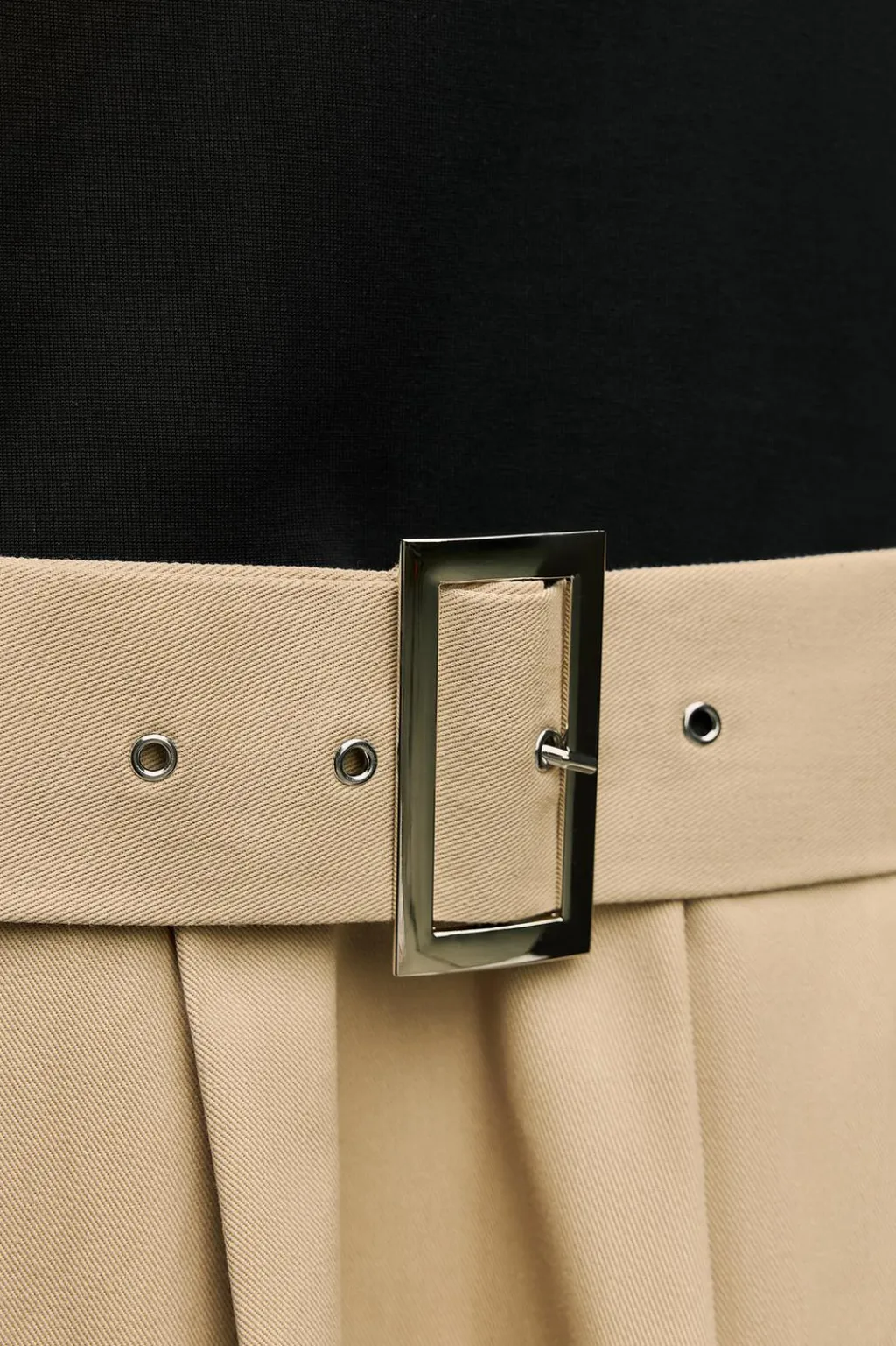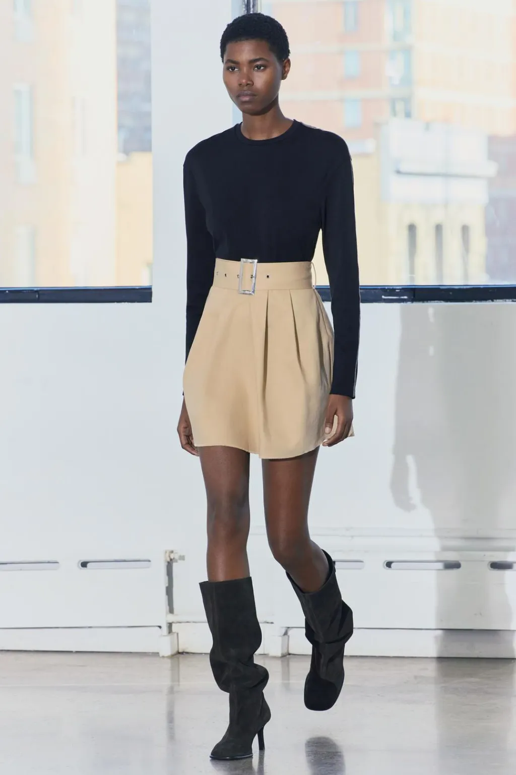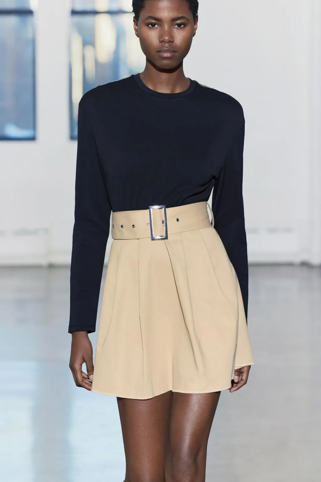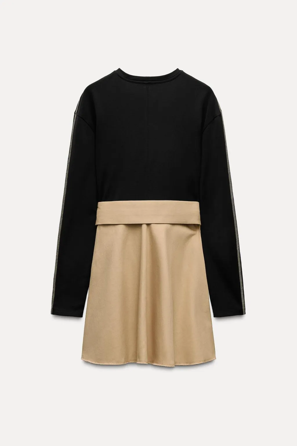 Vestido corto de cuello redondo y manga larga. Cinturón ajustable con hebilla metálica. Detalle de combinación de tejidos a contraste. Bajo acabado en volumen.