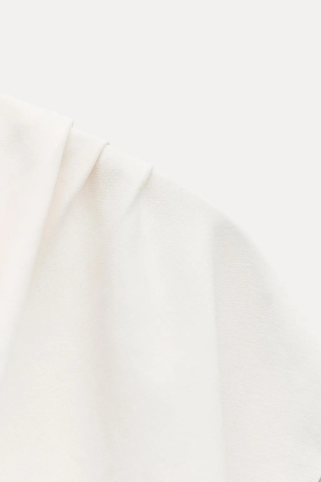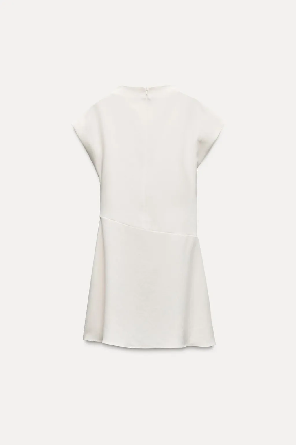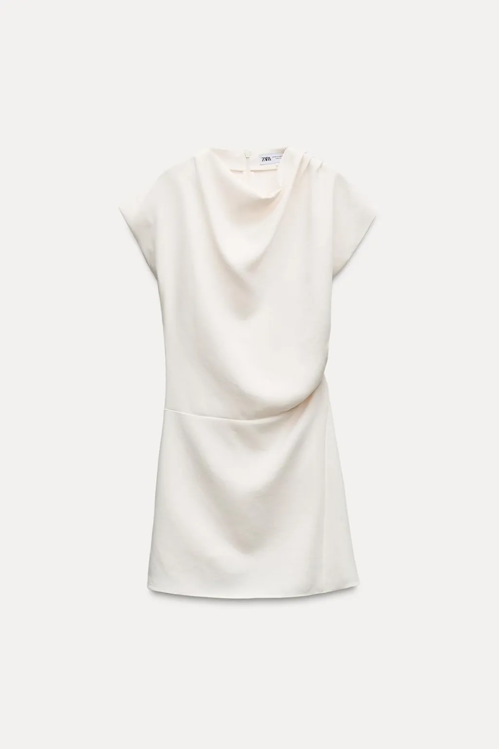 Vestido corto de cuello drapeado y manga corta. Detalle de frunces en hombro y cintura. Cierre en espalda con cremallera oculta en costura.