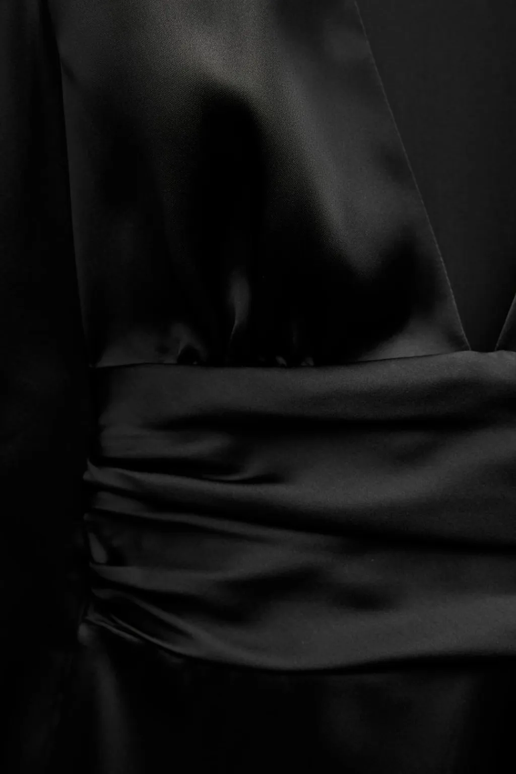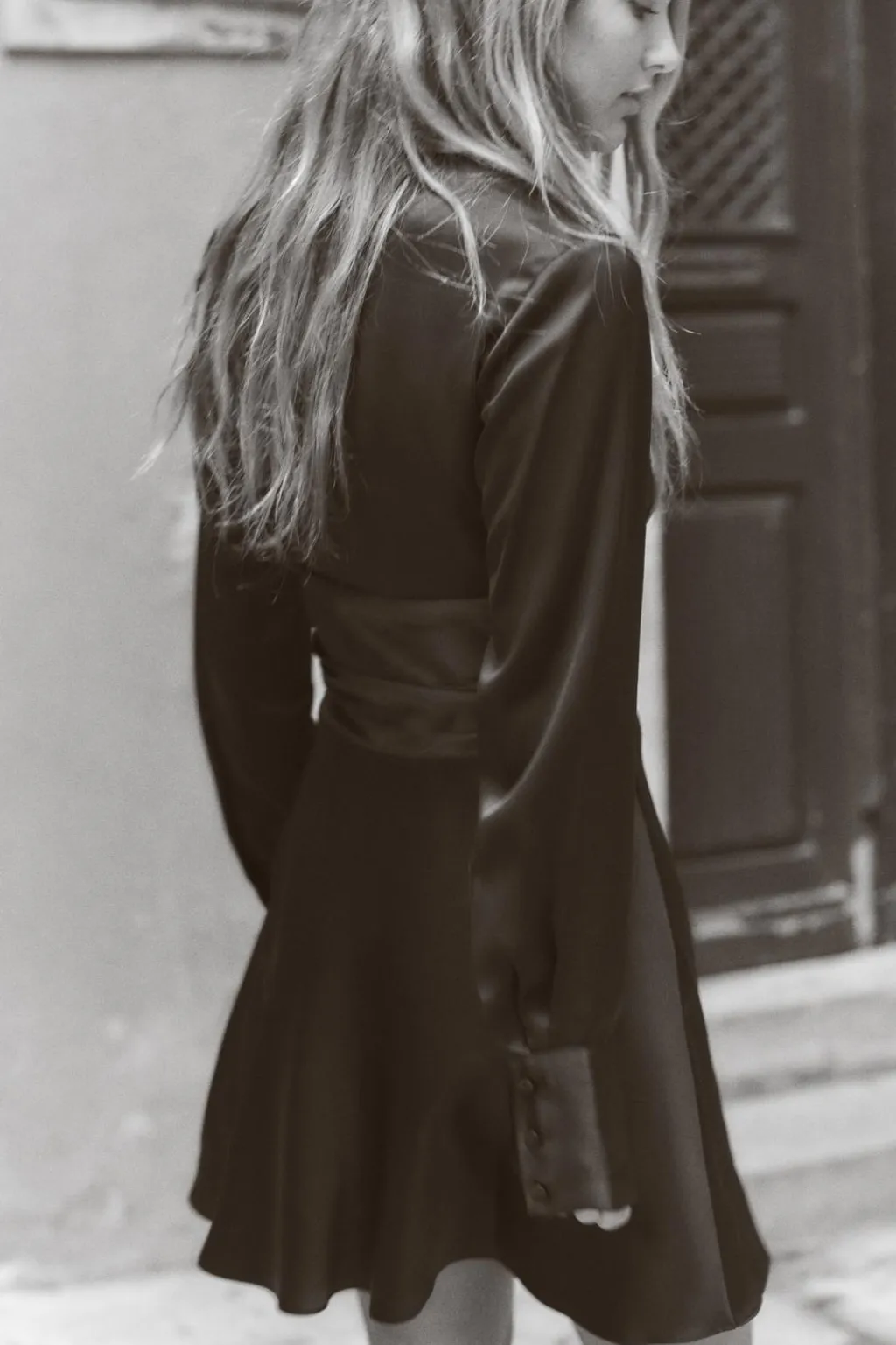 Vestido confeccionado en tejido satinado. Escote pico y manga larga acabada en puño. Detalle de frunces en cintura. Cierre con cremallera oculta en costura.