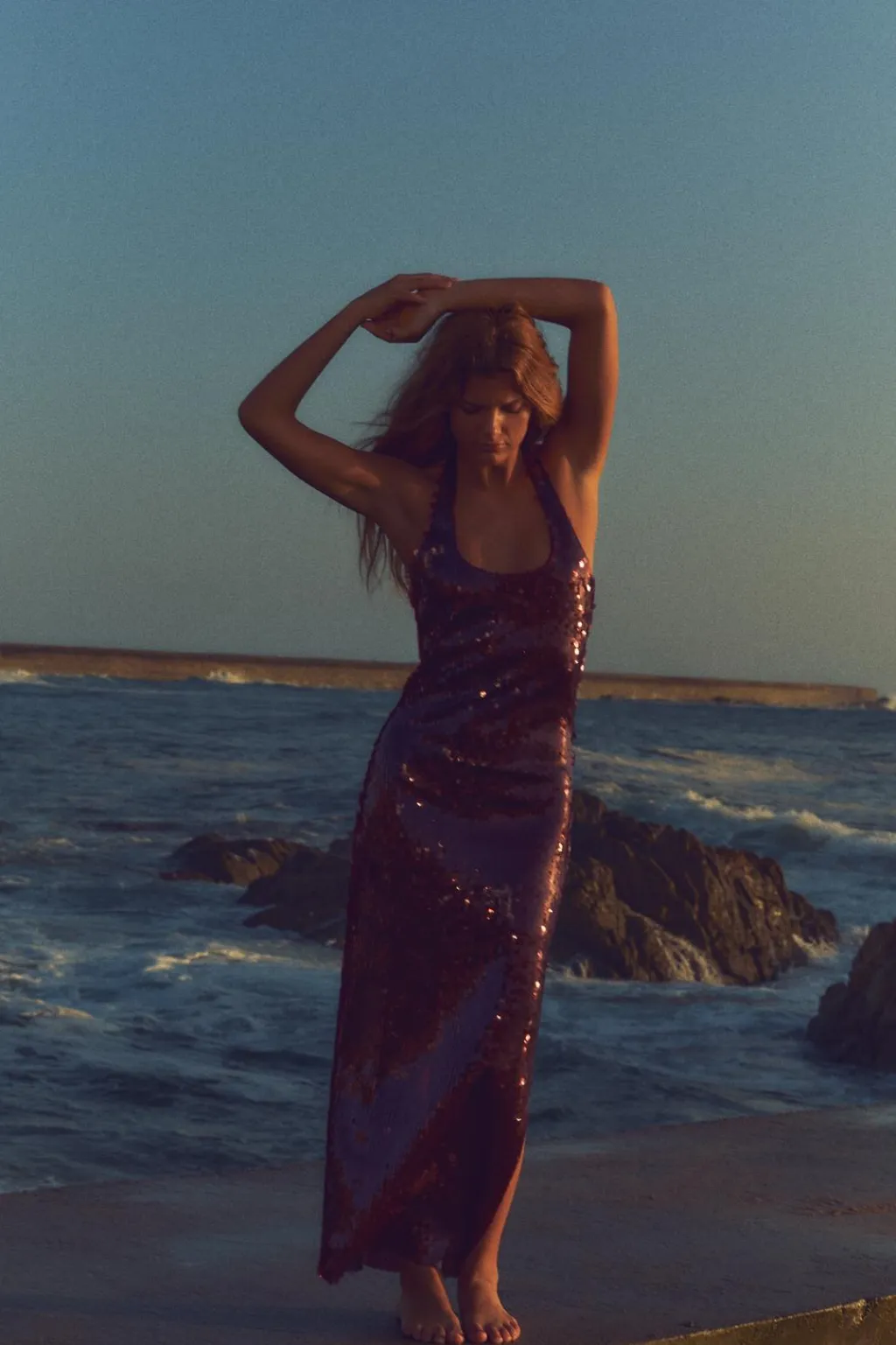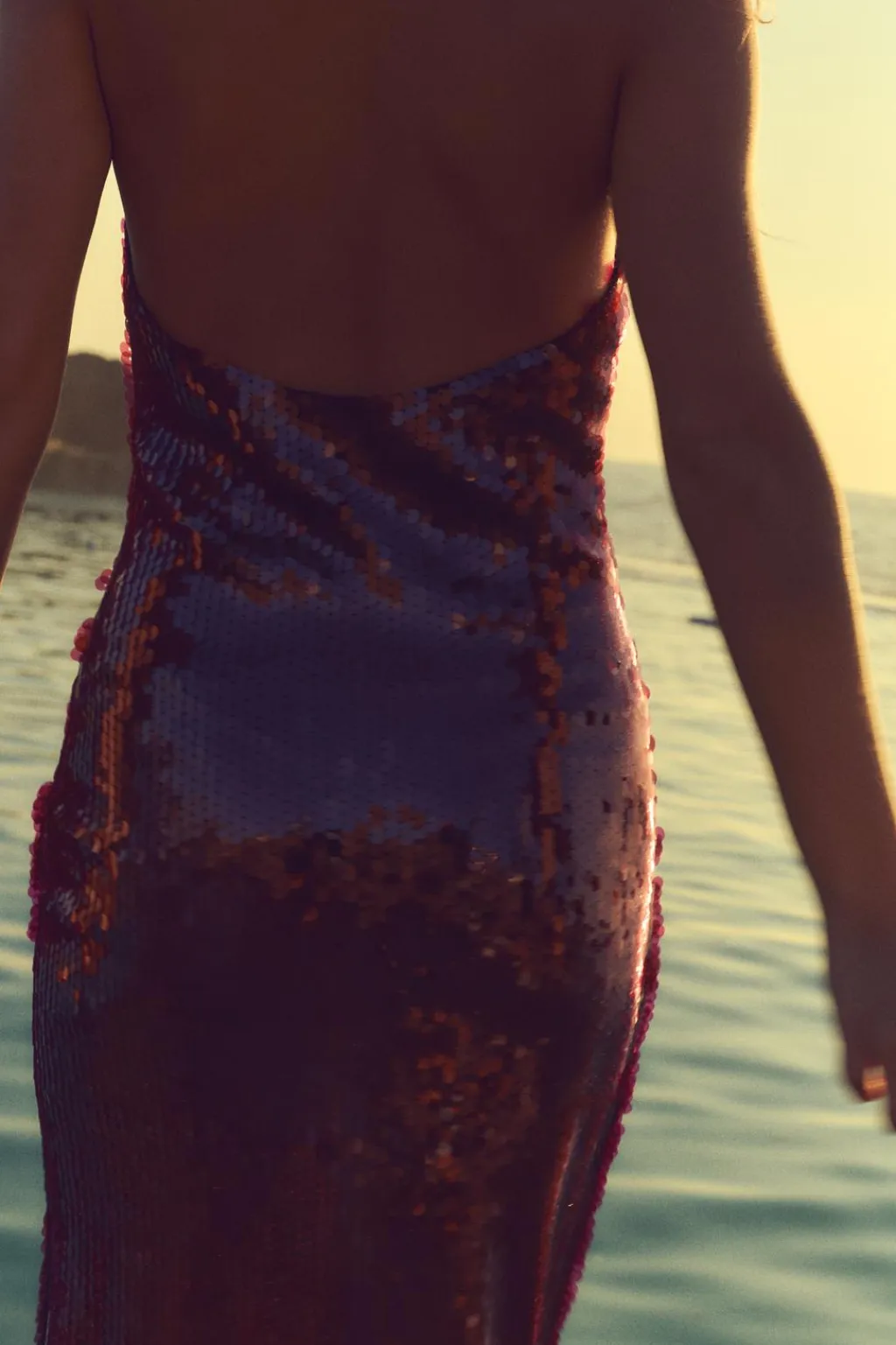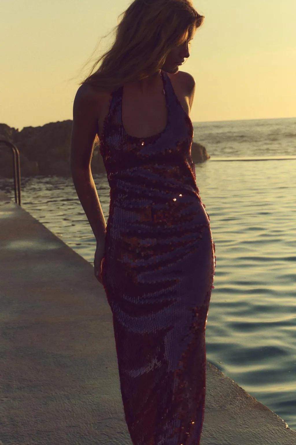 Vestido midi de cuello halter y escote redondo. Espalda descubierta. Detalle aplicación lentejuelas. Cierre en cuello con botones.