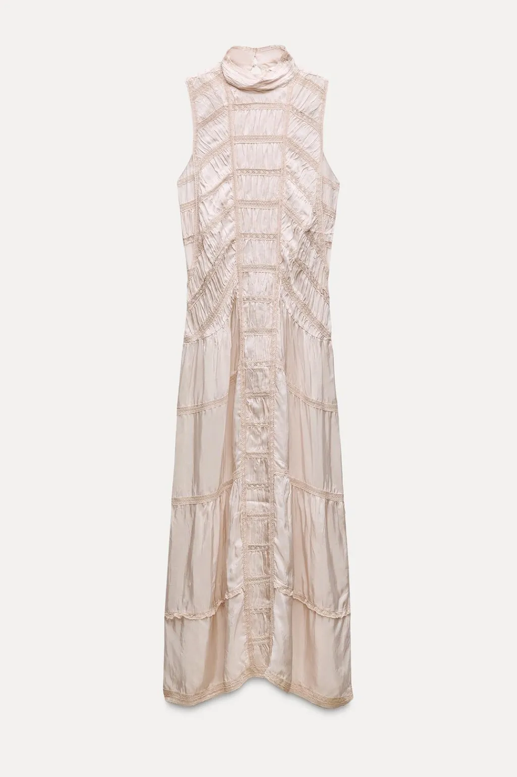 Vestido largo de cuello perkins y manga sisa. Detalle de aplicación de encaje a tono y tejido arrugado. Cierre en espalda con abertura y botón.