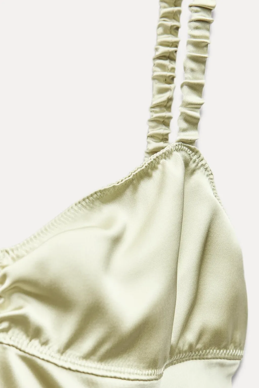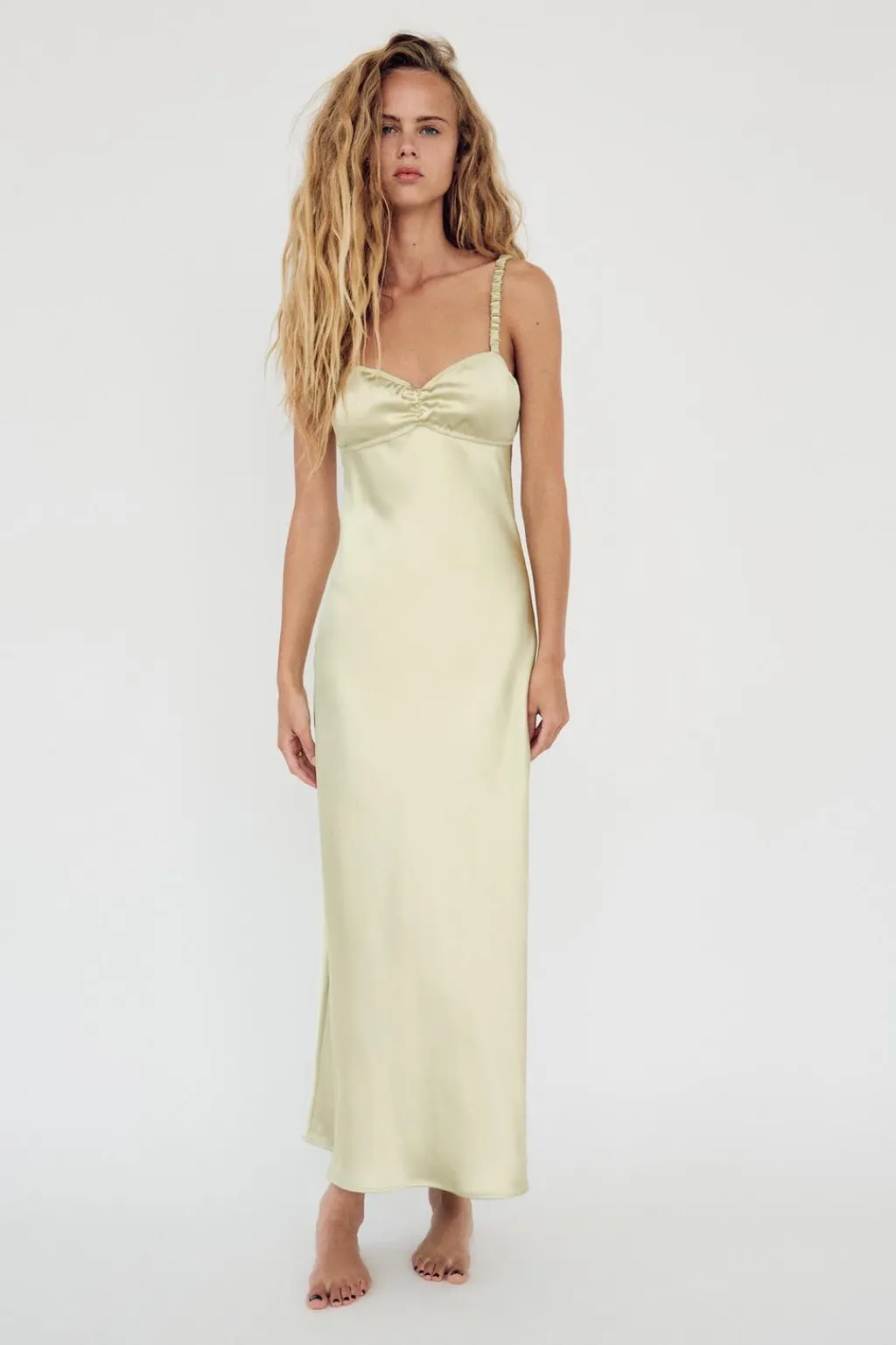 Vestido midi de escote pico y tirantes finos elásticos. Espalda descubierta con detalle de tira elástica.