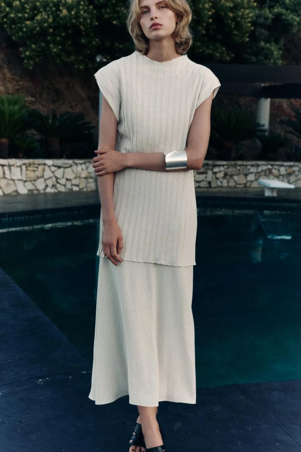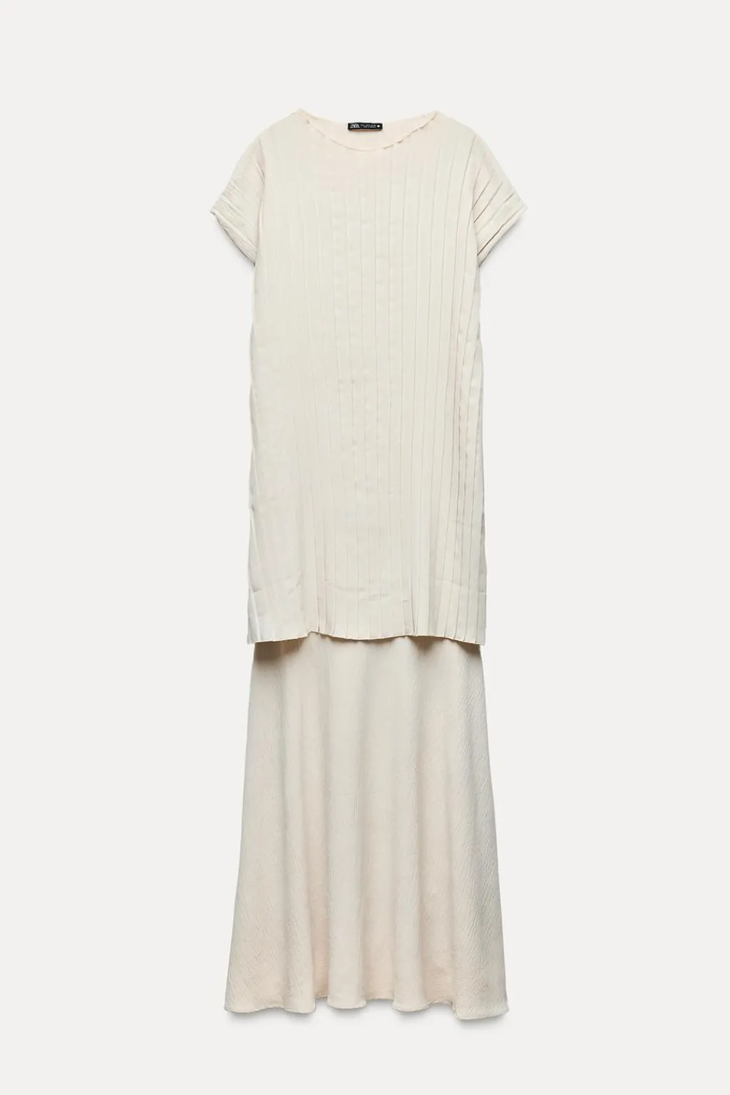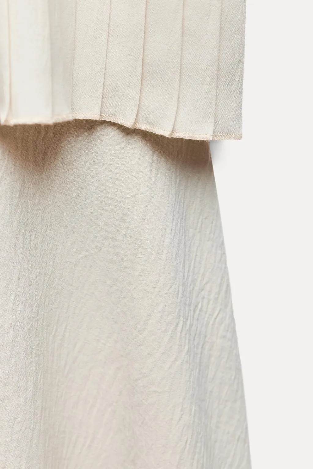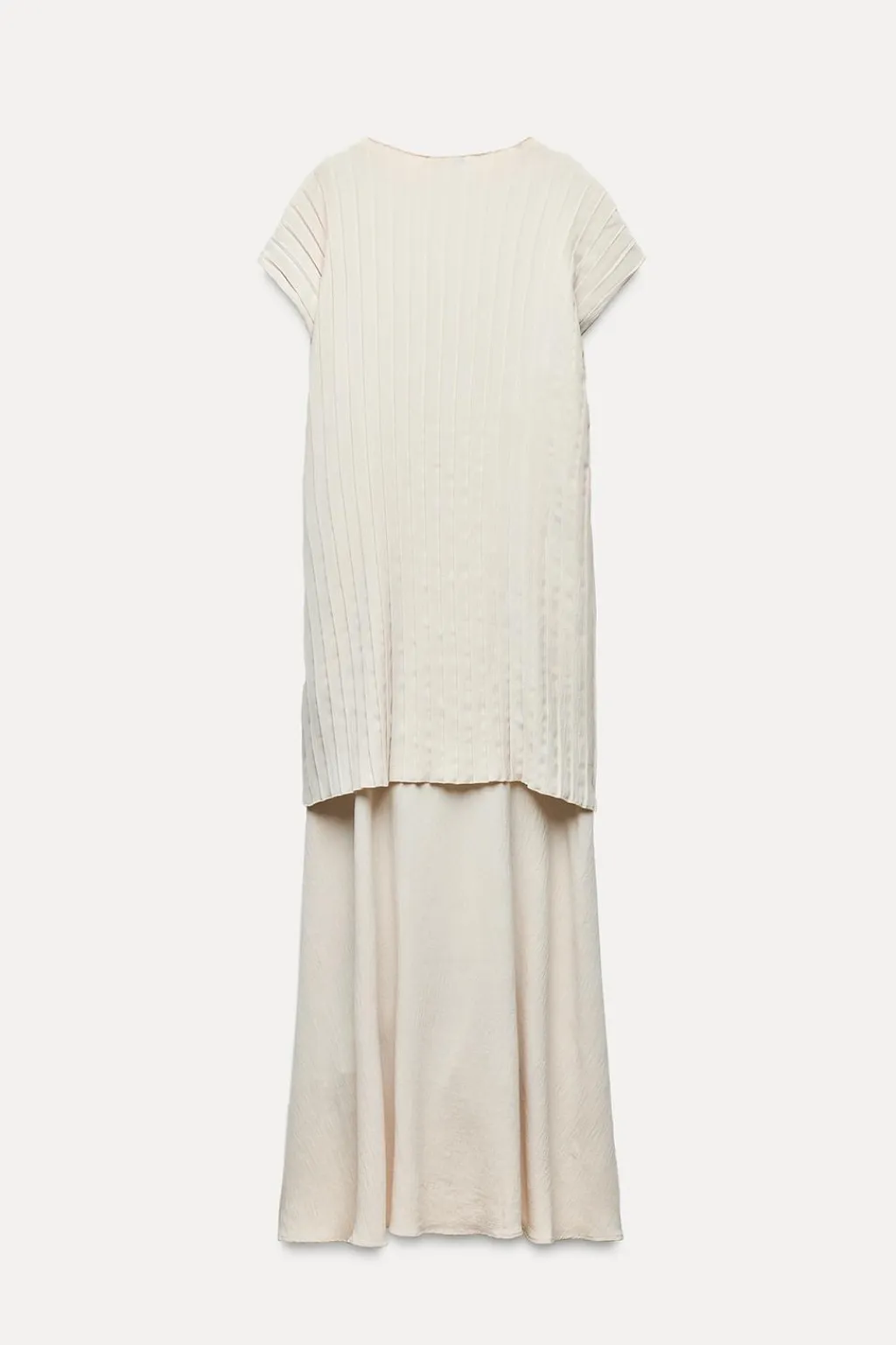 Vestido midi de cuello redondo y manga corta. Detalle de superposición en tejido plisado.