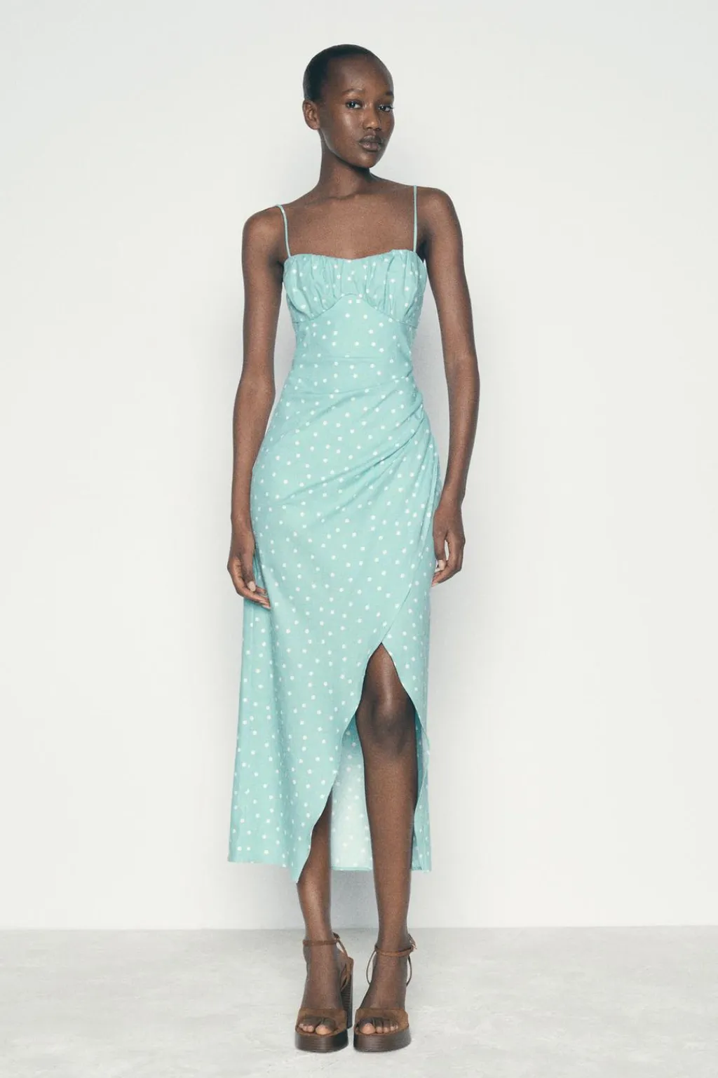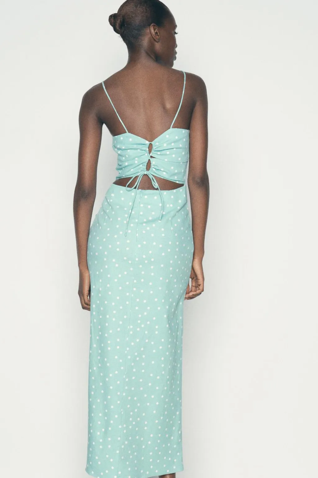 Vestido confeccionado con lino. Escote recto con frunces y tirantes finos. Detalle de abertura en espalda con cordón. Cintura entallada con frunces laterales. Bajo con abertura frontal. Cierre en espalda con cremallera oculta en costura.