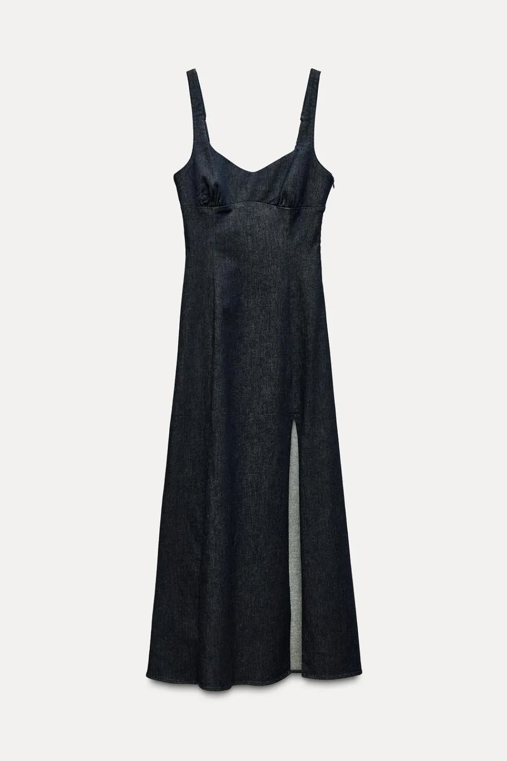 Vestido midi de escote pico y tirantes finos ajustables. Bajo con abertura lateral. Cierre lateral con cremallera oculta en costura.