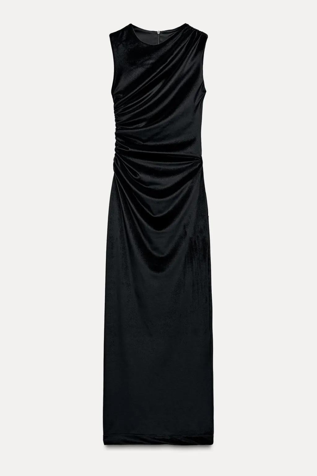 Vestido midi de cuello redondo y manga sisa. Detalle de tejido drapeado. Bajo con abertura en espalda y cierrecon cremallera oculta en costura.