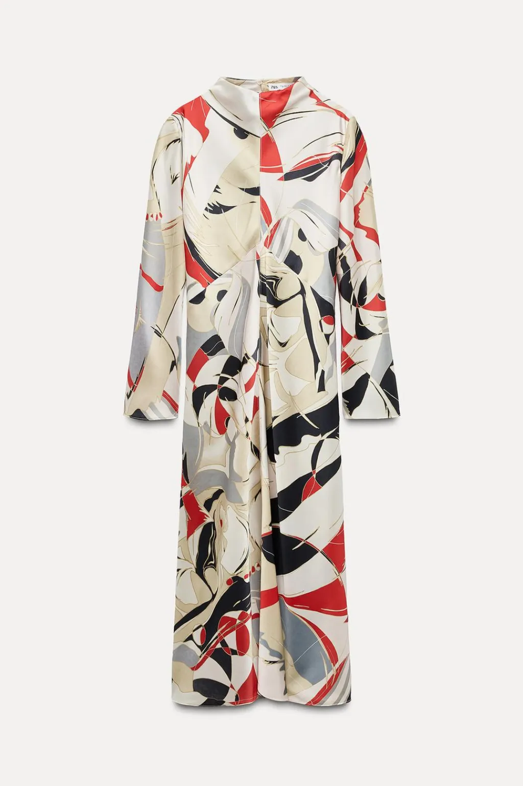 Vestido midi de cuello redondo y manga larga. Bajo acabado en línea evasé. Cierre en espalda con abertura y botón.