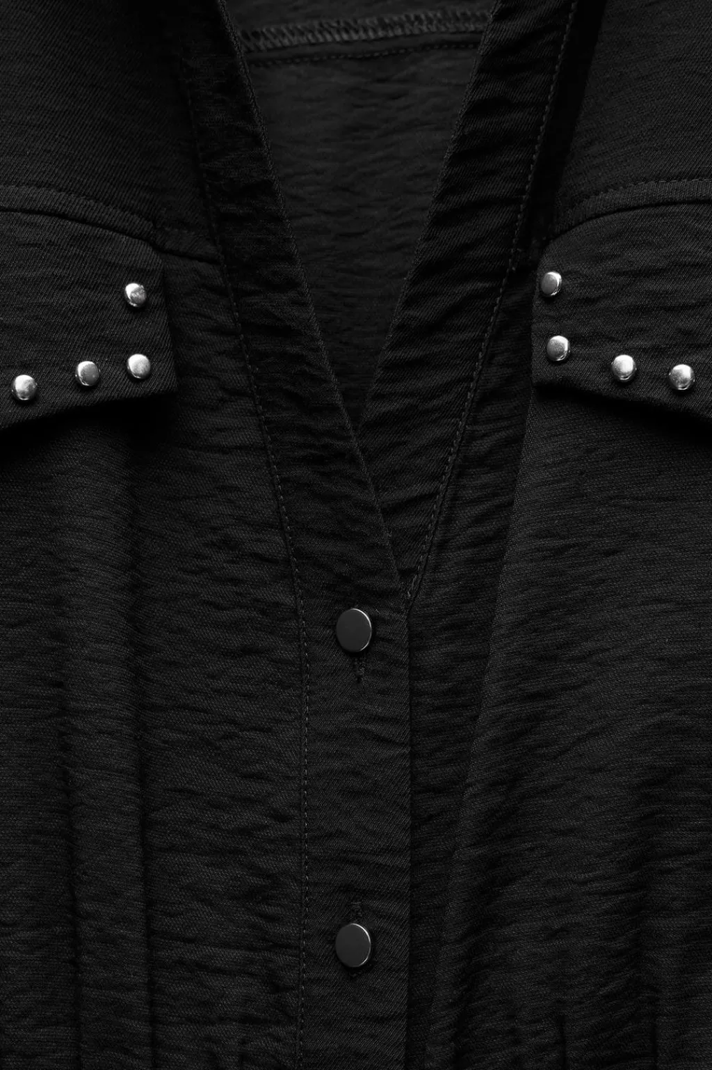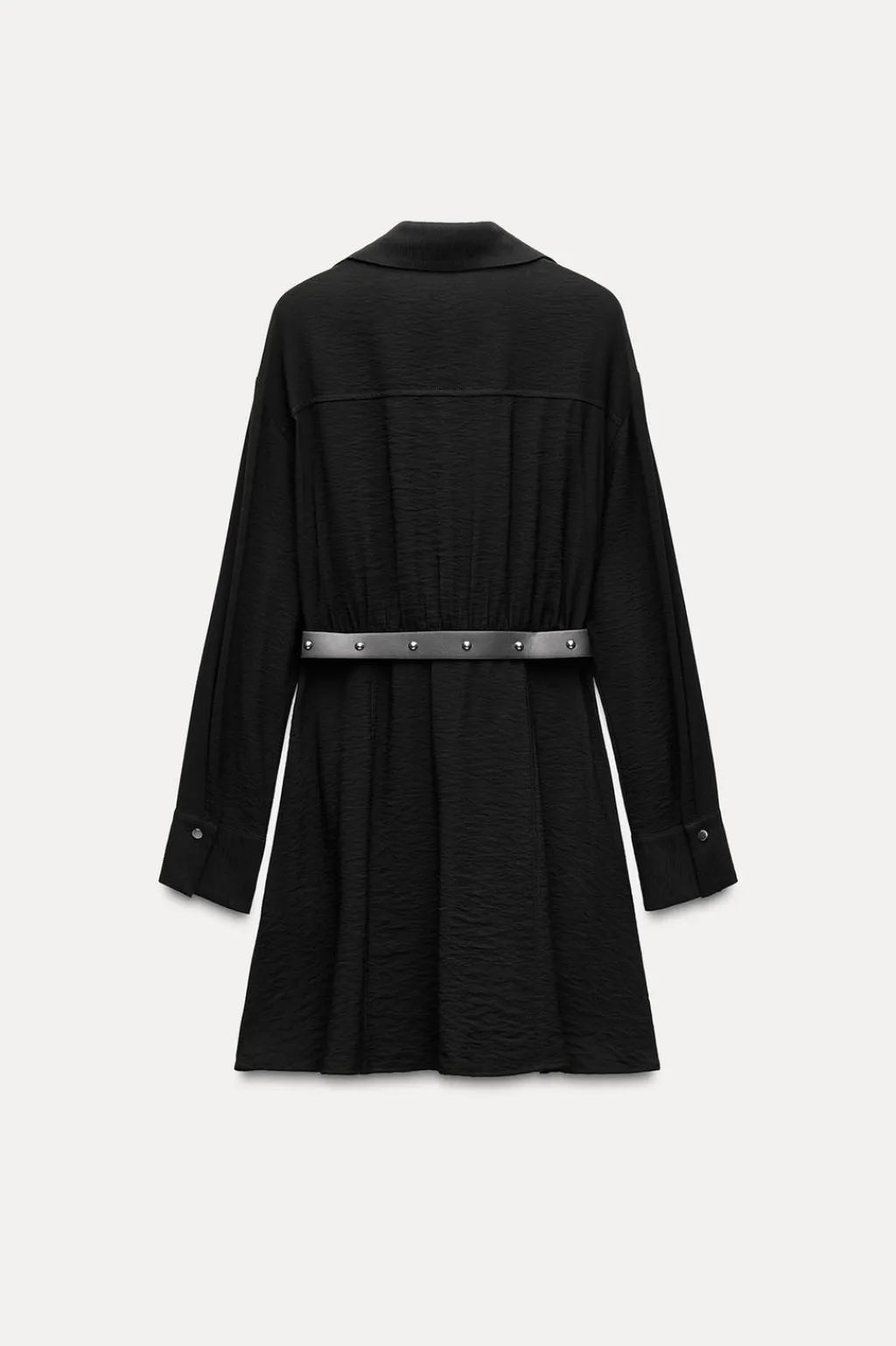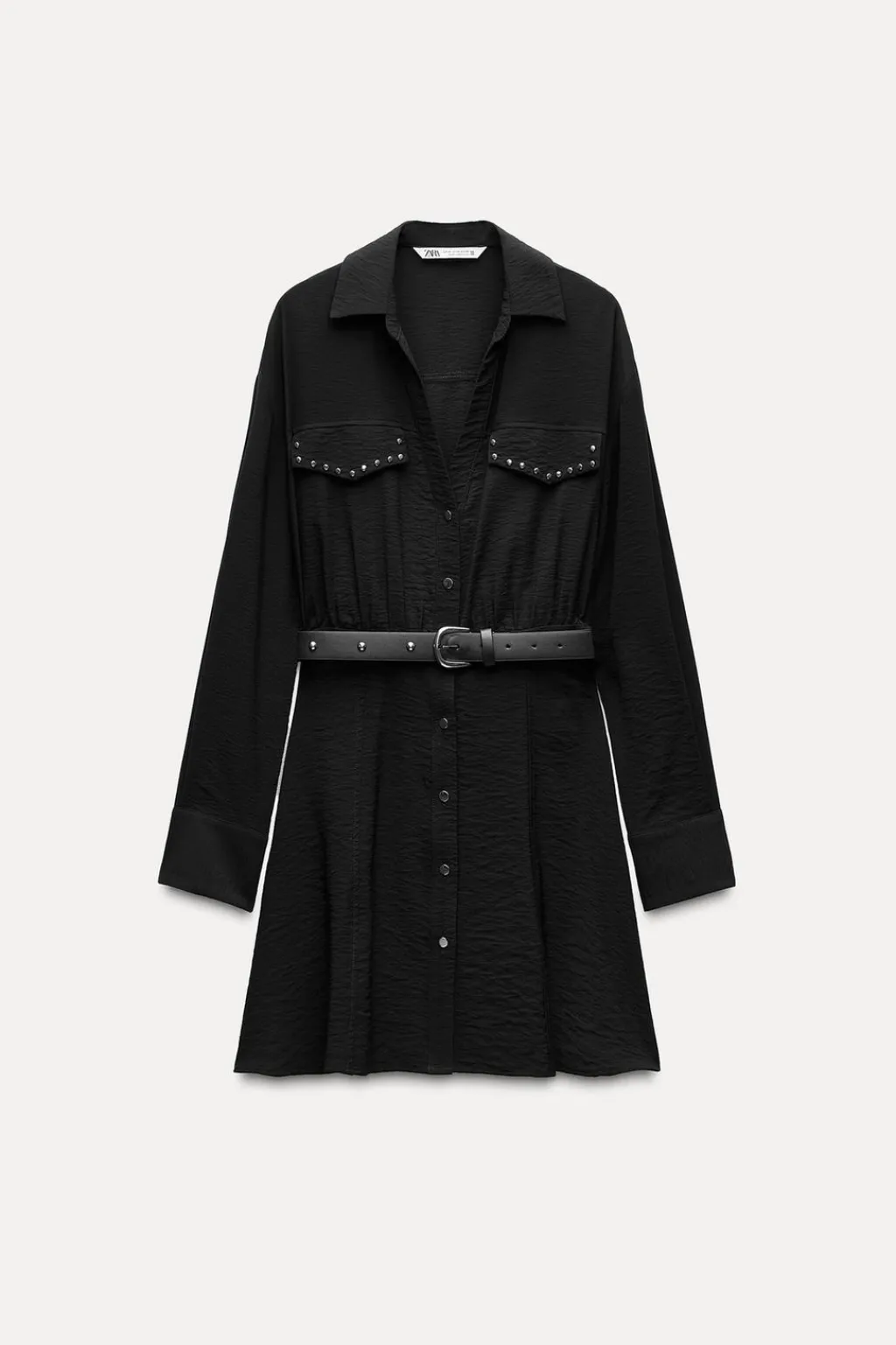 Vestido de cuello solapa con escote pico y manga larga. Detalle de tapetas delanteras con tachas y cinturón. Cierre frontal con botones.