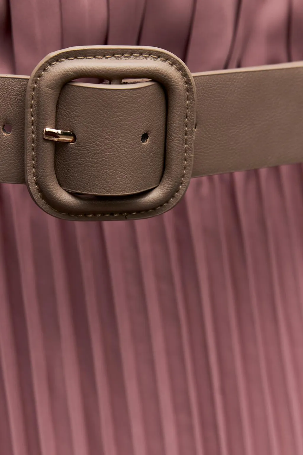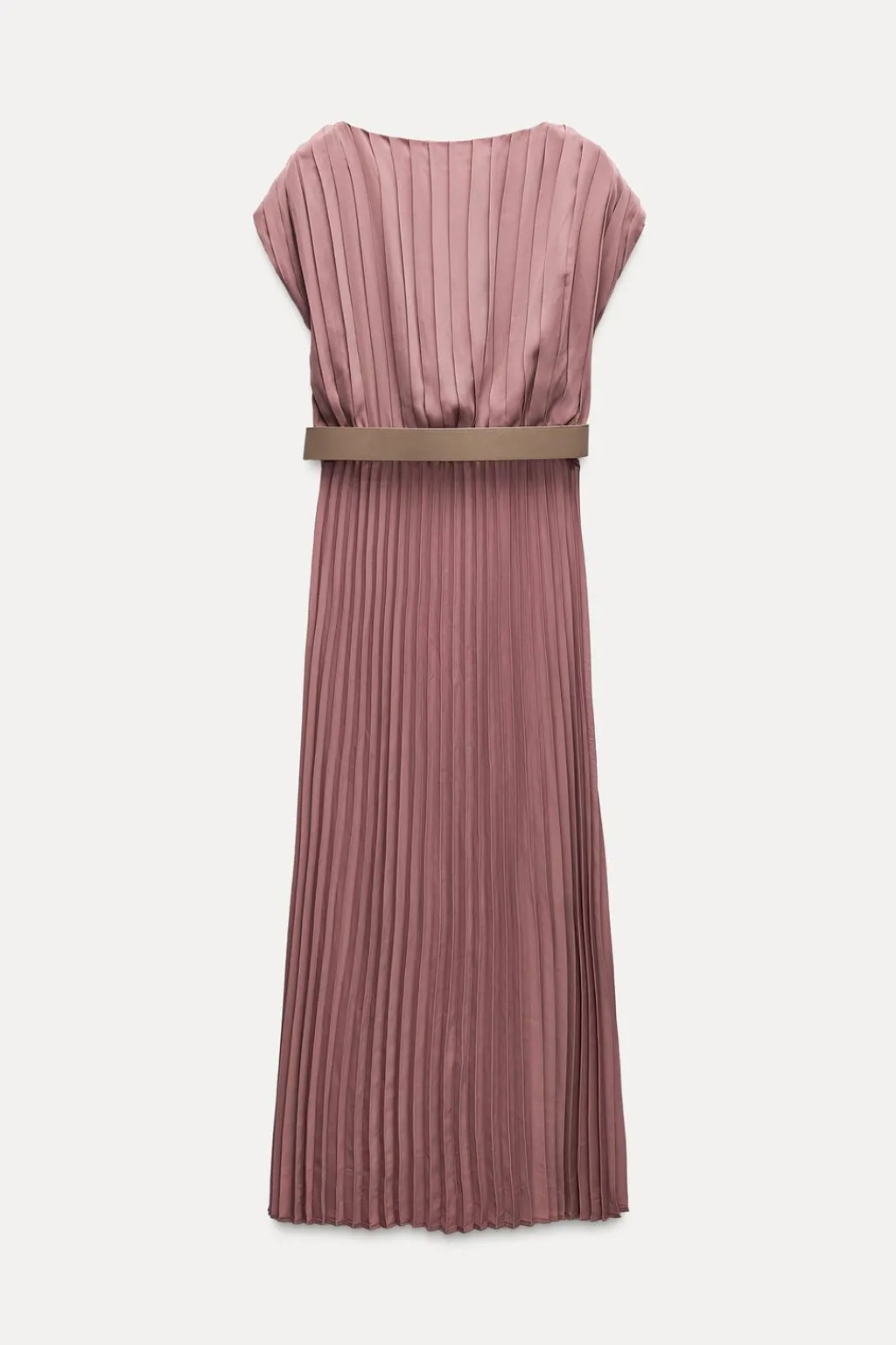 Vestido midi confeccionado en tejido plisado. Cuello barco y manga sisa con detalle de pliegues. Cintura elástica. Cinturón combinado a contraste con hebilla forrada.