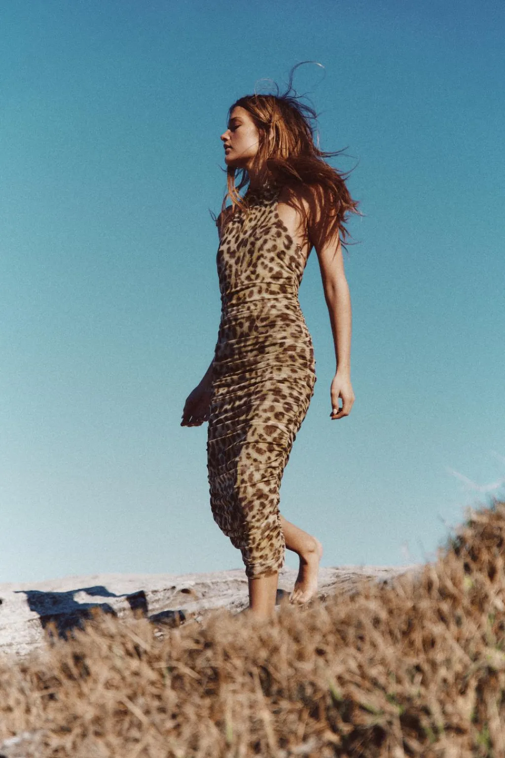 Vestido midi de cuello halter. Espalda descubierta con tira ajustable.Forro interior. Tejido drapeado en laterales.
