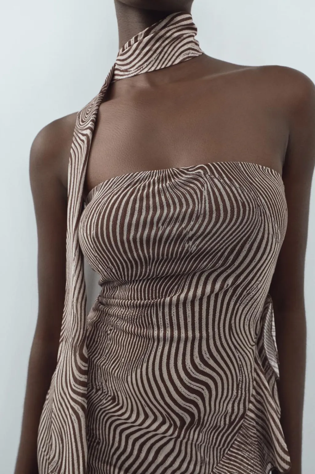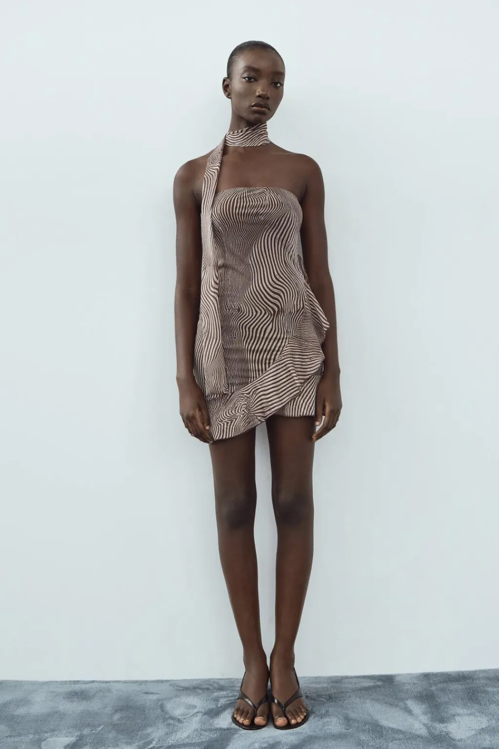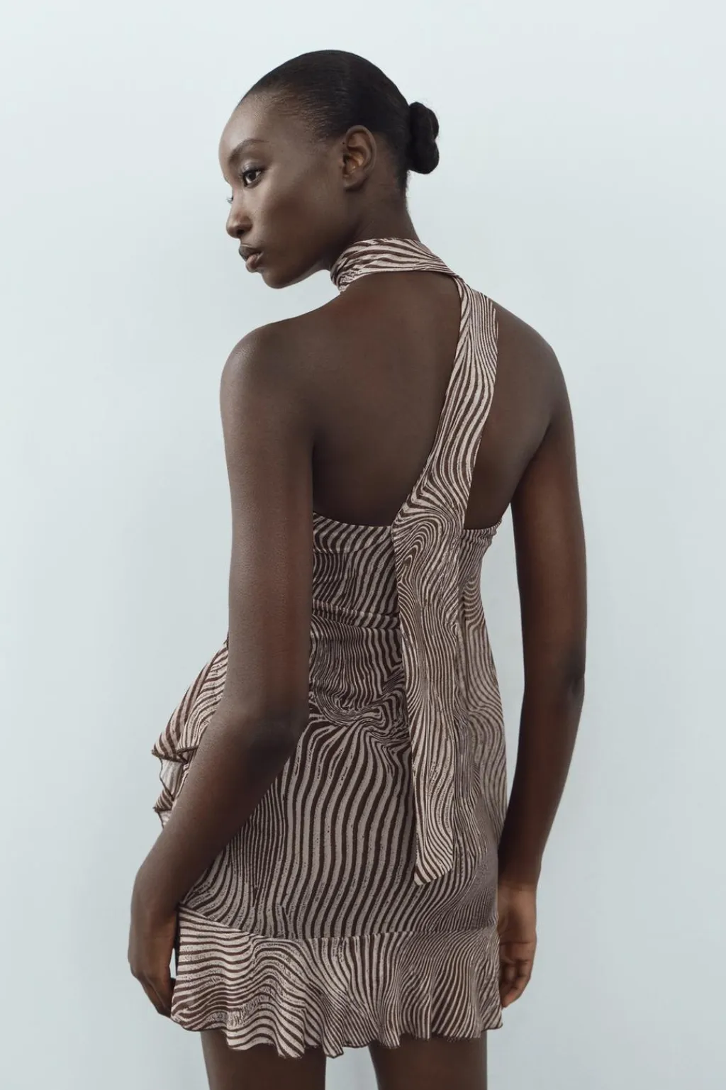 Vestido corto de escote recto y hombros descubiertos. Detalle tipo foulard en mismo tejido. Bajo acabado en volantes.
