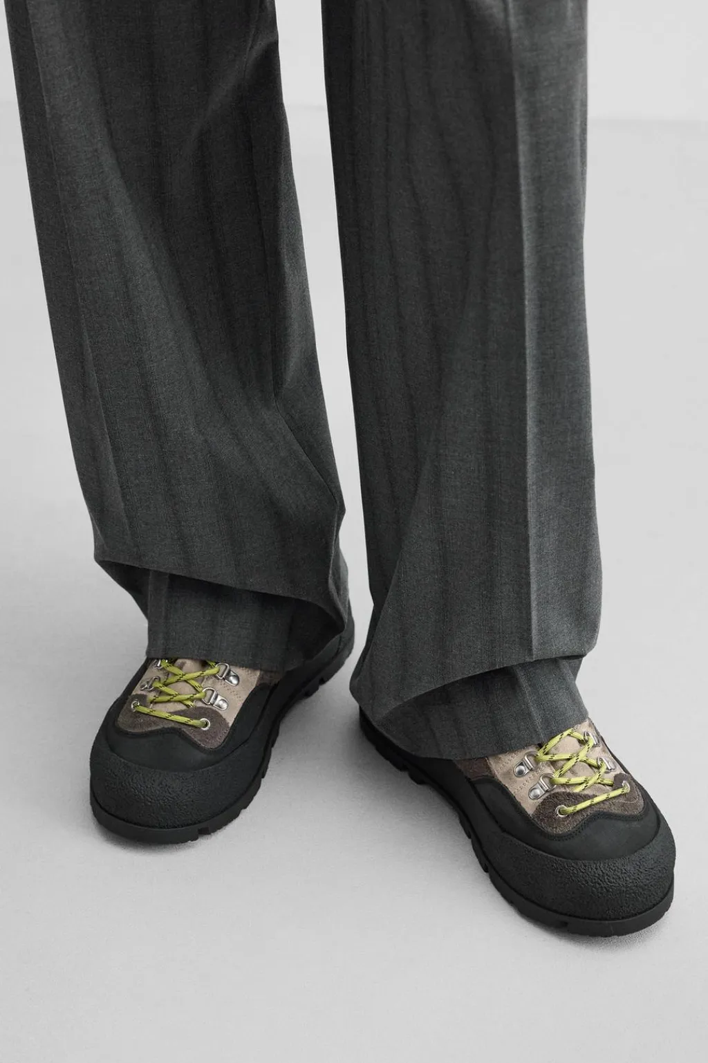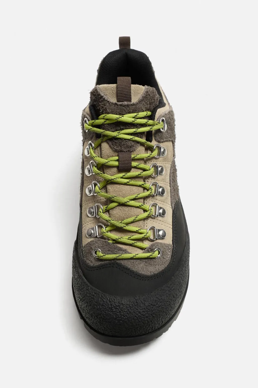Zapatilla con cordones. Combinación de piezas de piel con otros materiales en el corte. Cordonera con siete pasados. Tirador trasero para facilitar el calce. Suela con volumen. Diseño de inspiración trekking.