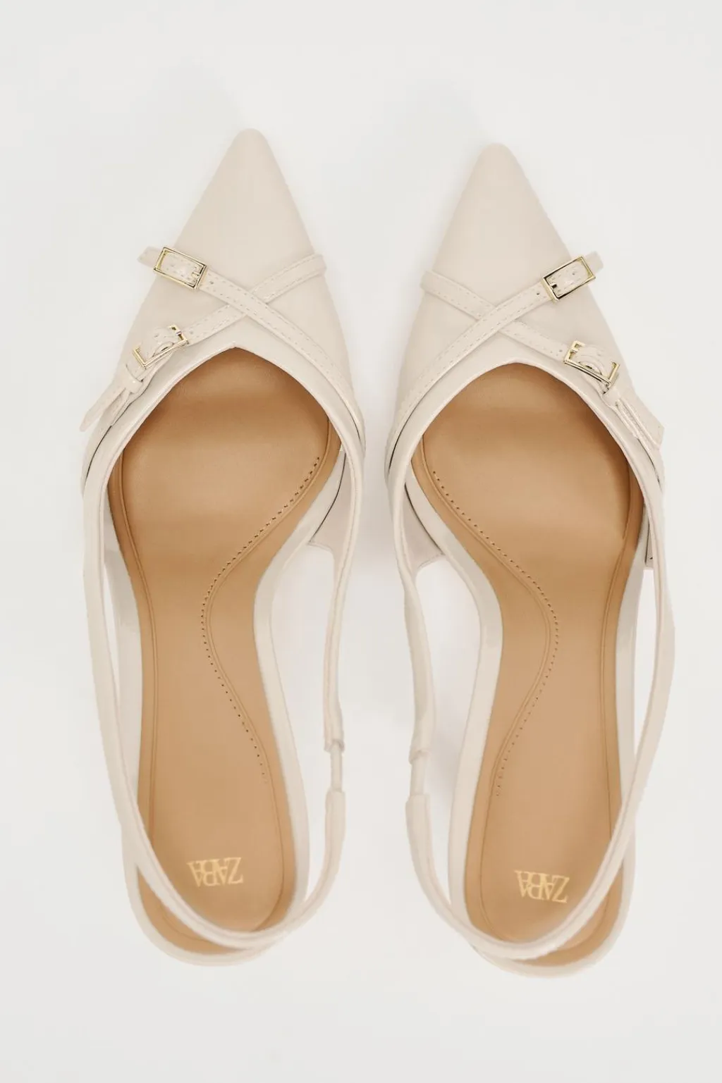 Zapato de tacón destalonado con efecto acharolado. Tiras finas con hebillas en la parte delantera. Tira trasera. Acabado en punta.