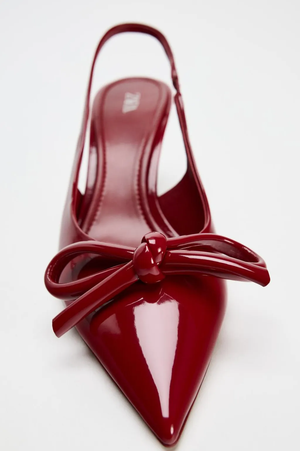 Zapato tacón destalonado acharolado. Detalle de lazo en la parte delantera. Tacón fino.Acabado en punta. Tira trasera con elástico.