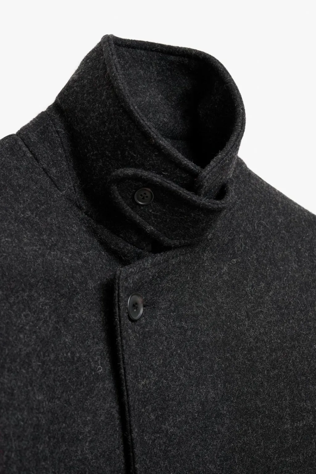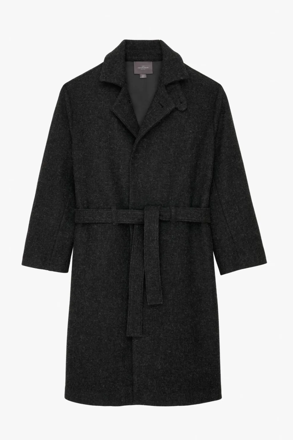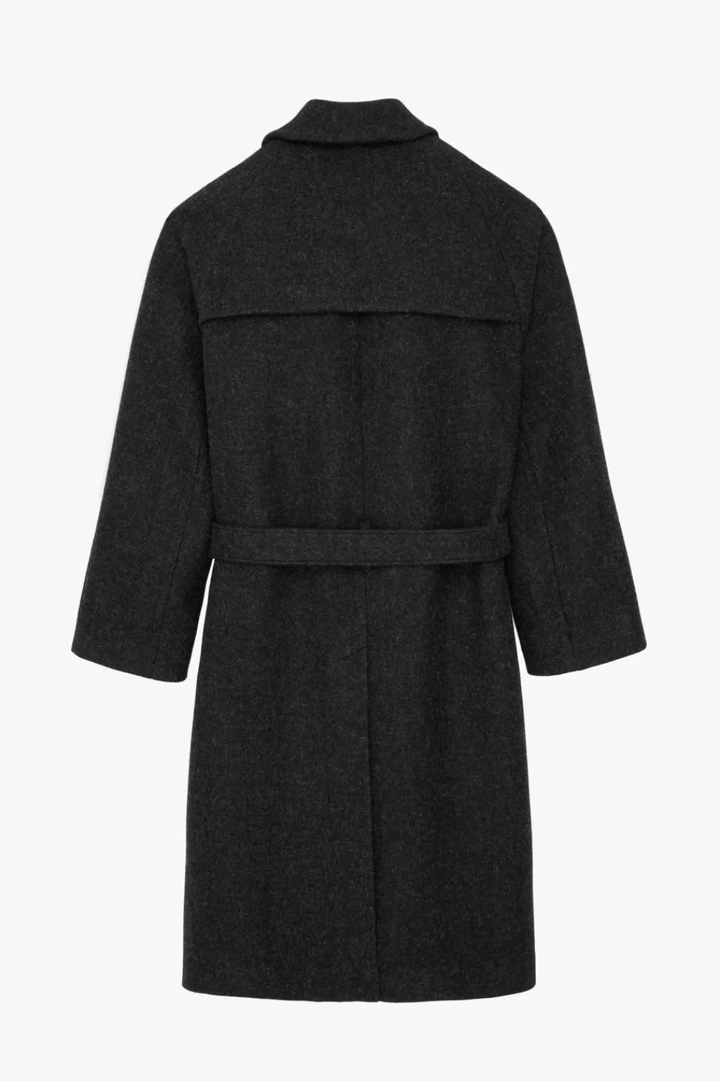 Abrigo relaxed fit confeccionado en tejido con mezcla de lana. Cuello con solapas de muesca y manga larga. Bolsillos de vivo en cadera y detalle de bolsillo interior. Cinturón del mismo tejido en cintura. Bajo con abertura en centro espalda. Cierre frontal de botonadura oculta por solapa.