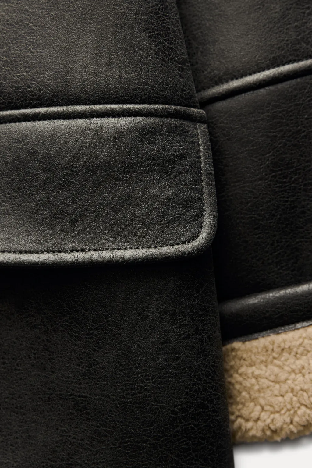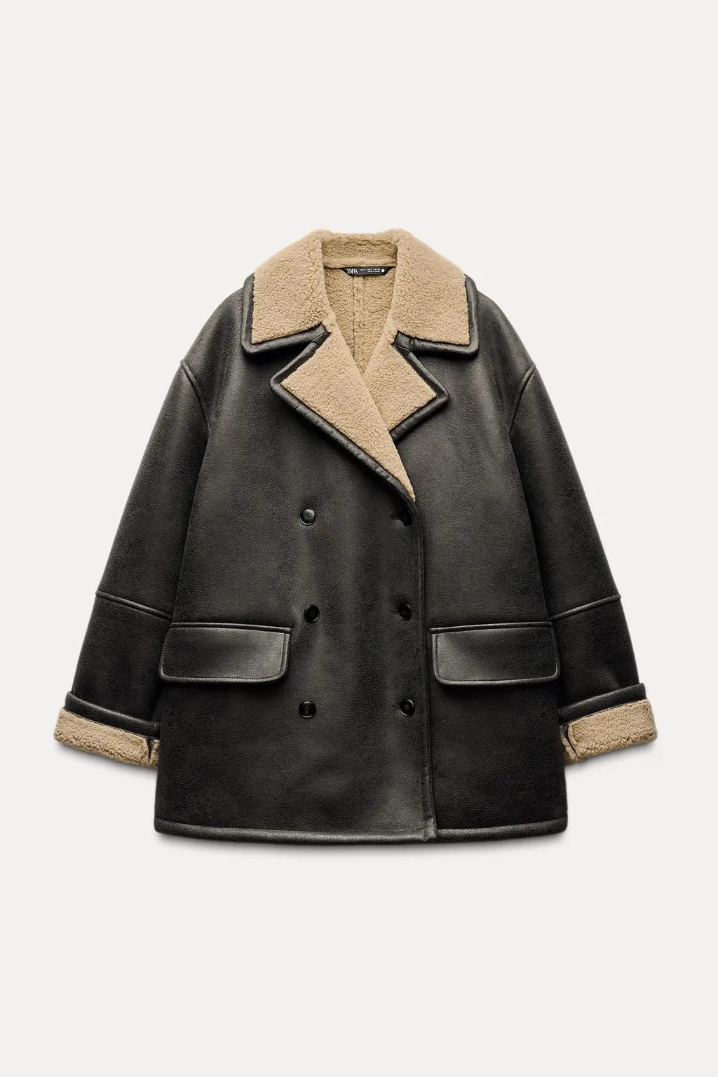 Abrigo con cuello solapa de muescas y manga larga. Bolsillos con solapa en delantero. Interior en borreguillo combinado a contraste. Cierre frontal cruzado con botones.