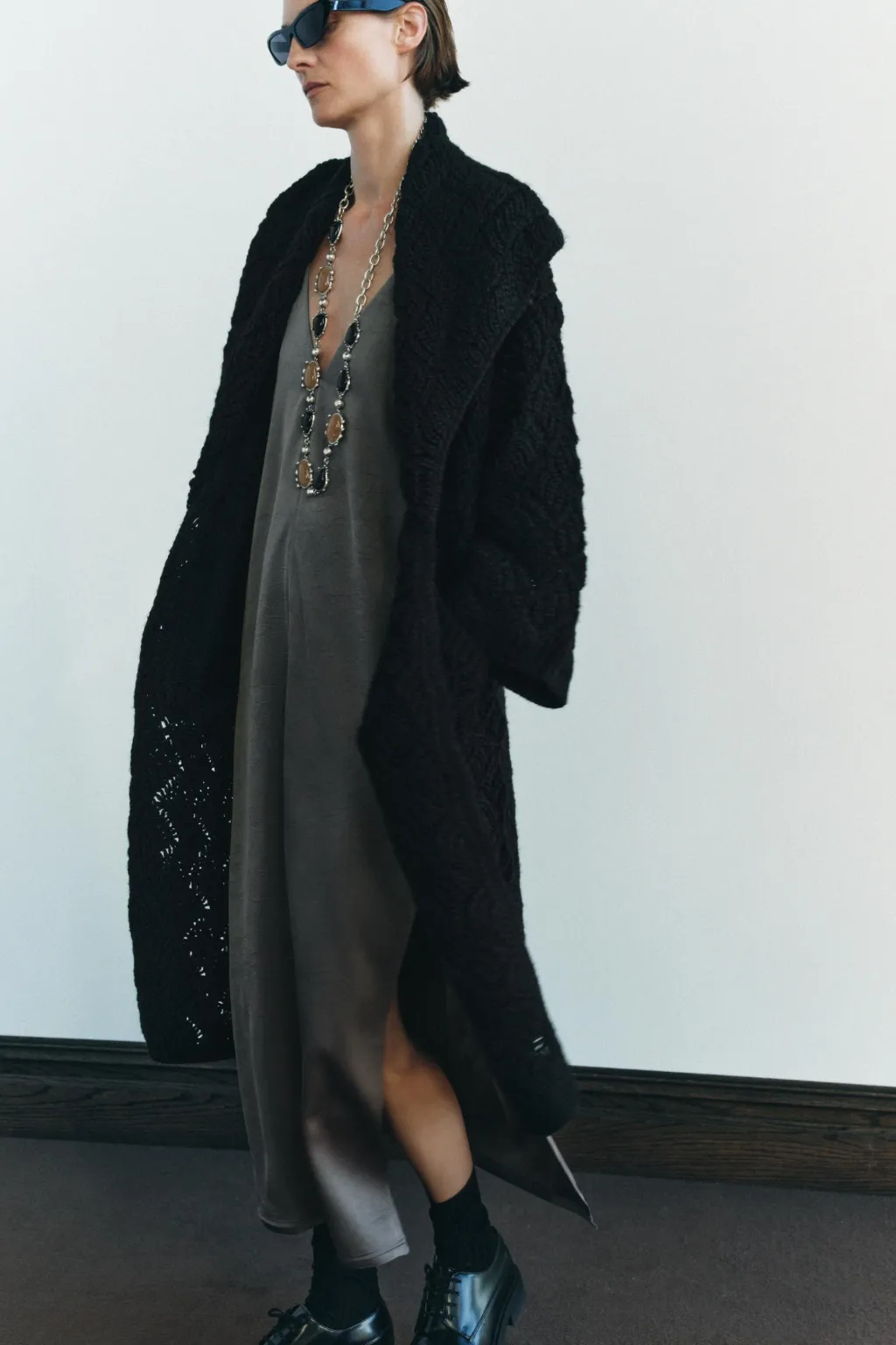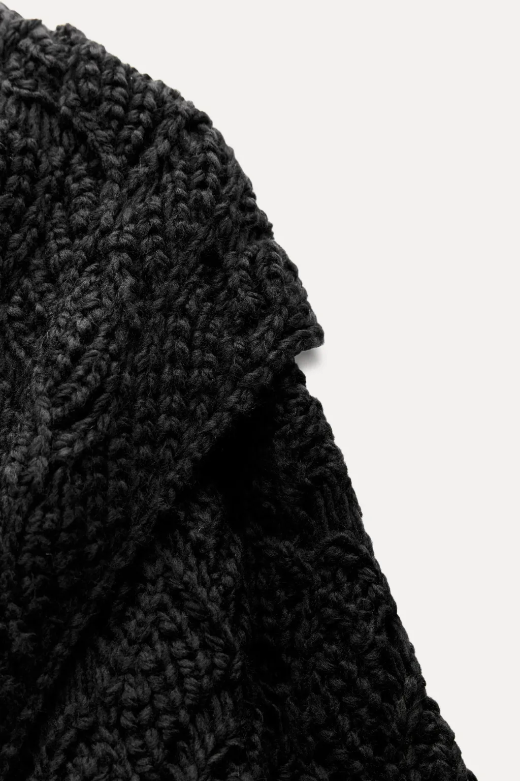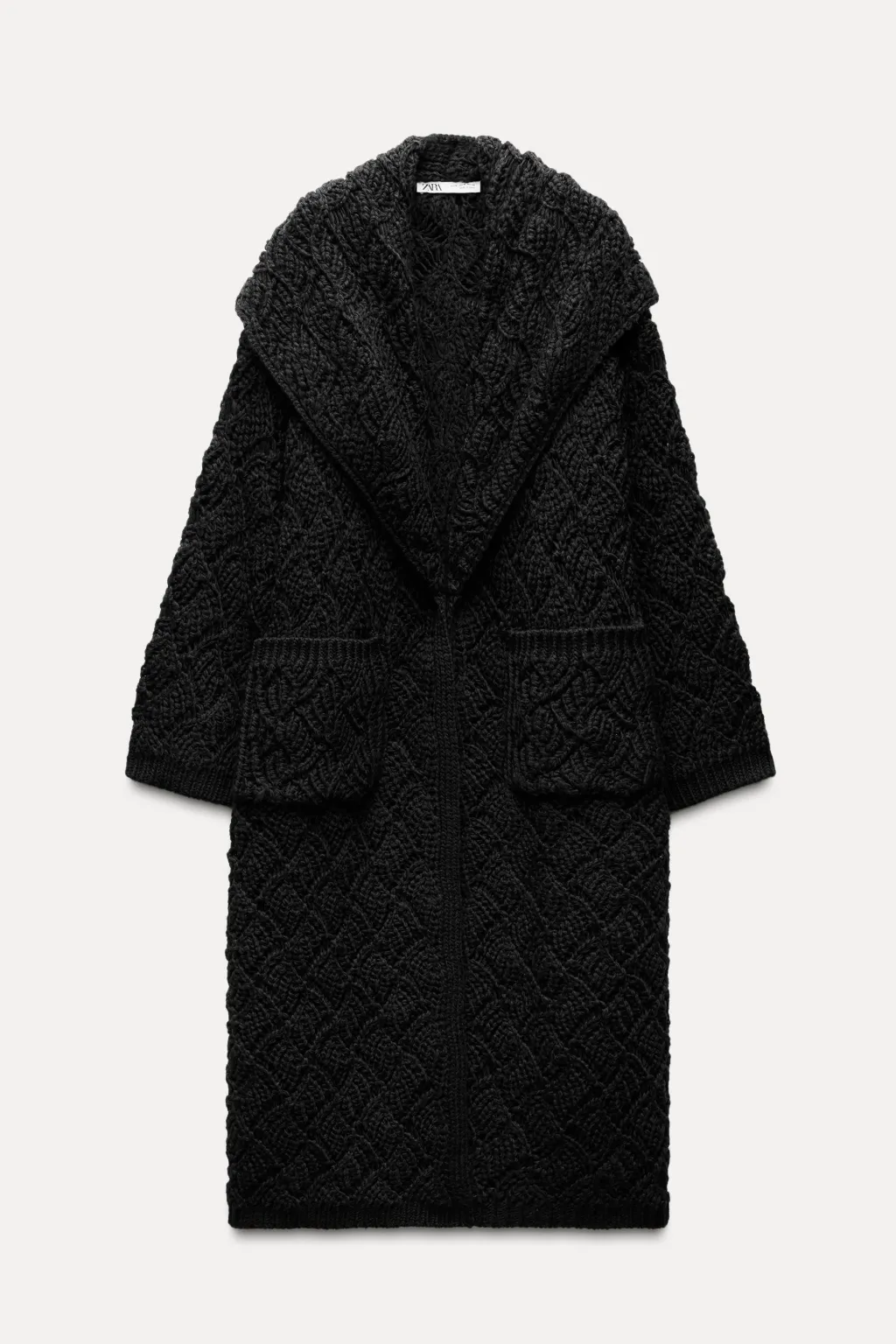 Abrigo abierto de cuello con solapa ancha y manga larga. Detalle de tejido con estructura. Bolsillos delanteros de plastrón.