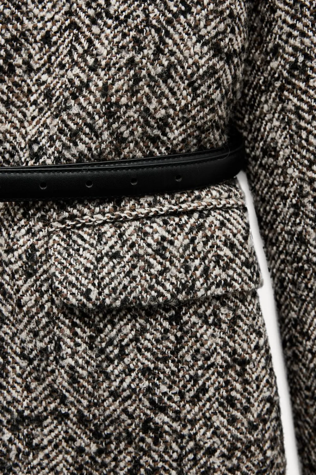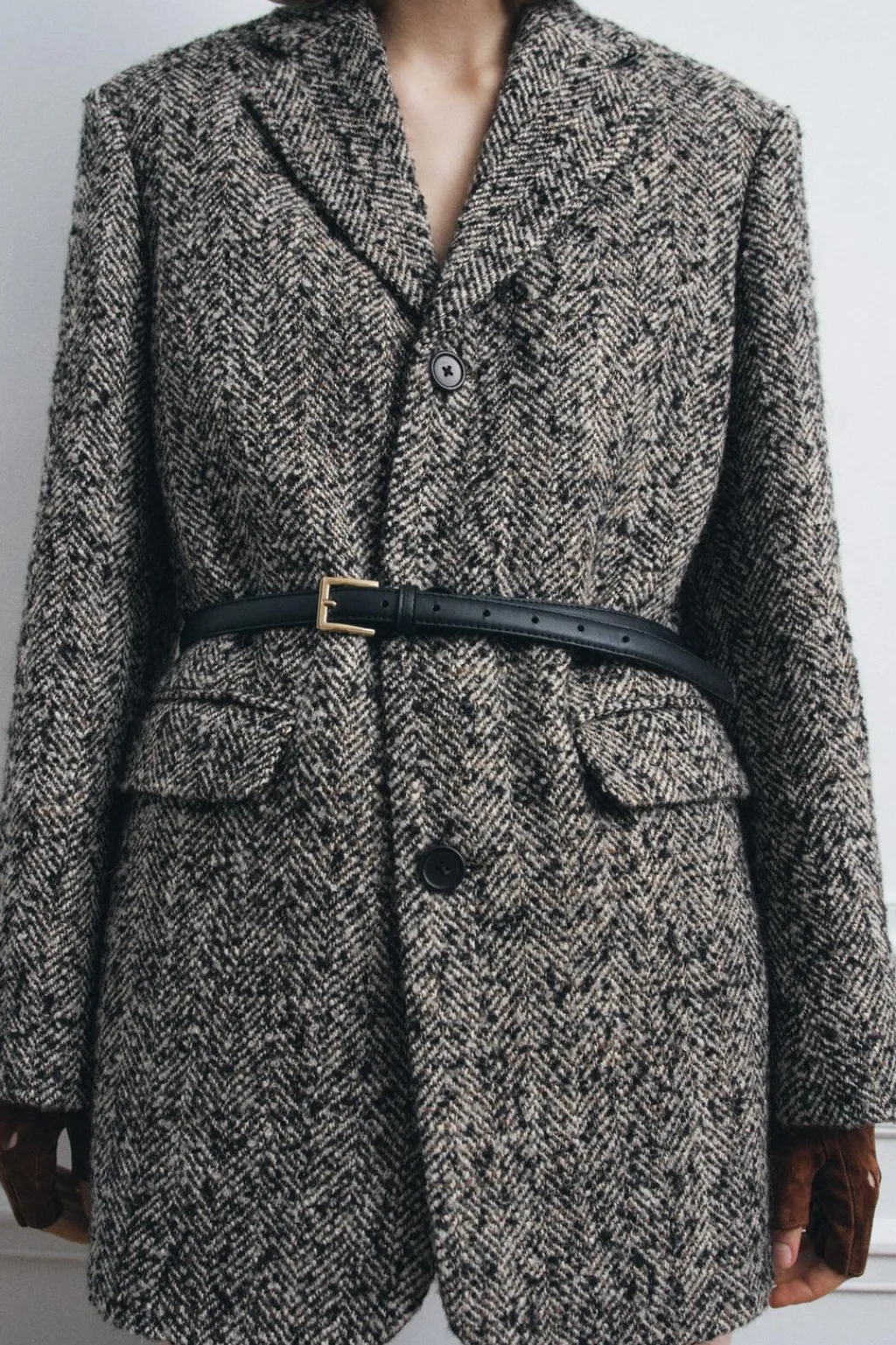 Blazer oversize confeccionada en hilatura con lana 20%. Cuello solapa de muescas y manga larga acabada en abertura y botones. Bolsillos con solapa en delantero y de vivo en pecho. Cinturón ajustable con hebilla metálica. Forro interior a tono. Cierre frontal con botones.