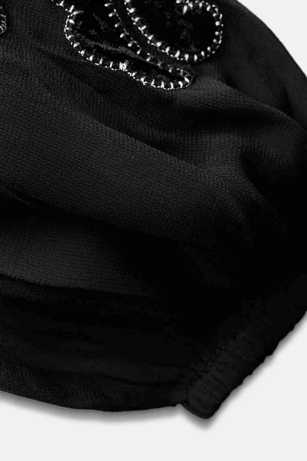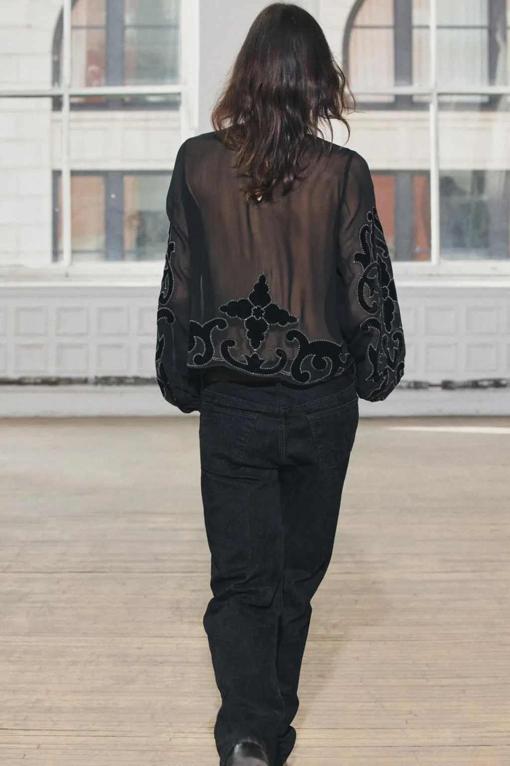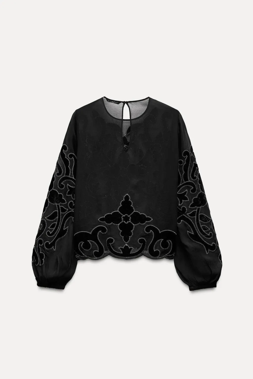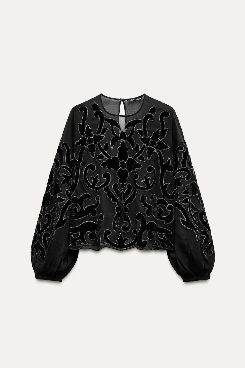 Blusa confeccionada en hilatura de viscosa. Cuello redondo y manga larga abullonada acabada en elástico. Detalle de bordados en terciopelo. Cierre en espalda con abertura y botón.