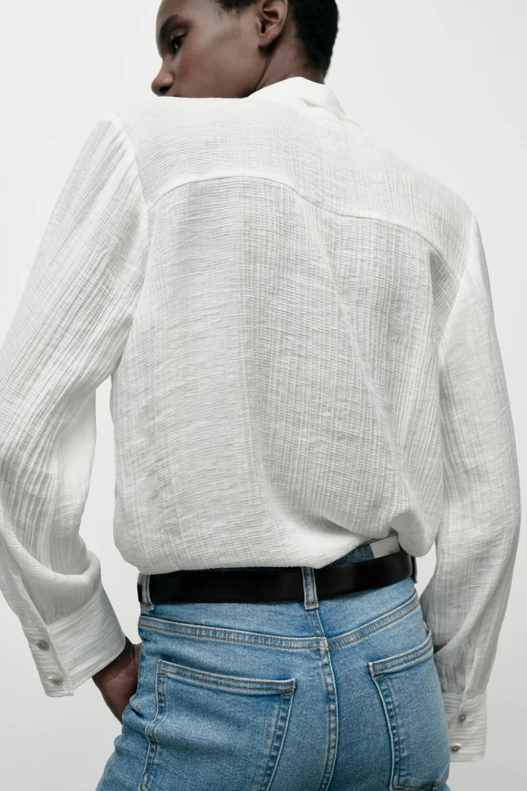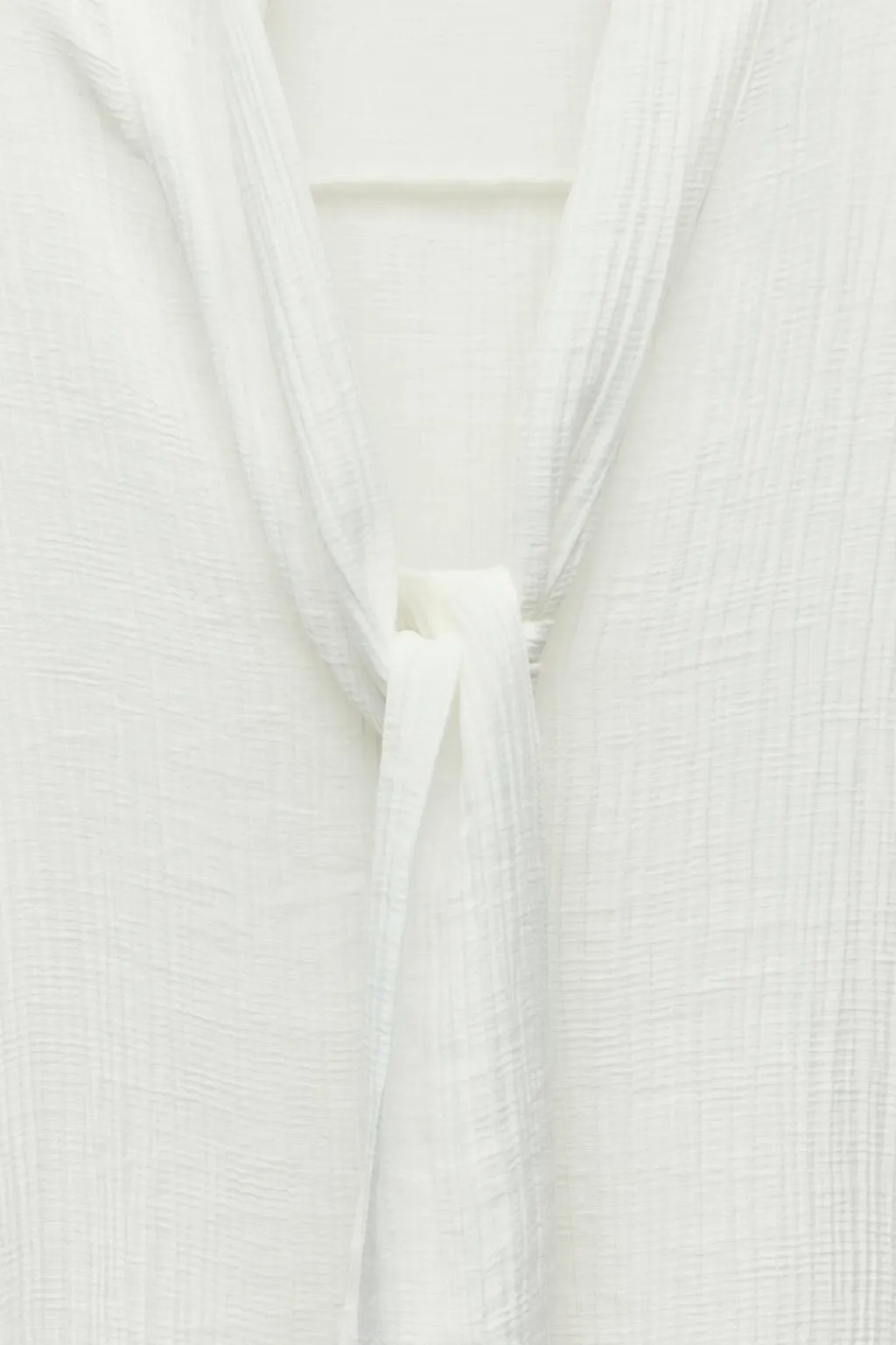 Blusa de escote pico con solapa y lazo. Manga larga. Detalle de tejido efecto arrugado. Cierre frontal con botones.