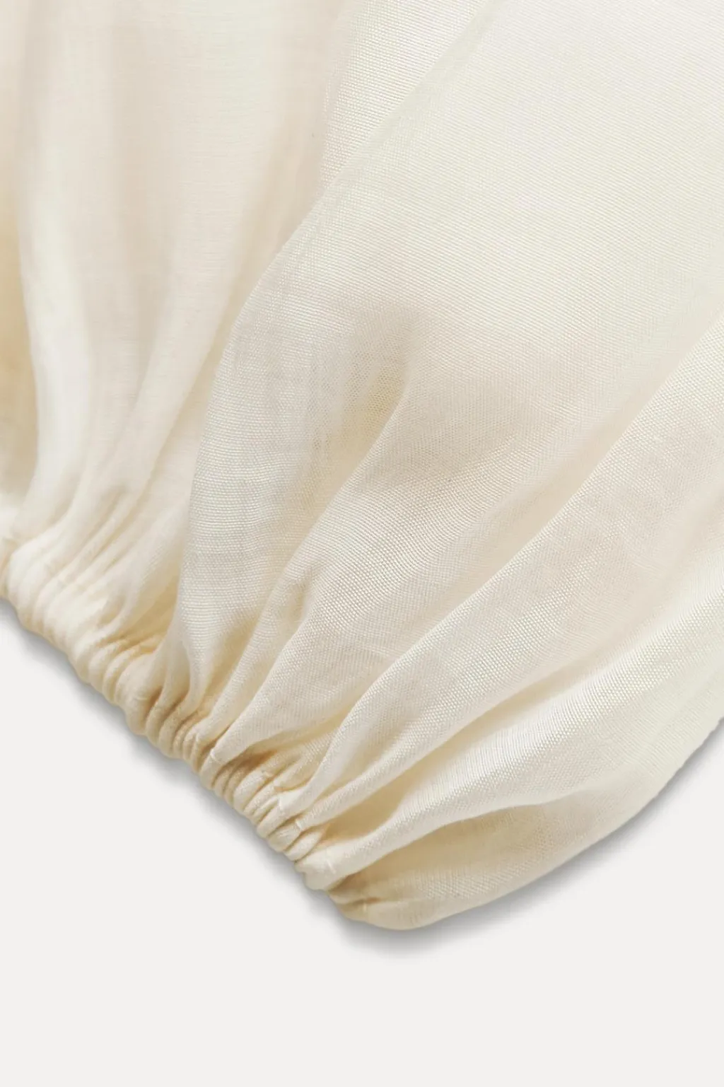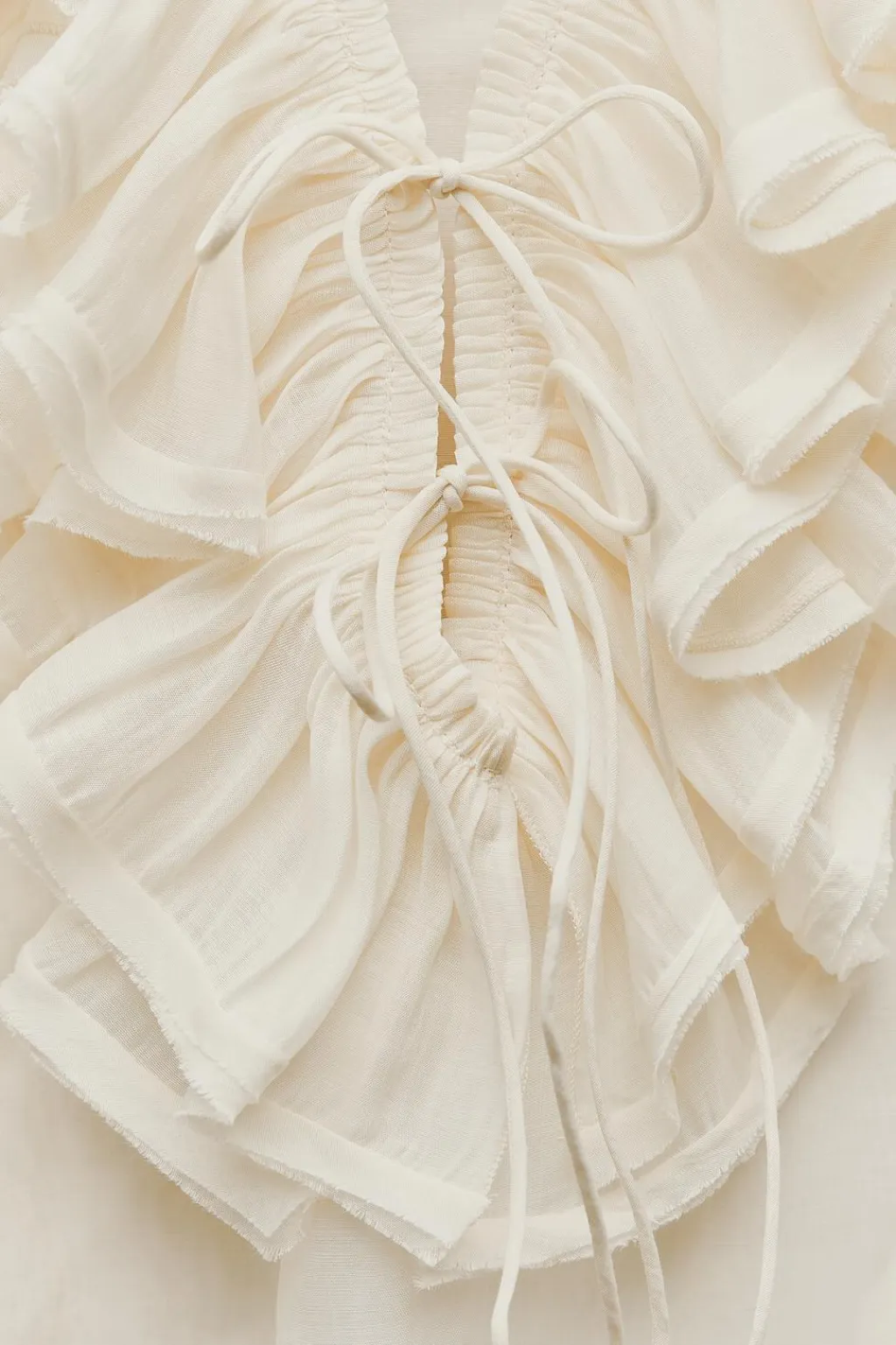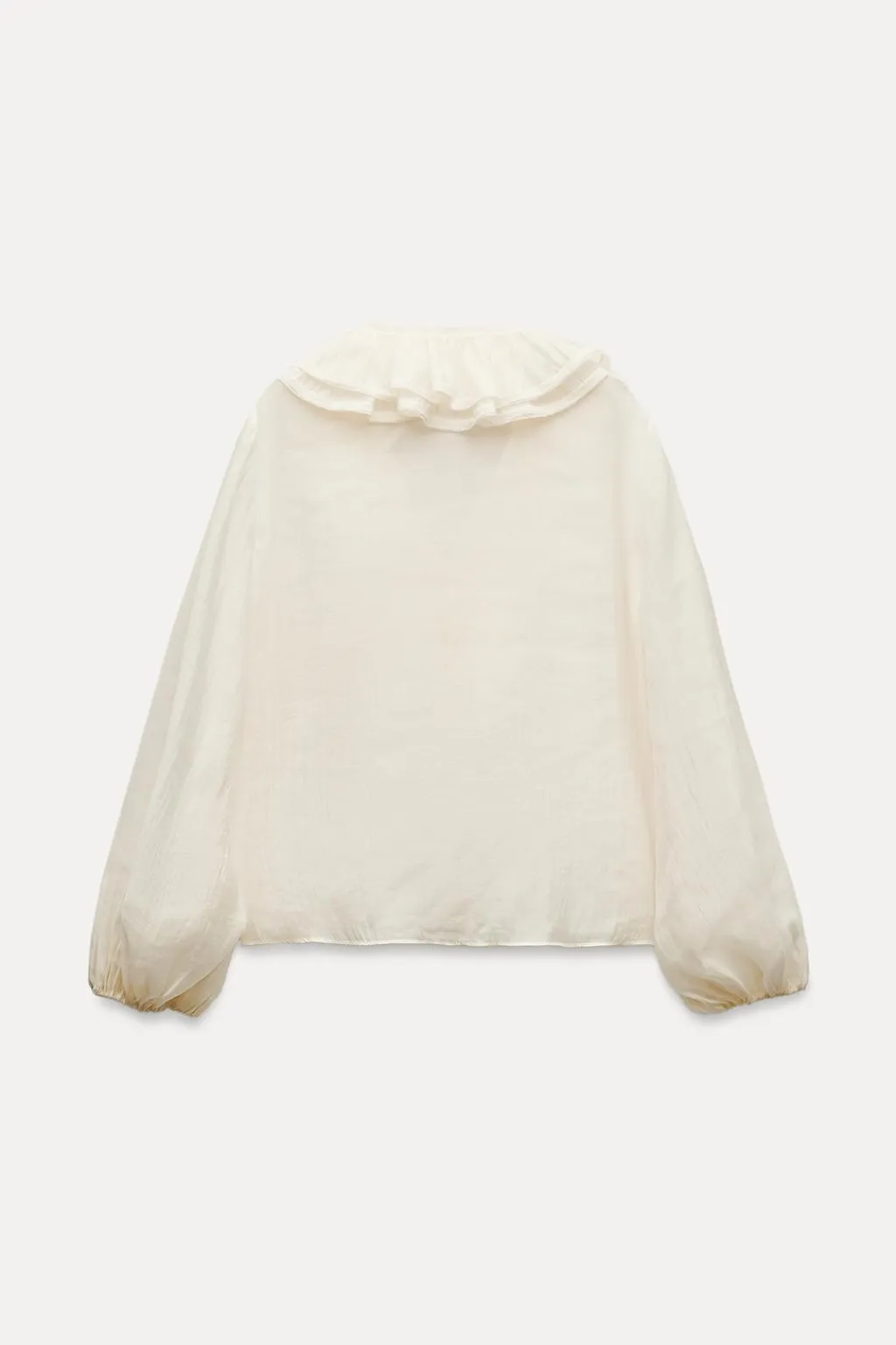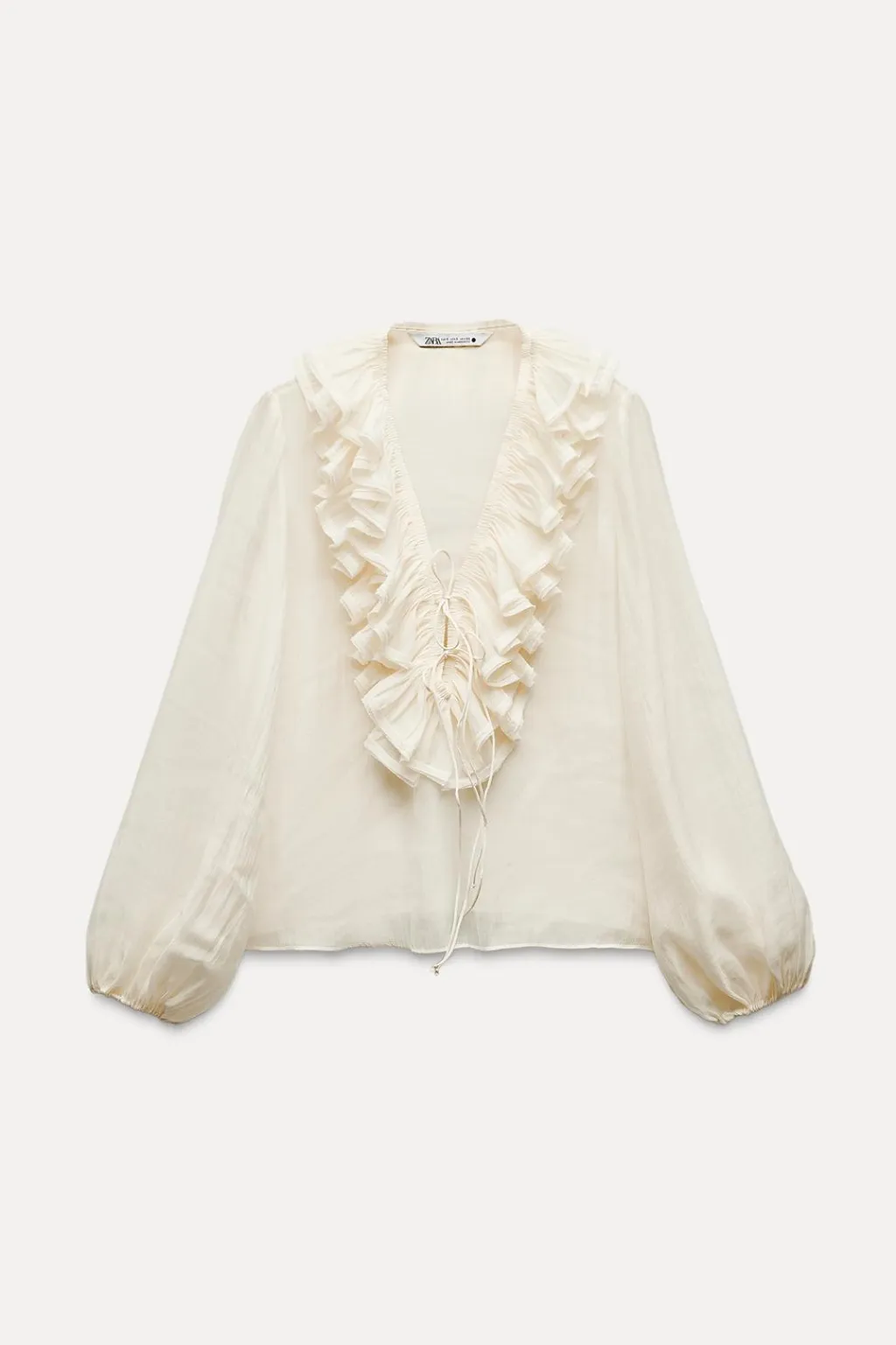 Blusa confeccionada en hilatura con mezcla de lyocell. Escote pico ajustable con cordones y manga larga con volumen acabada en elástico. Detalle de volantes en mismo tejido.